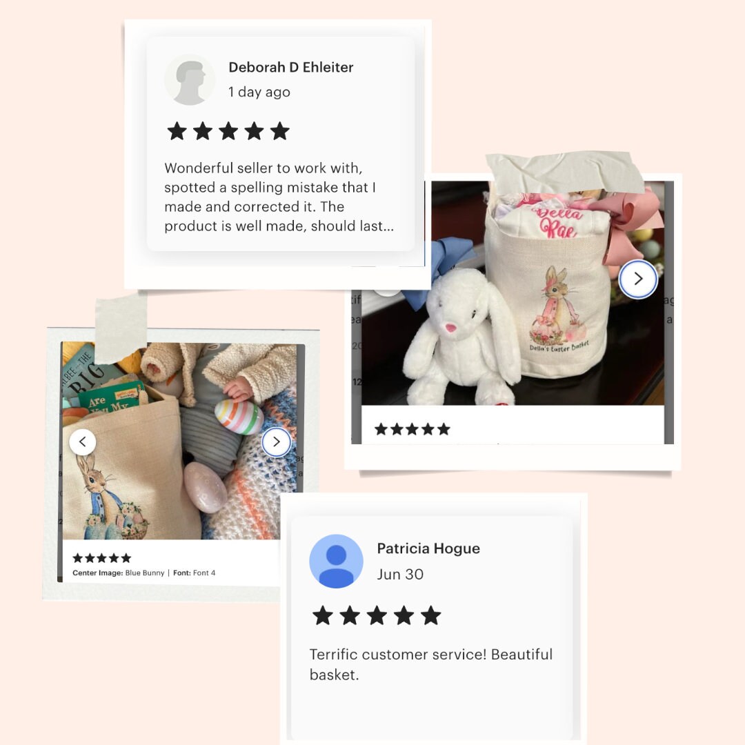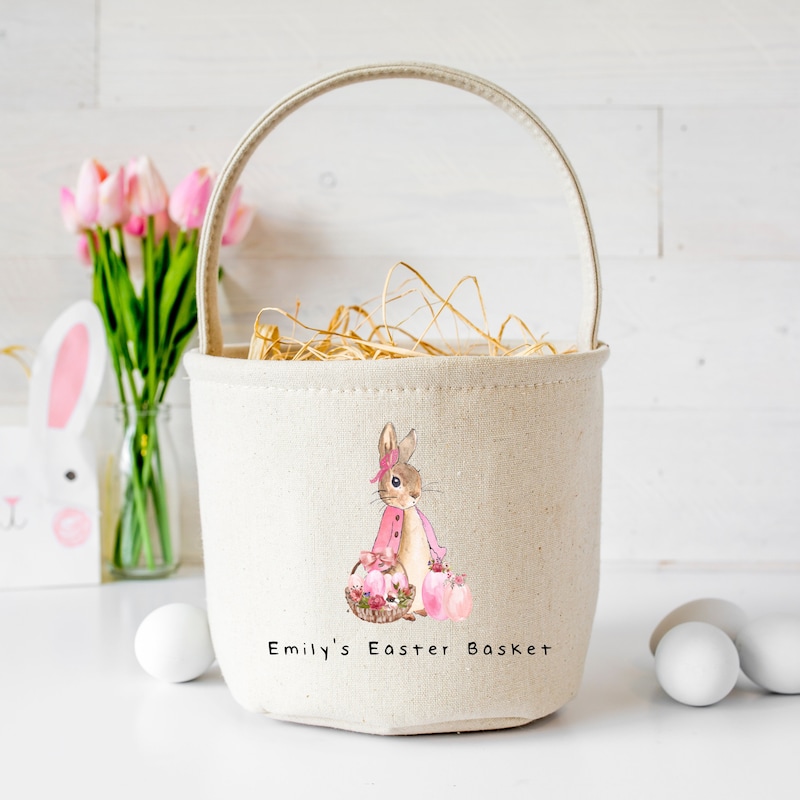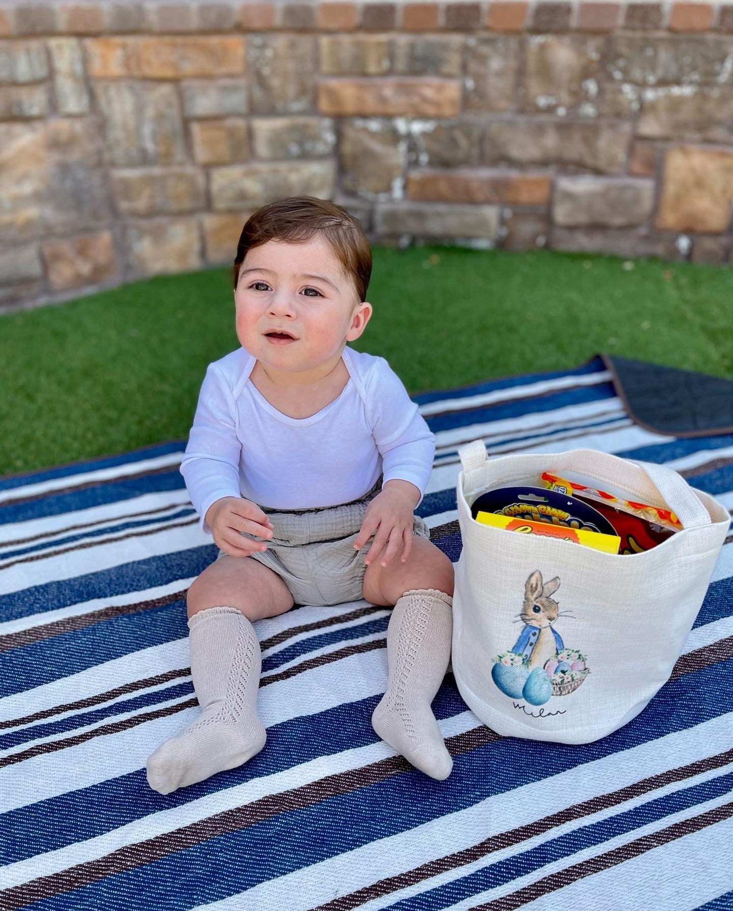 Customize an Easter Basket! The perfect gift for a first Easter, or first time celebrating together, or to have a memorable family gathering. The basket is functionable for holding gifts Easter morning, or for an Easter egg hunt, or other creative uses. The ink transfered image will last without cracking or fading for this item to be folded away as a meaningful keepsake.