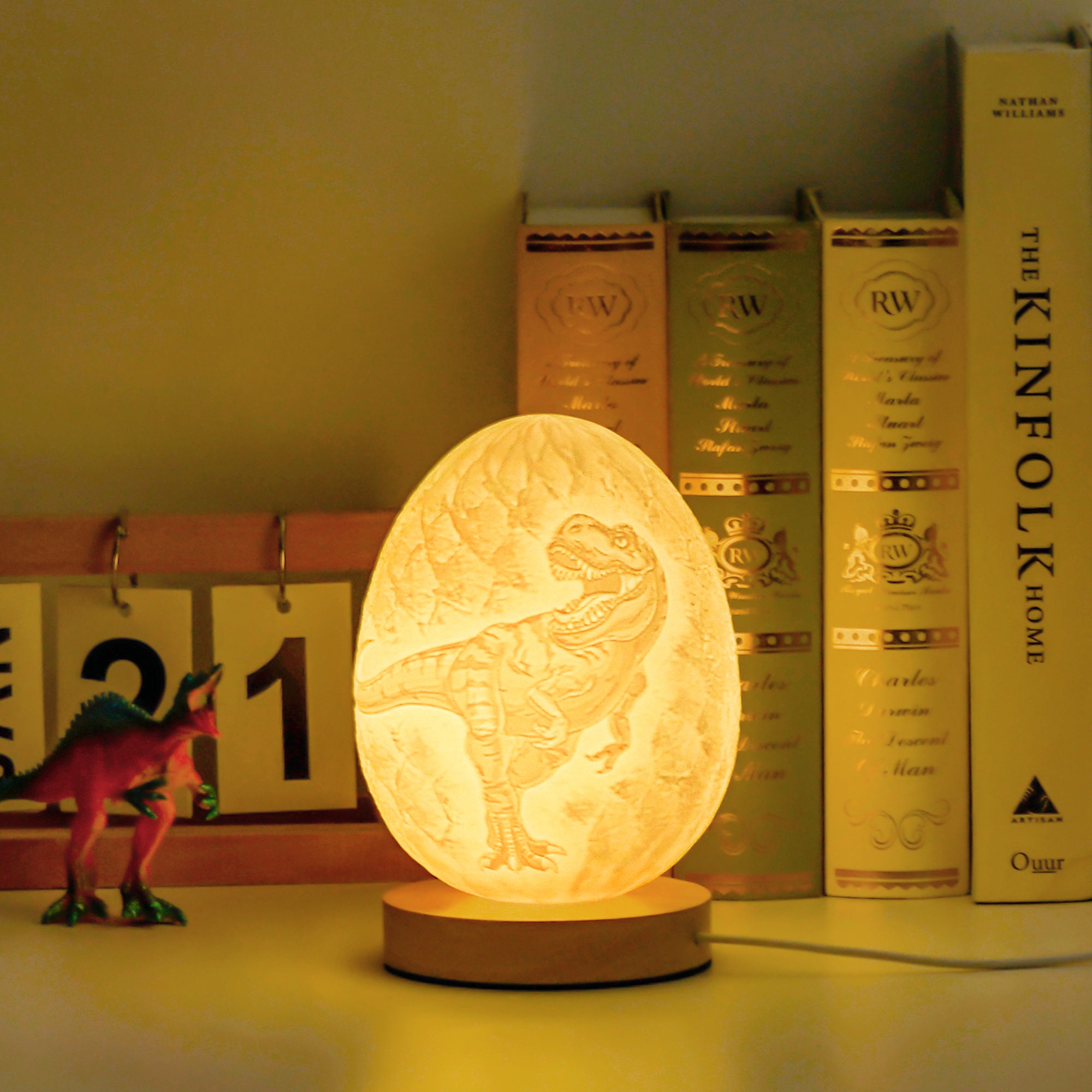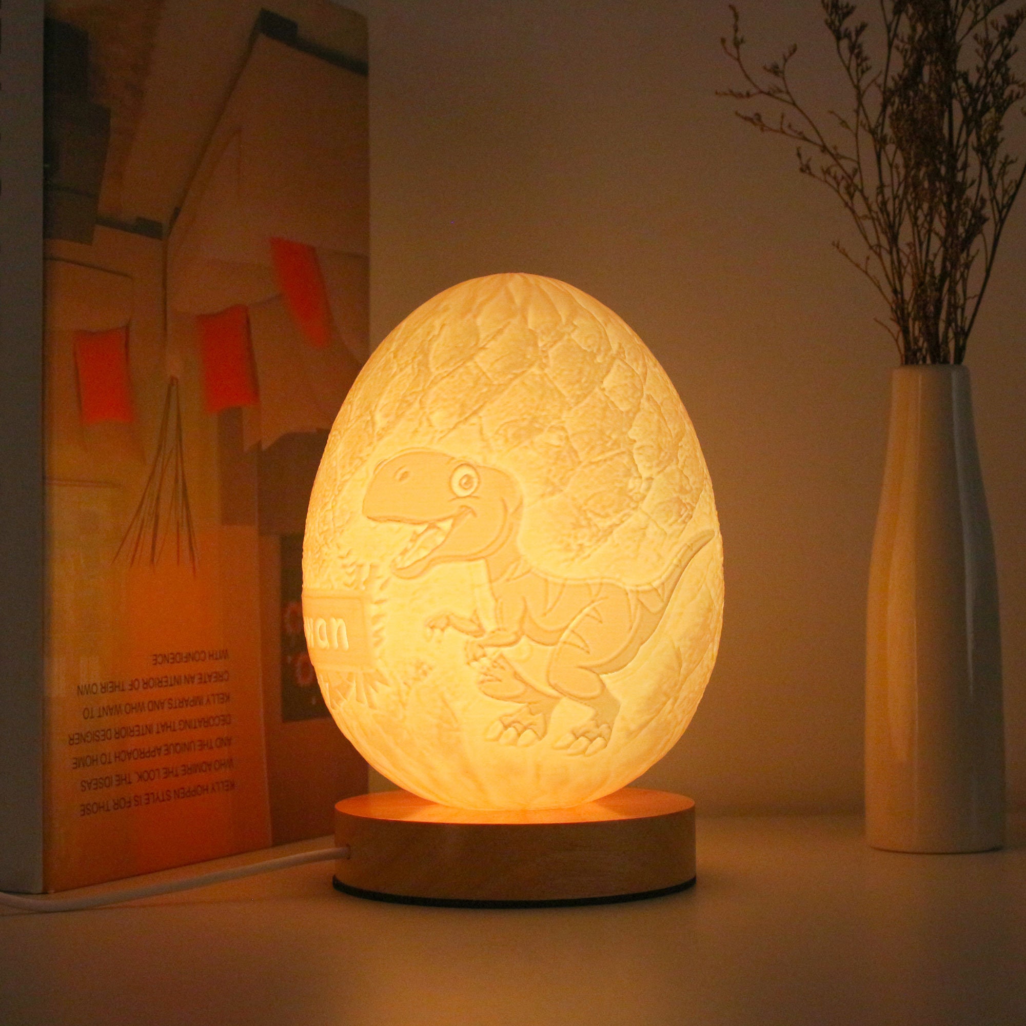 Introducing our Dinosaur Egg Lamp – a unique and enchanting addition to your space. Crafted with intricate attention to detail, this lamp resembles a dinosaur egg, complete with lifelike patterns. Its shell is meticulously 3D printed, featuring a dual-sided design. One side showcases the realistic image of an adult dinosaur, while the other side displays a delightful cartoon representation of a young dinosaur.