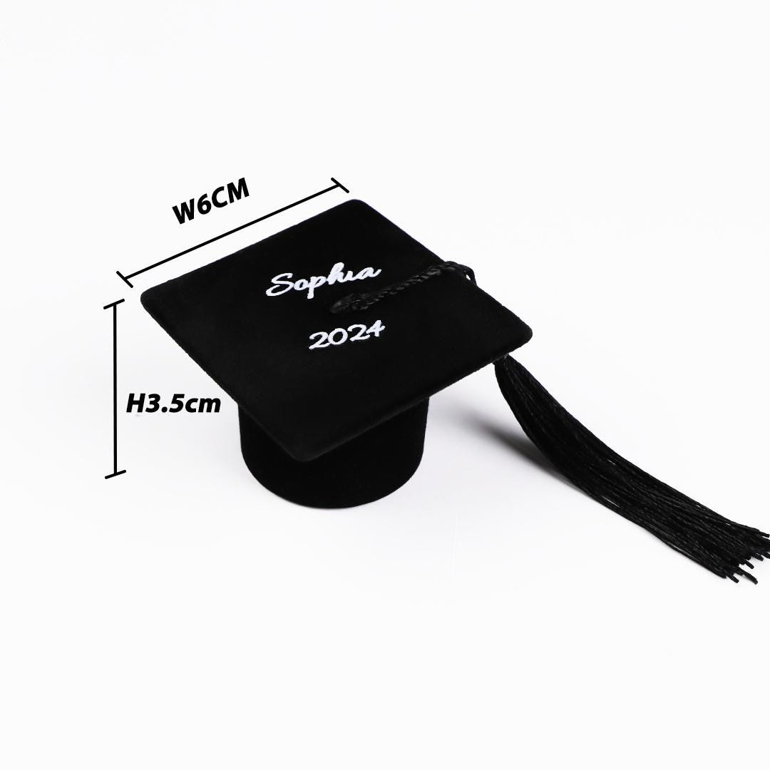The ring box features a stylish graduation cap design, symbolizing the graduate's hard work and success. It adds an atmosphere of graduation and serves as a reminder of their remarkable accomplishment. Made to hold precious memories, this box can be engraved with a name or special message. Preserve the milestone of graduation with this unique and thoughtful gift.