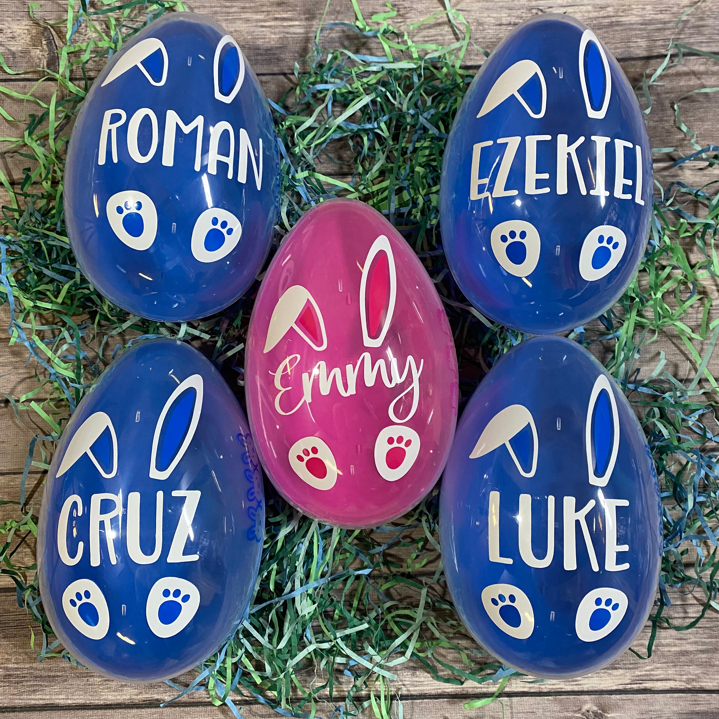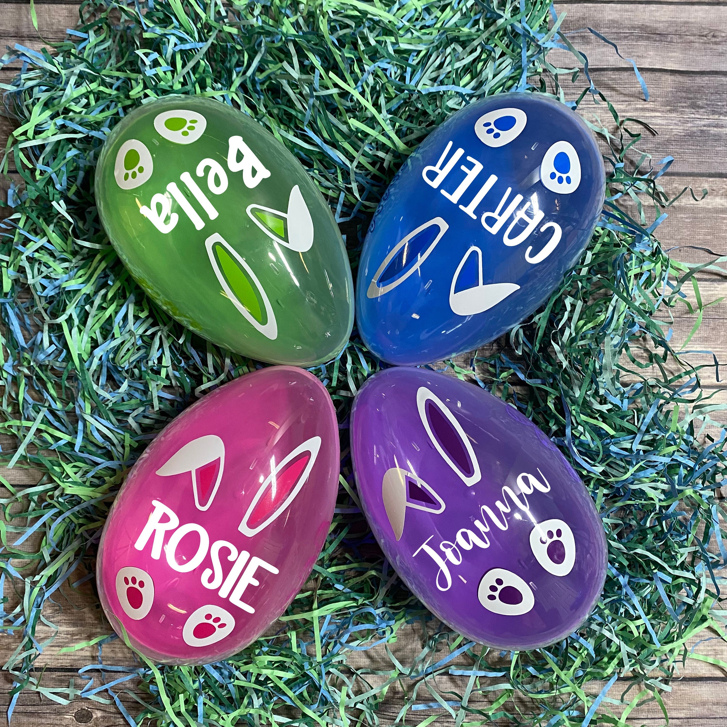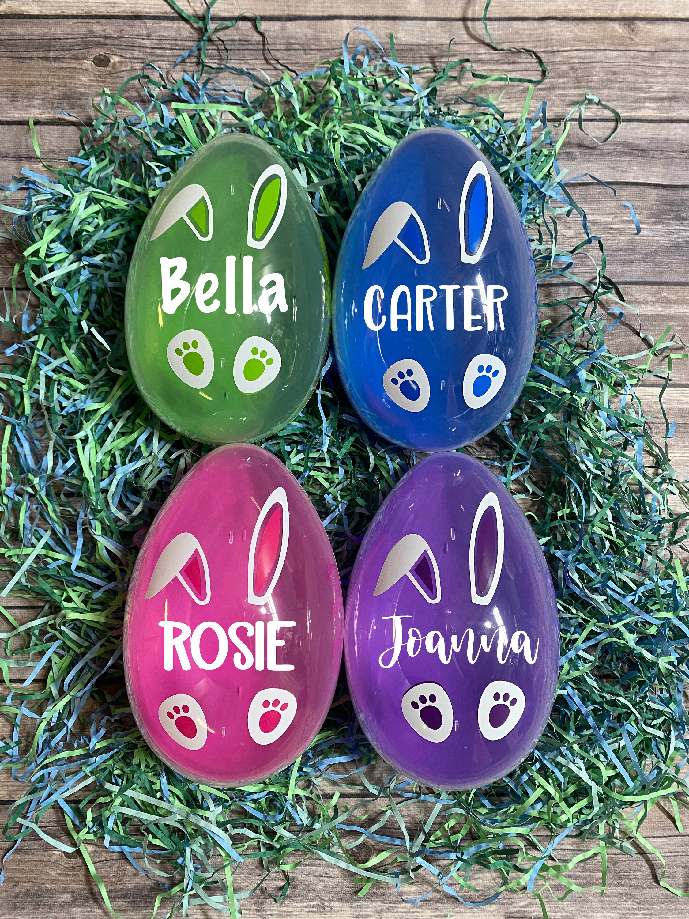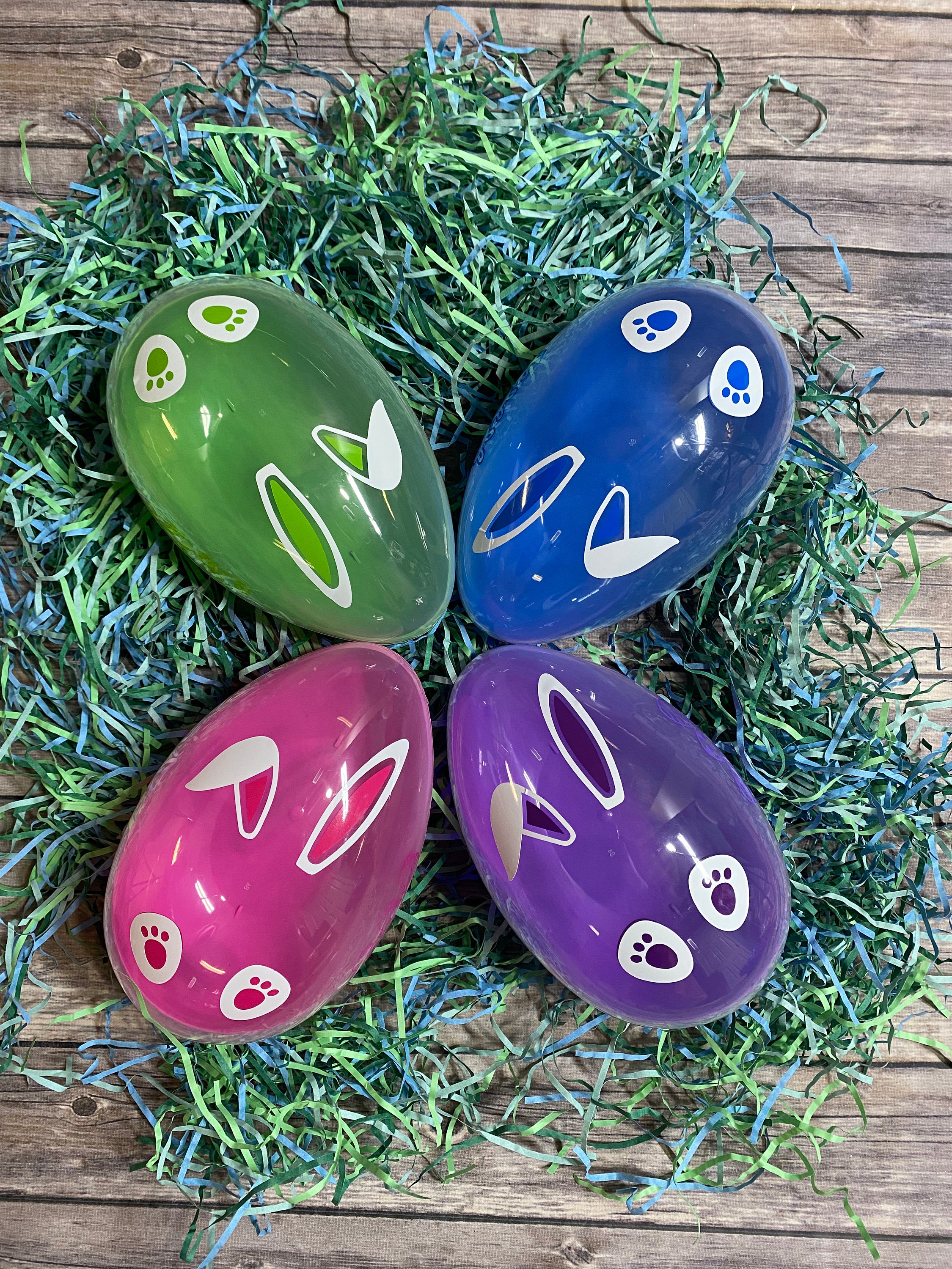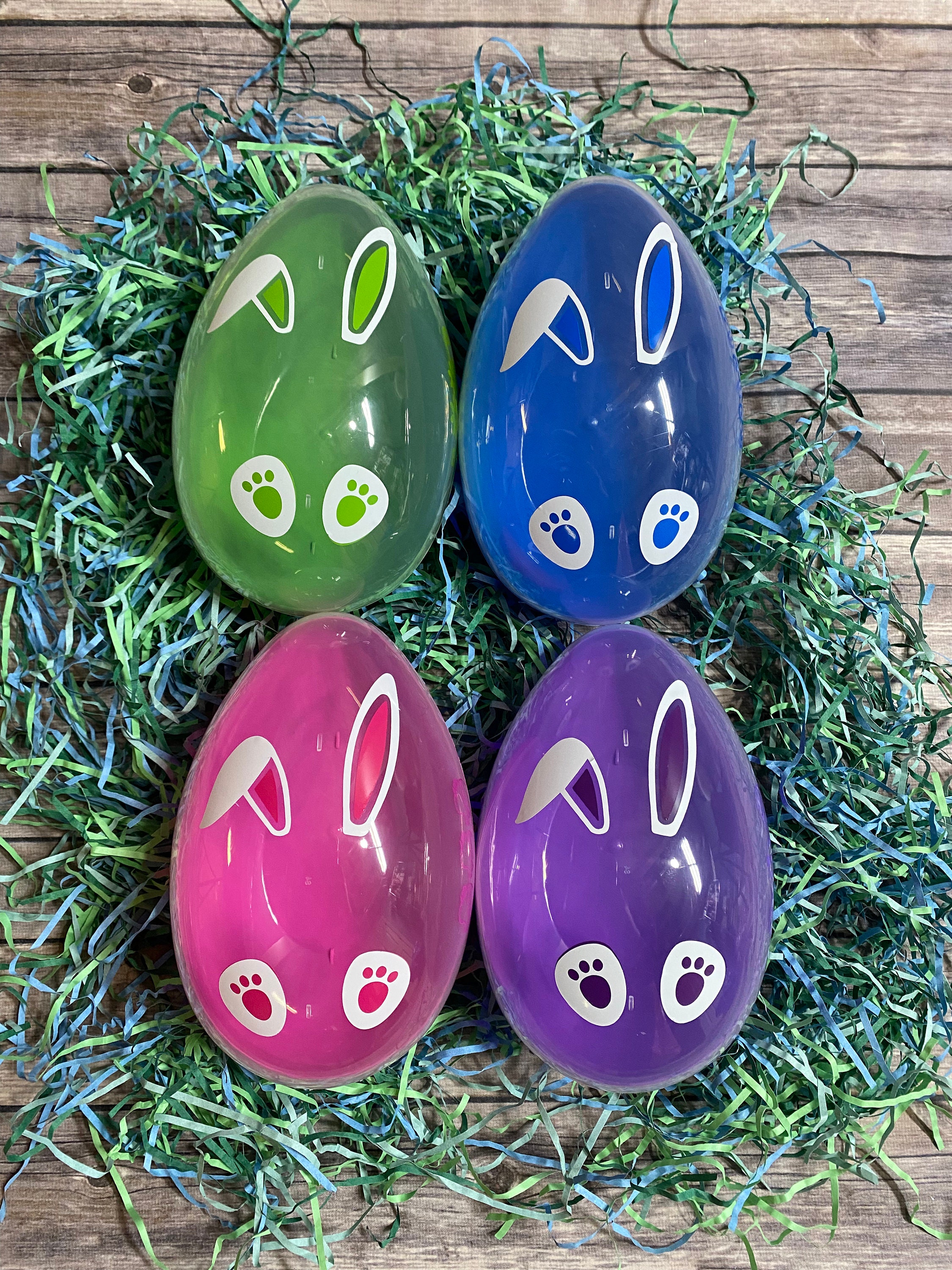 These large jumbo plastic Easter eggs are so much fun! They come in 4 different colors. Blue, Green, Purple, and Pink. These eggs are 7.75 inches long. They come with a clear plastic top and a solid colored base. Each egg has bunny ears and bunny feet that match the color of the egg. Add a name in the center!