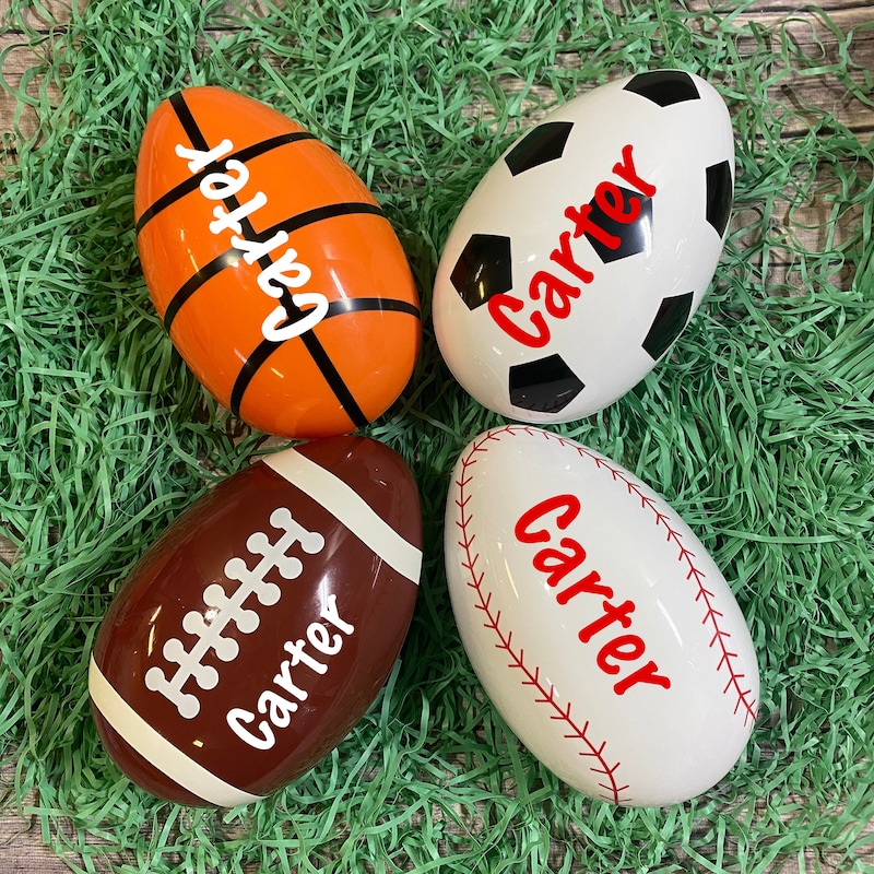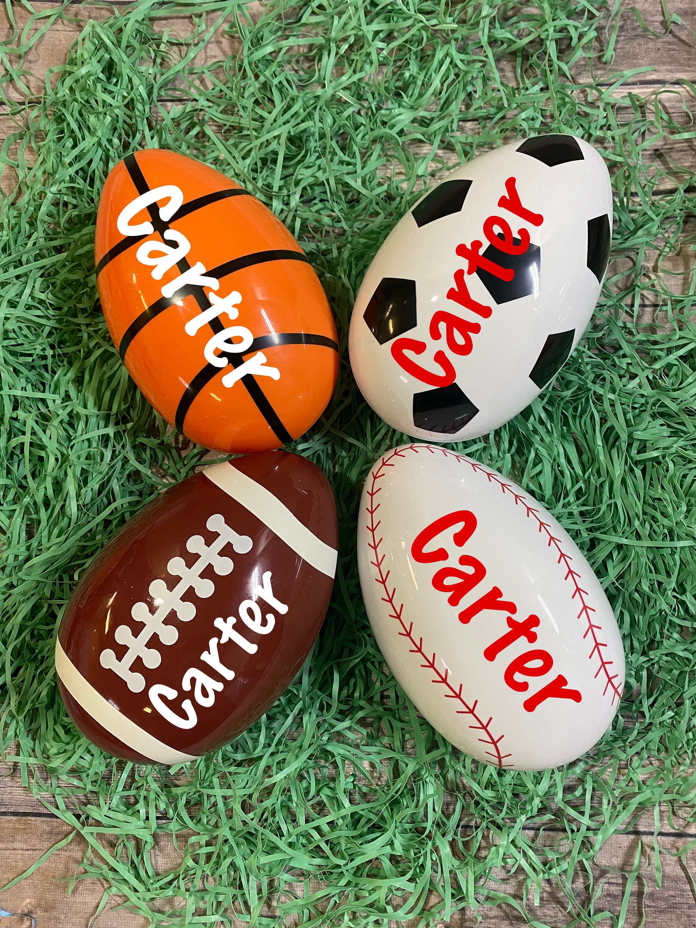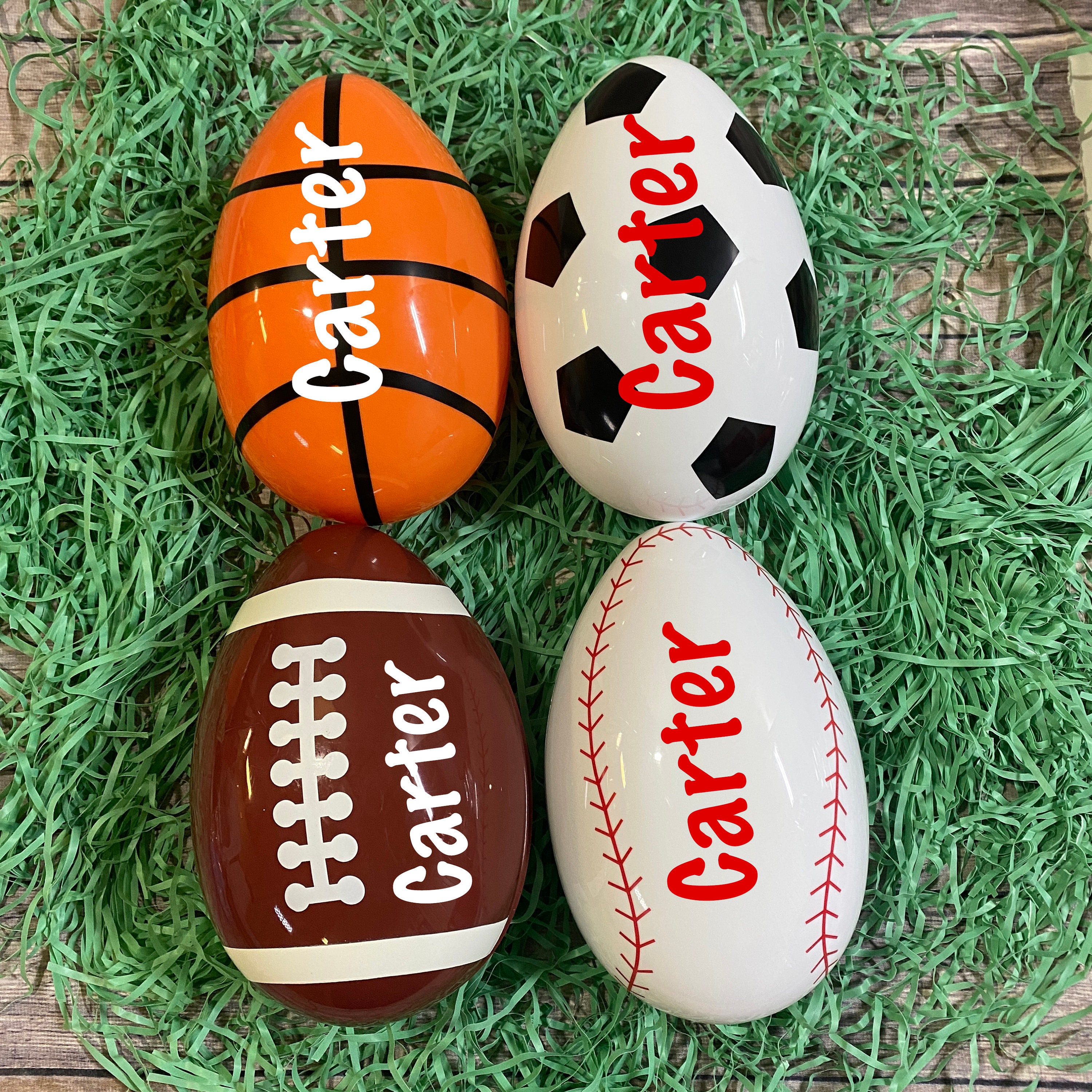 These large jumbo plastic Easter eggs are so much fun! They come in 4 different sports themes: Football, Basketball, Baseball, and Rugby. These eggs are 8.5" long, 6.5" wide, and about 4" tall with the egg.