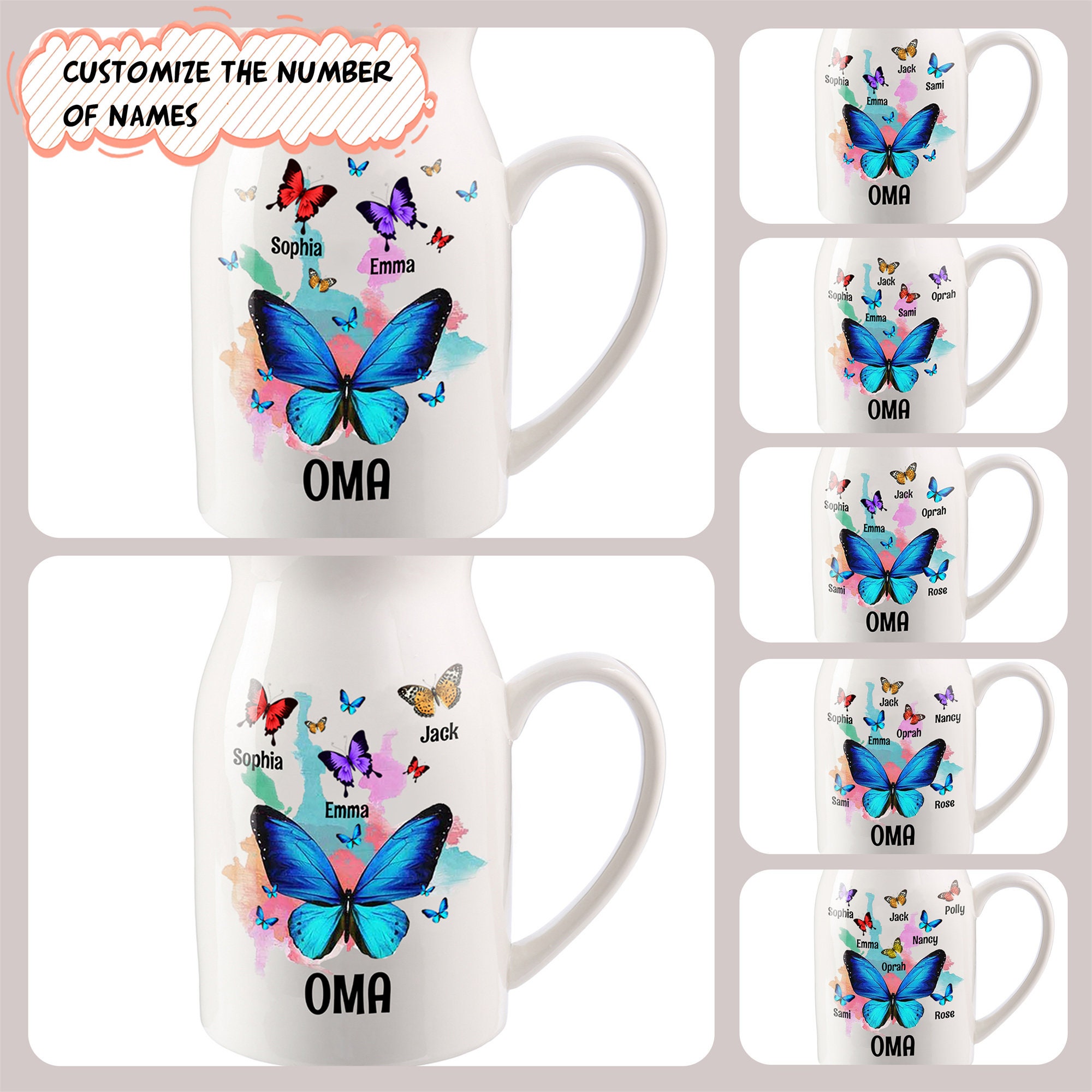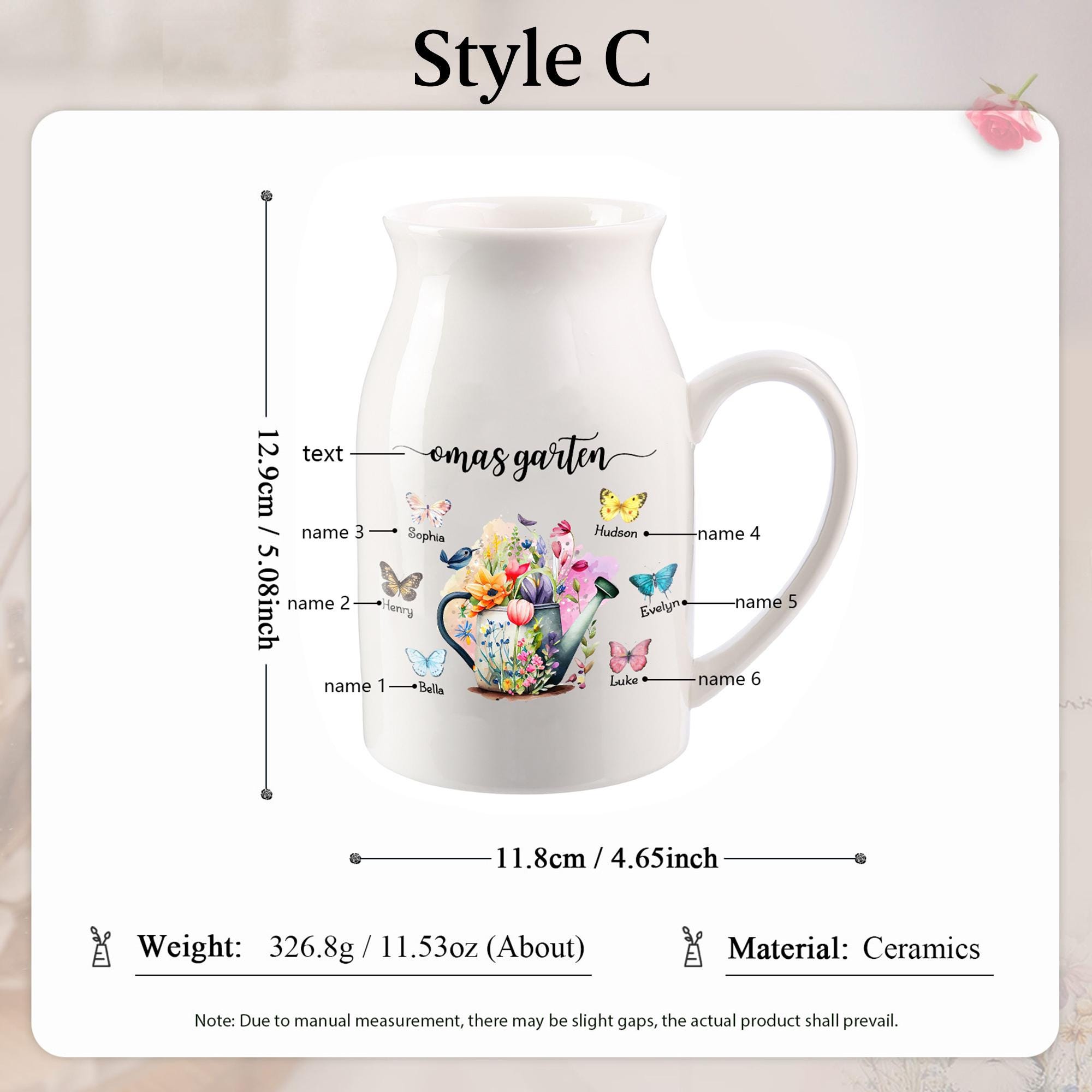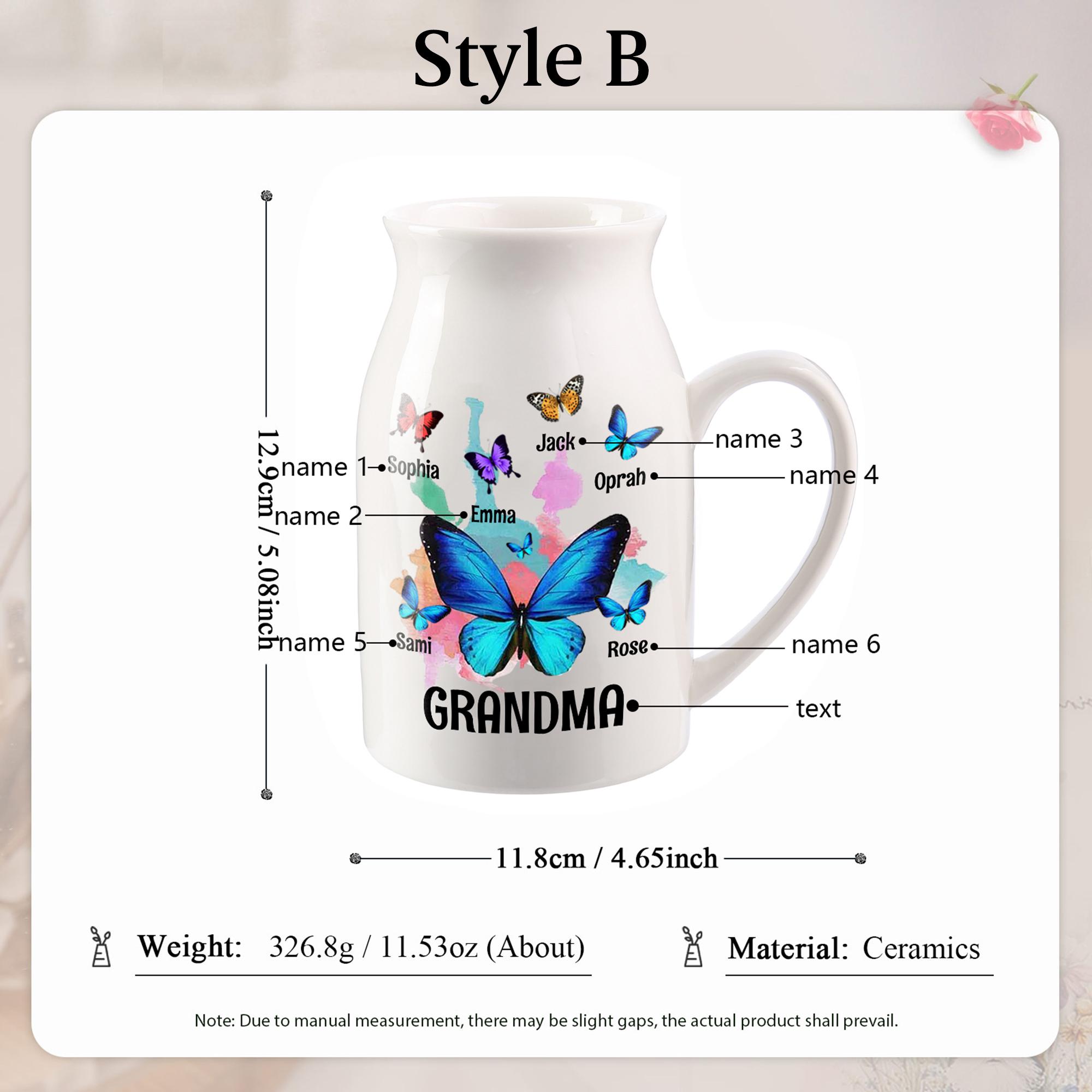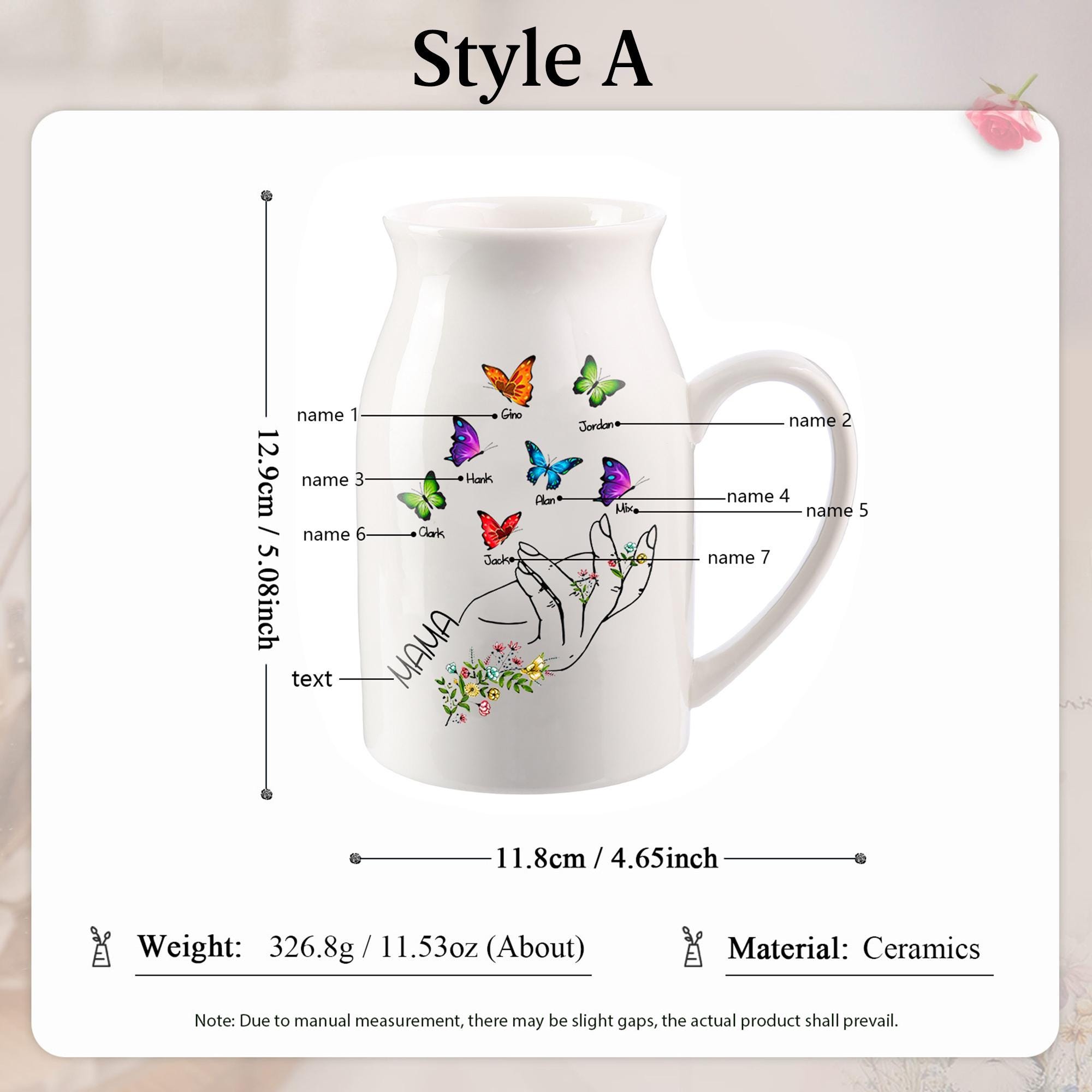 This beautiful vase is decorated with a large hand and 1-7 butterflies, and can be customized with a title and 1-7 names. This versatile gift is perfect for birthdays, Christmas, Mother's Day, or any special occasion for mothers, grandmothers, and family members.