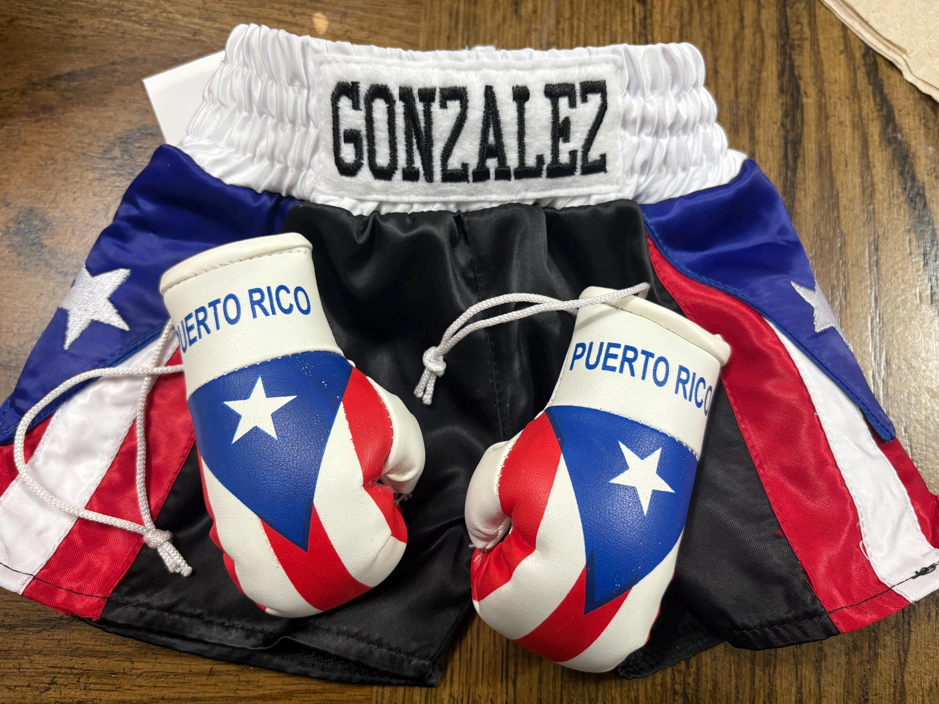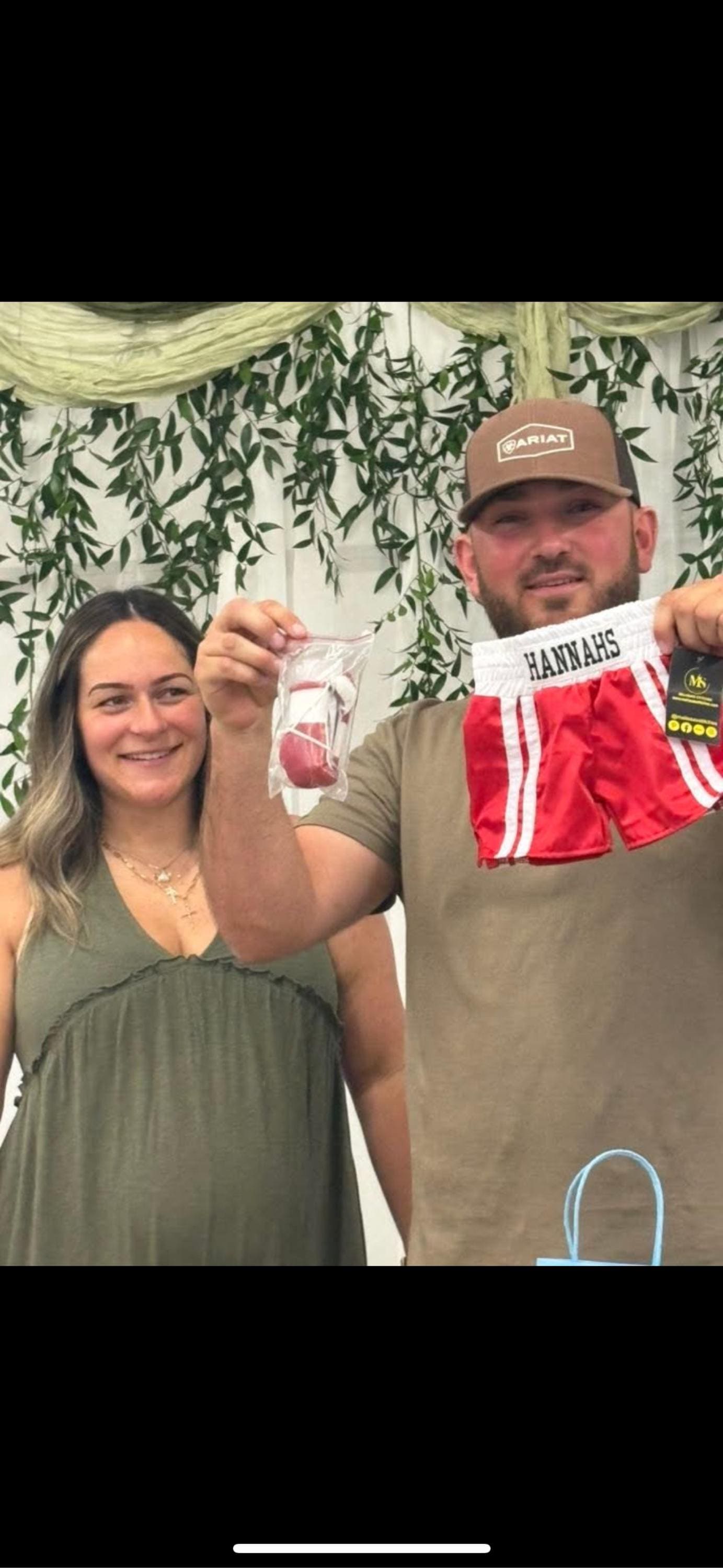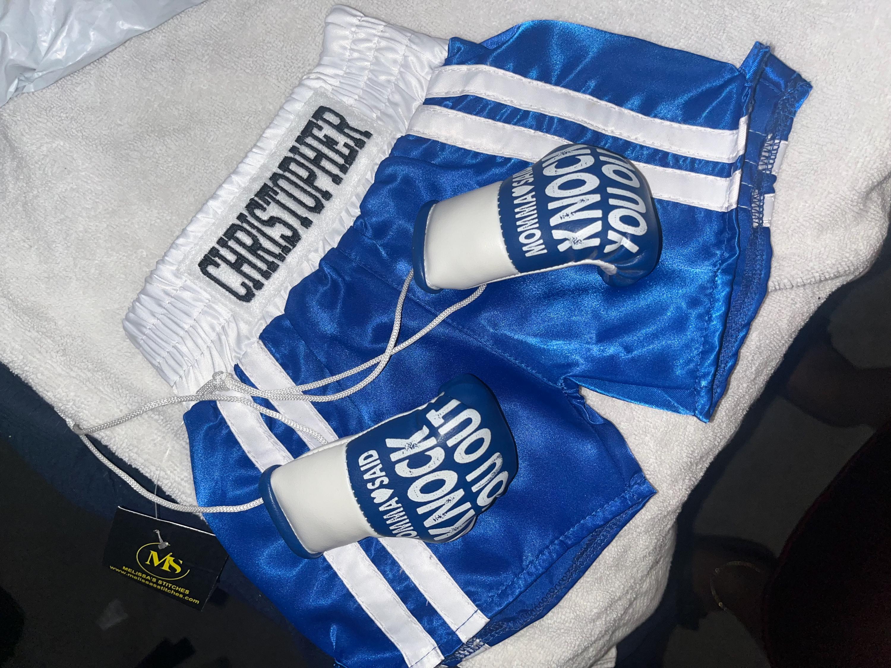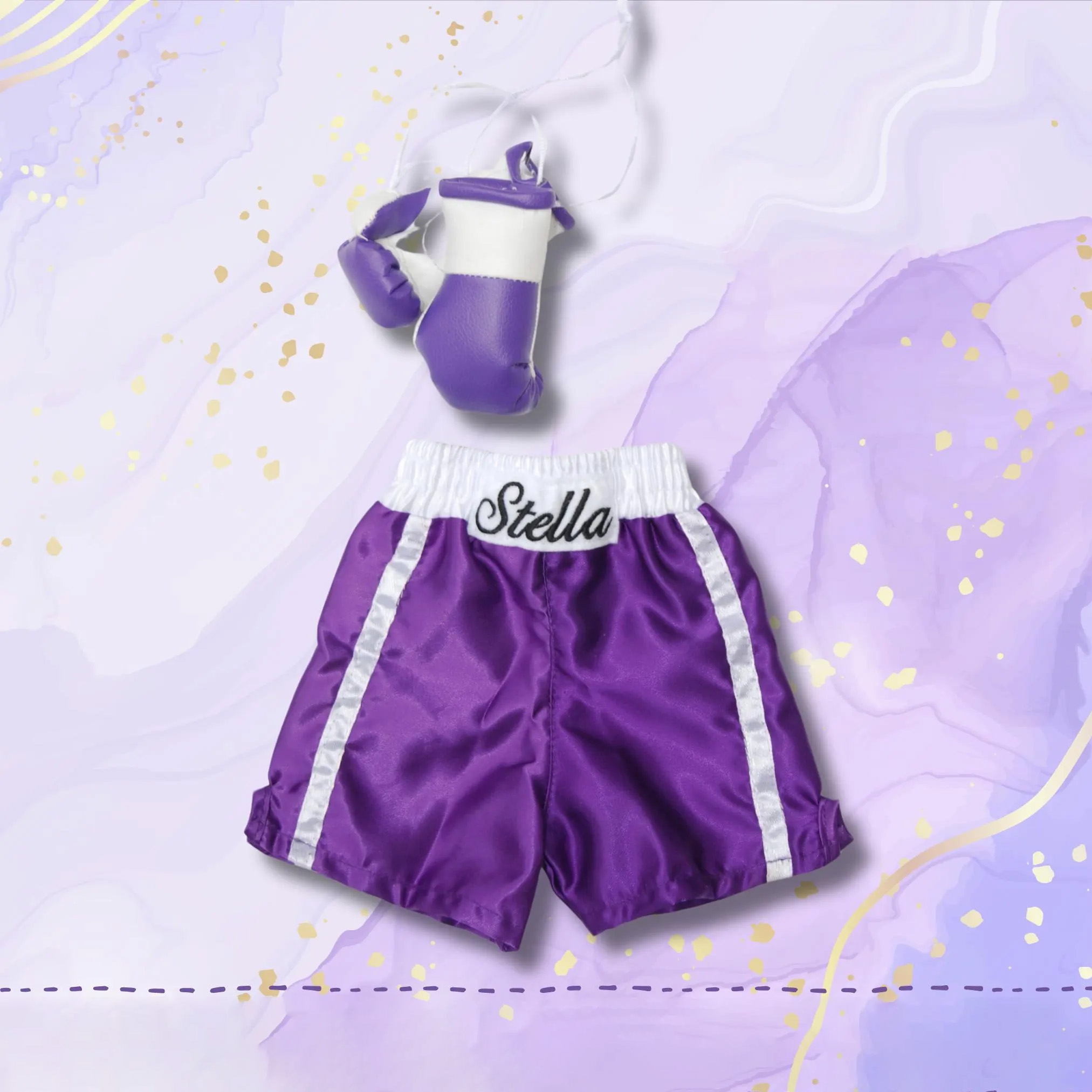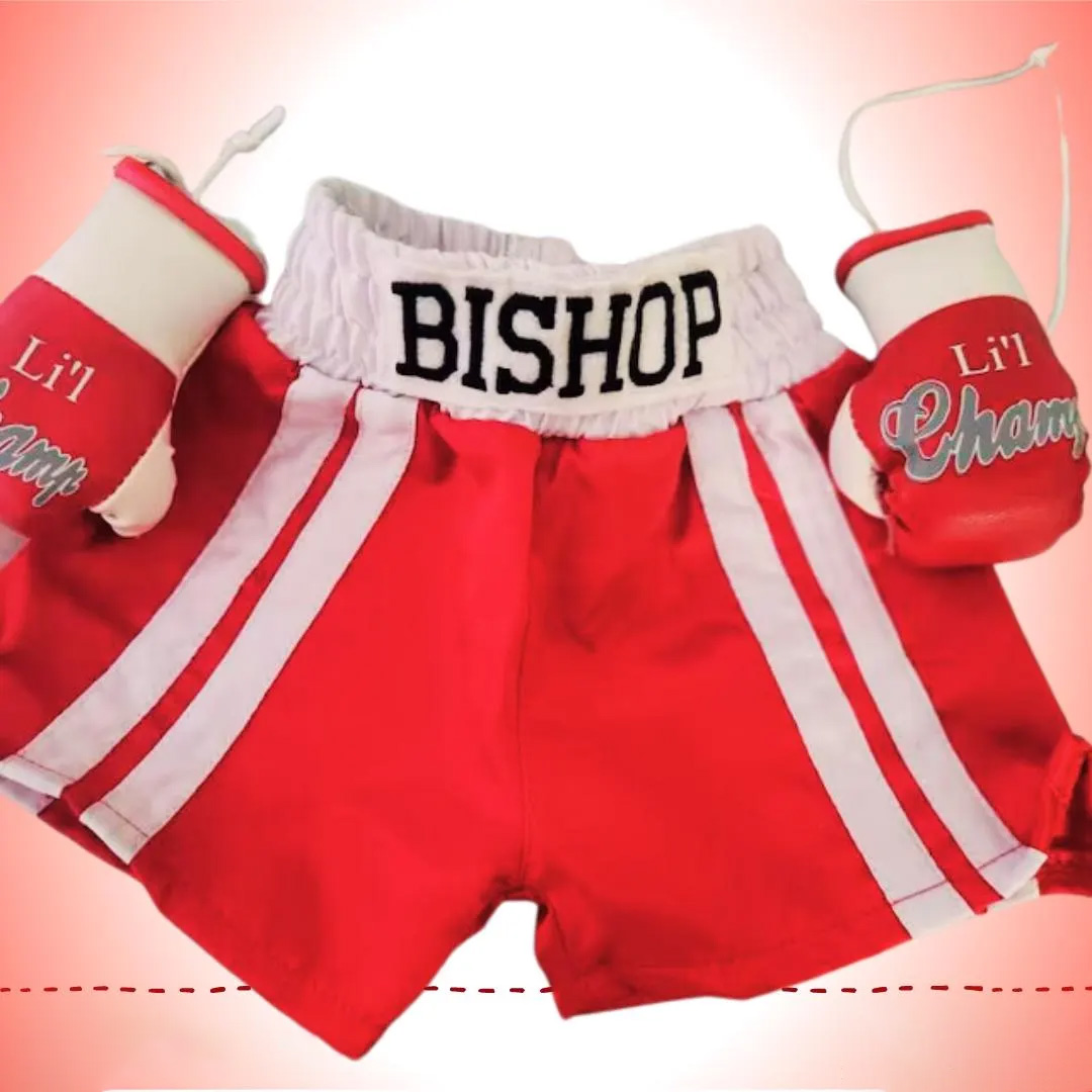 Looking for an amazing outfit for your baby? This charming Baby Boxing Set is the perfect outfit for you. It includes personalised shorts with your baby's name and a pair of prop gloves.
