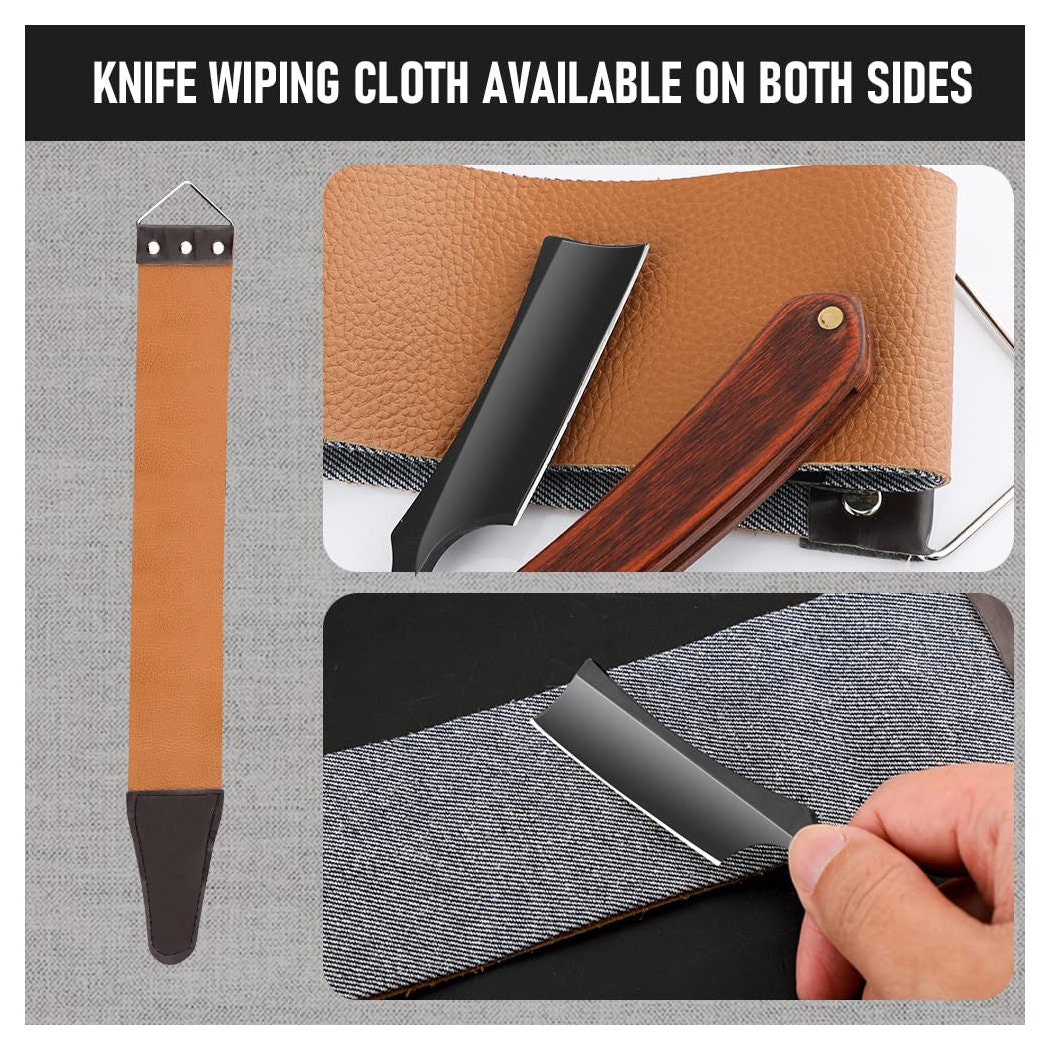 Stainless steel blade and wooden handle, plus a sharpening cloth specifically for the razor. Also includes a leather twill case!