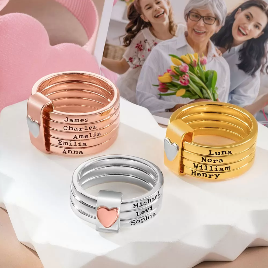 Unique Design - Each ring can be moved and grouped together with a heart-shaped tie to indicate that all children are always with their mothers. Each ring can be custom engraved with 2-5 names, representing the people she holds dear in her life, whether it be her children, grandchildren or loved ones.