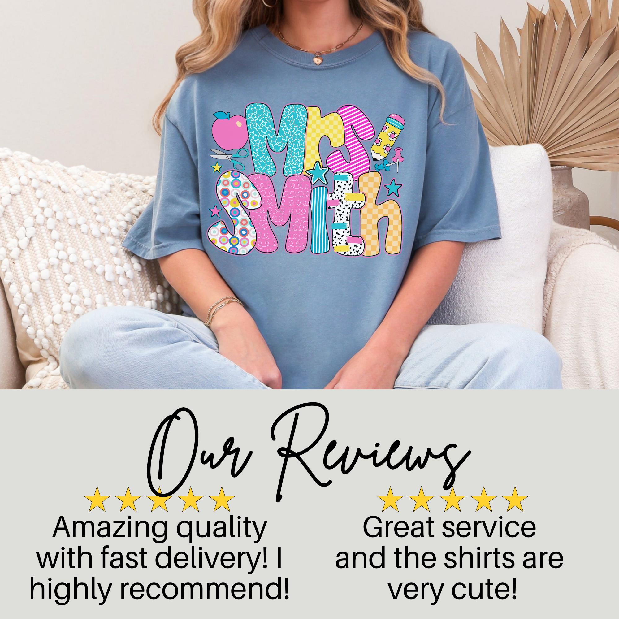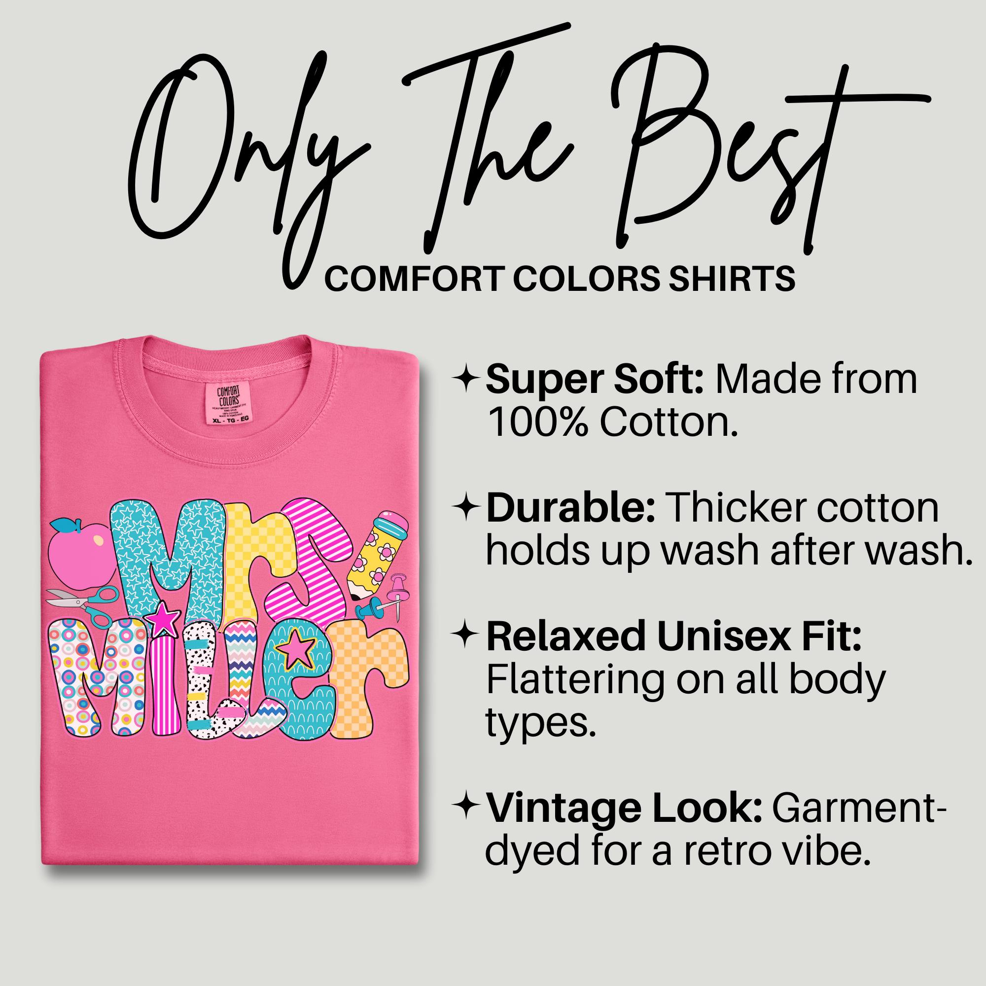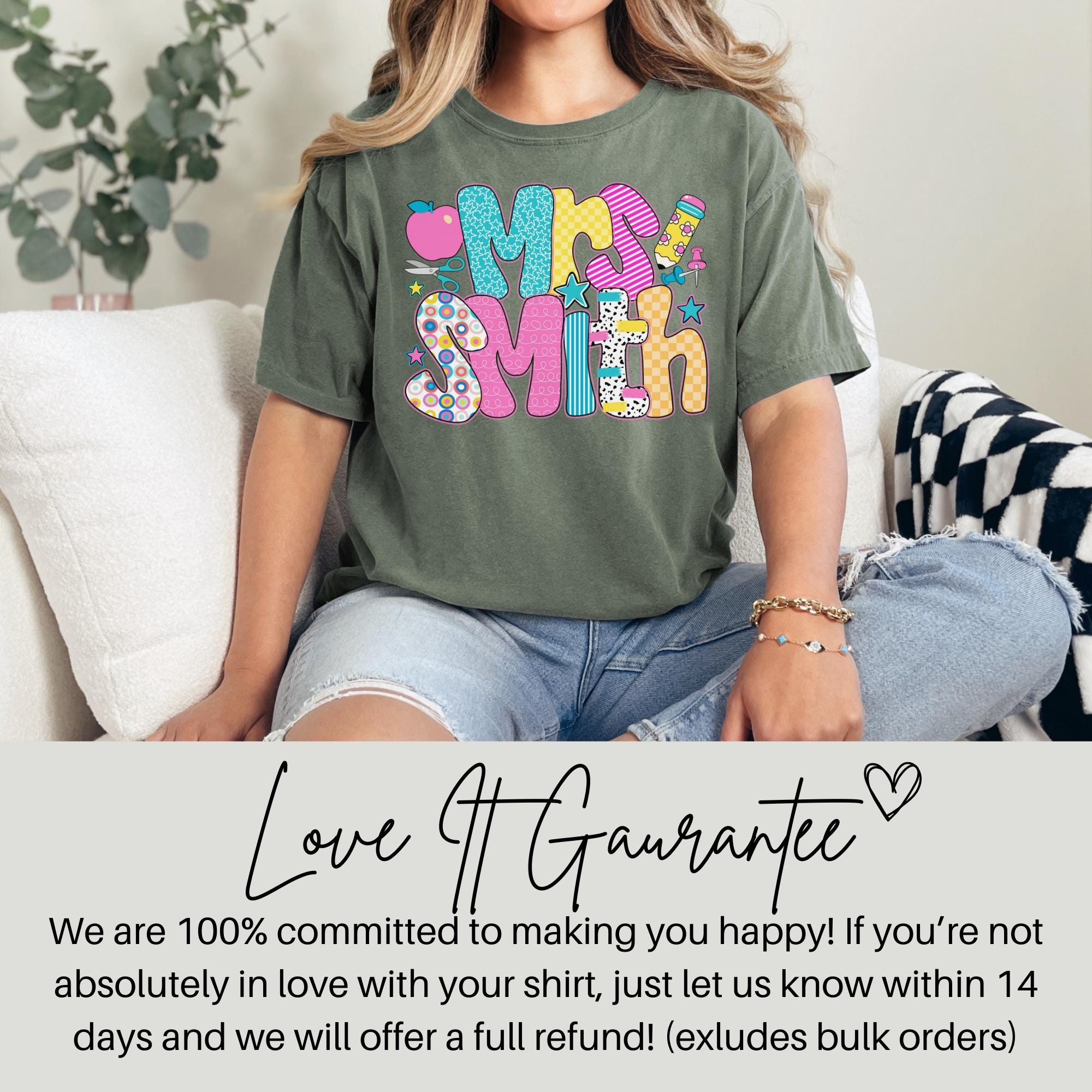 Personalized Teacher Name Shirt – Show your love for your favorite teacher with this fun, colorful custom name shirt! Perfect for back to school, teacher appreciation, or end of year gift. Made from premium, soft Comfort Colors fabric for comfort and style. Customize with any name for a unique and thoughtful gift. Perfect for teacher teams, school spirit days, or casual classroom wear.