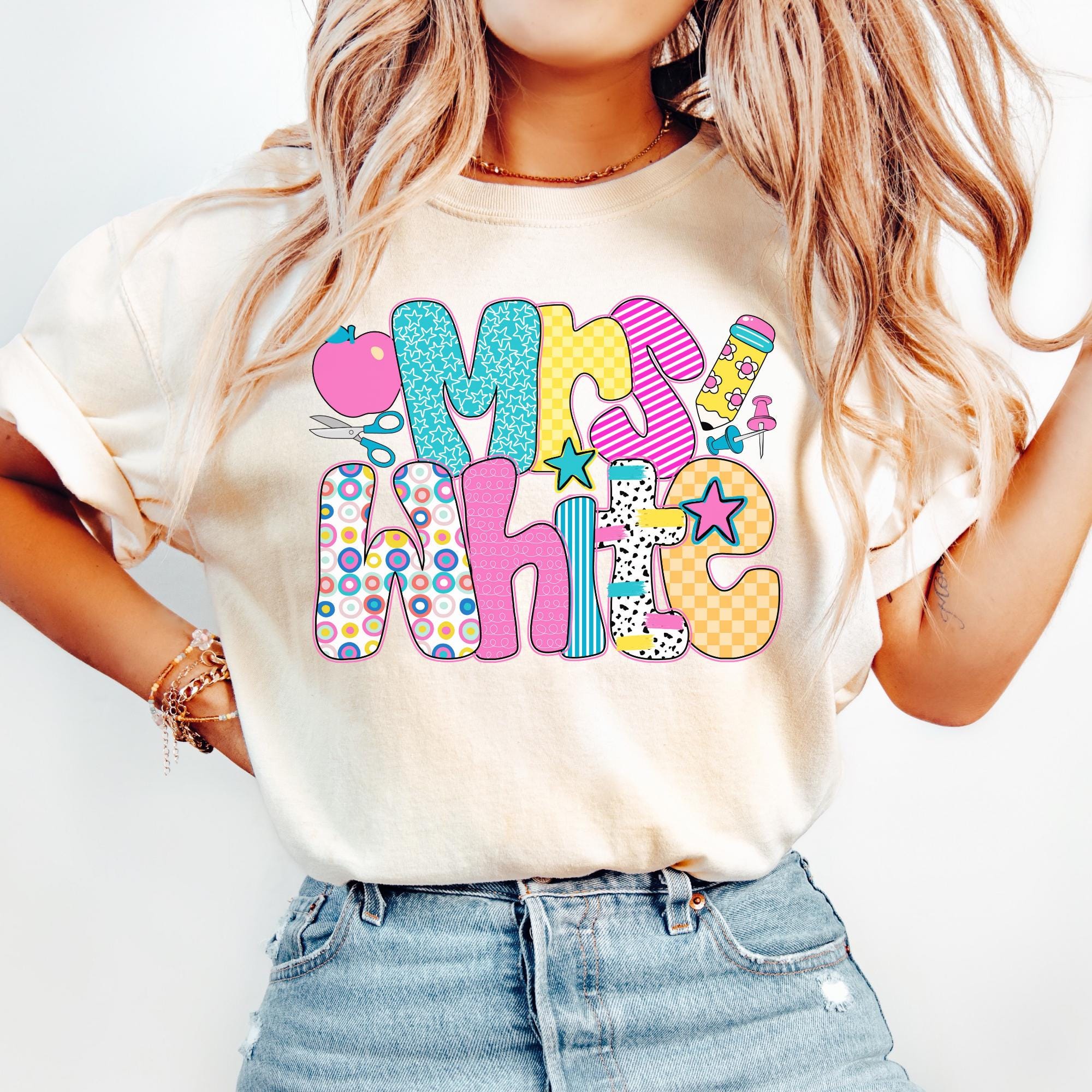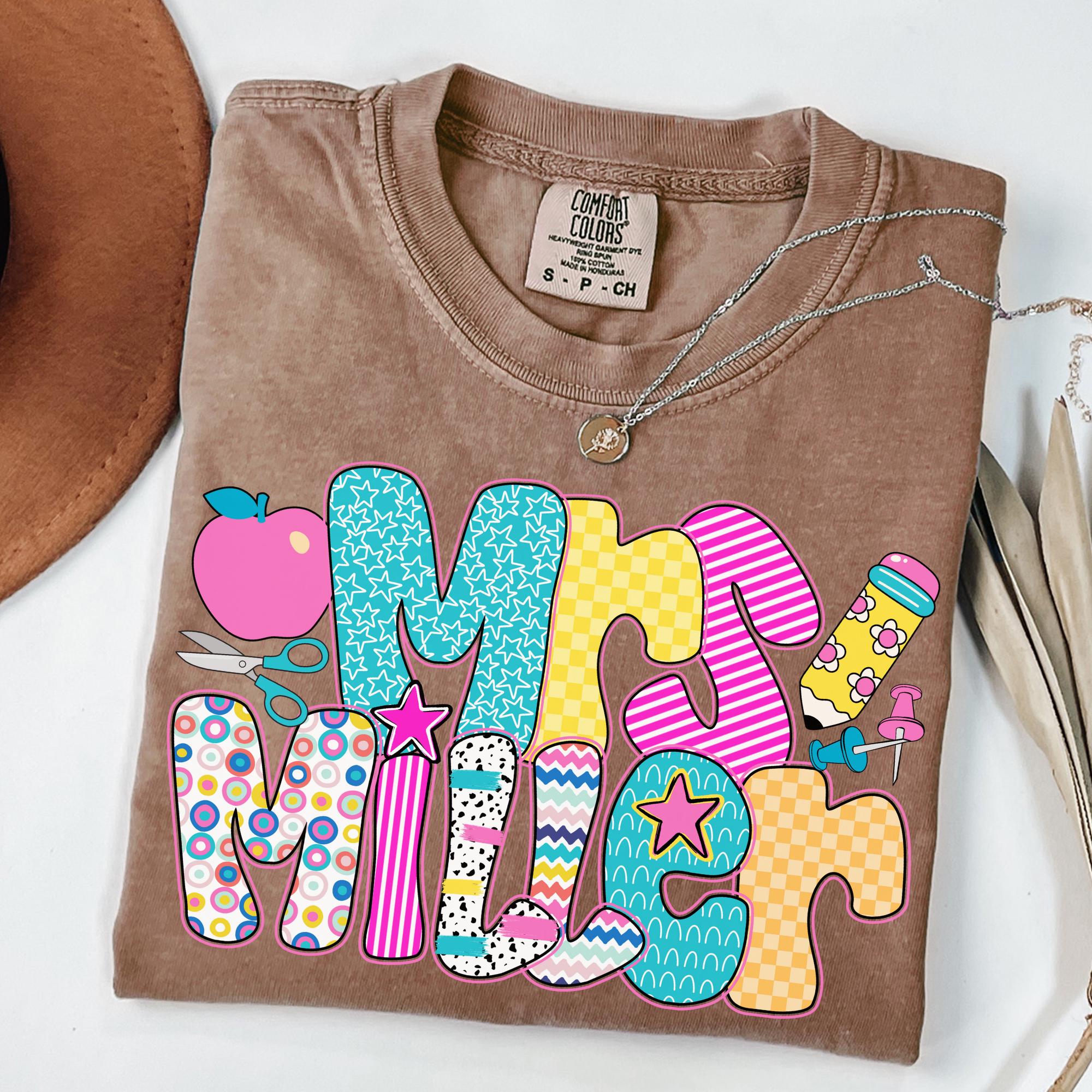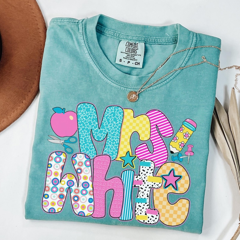 Personalized Teacher Name Shirt – Show your love for your favorite teacher with this fun, colorful custom name shirt! Perfect for back to school, teacher appreciation, or end of year gift. Made from premium, soft Comfort Colors fabric for comfort and style. Customize with any name for a unique and thoughtful gift. Perfect for teacher teams, school spirit days, or casual classroom wear.