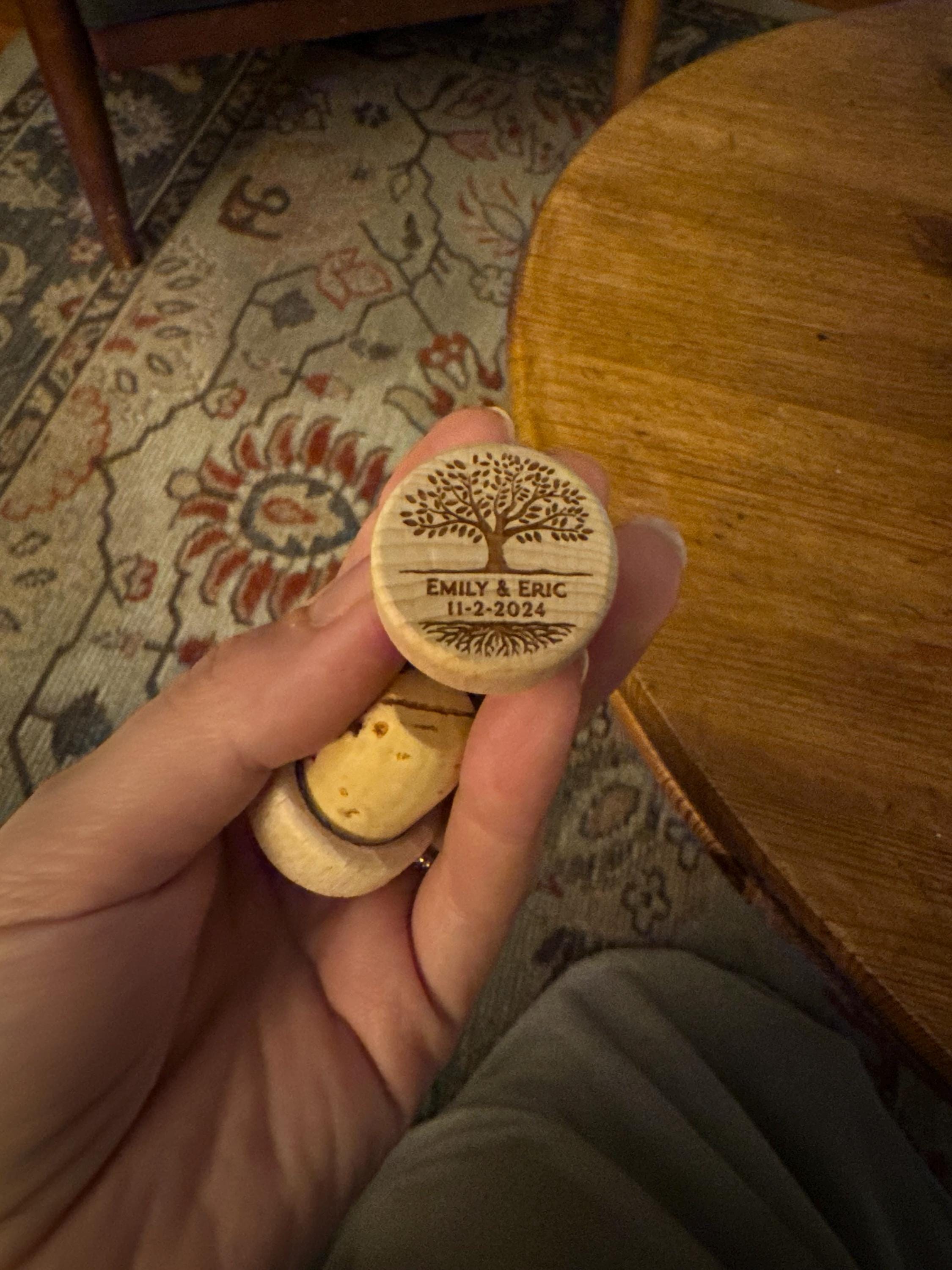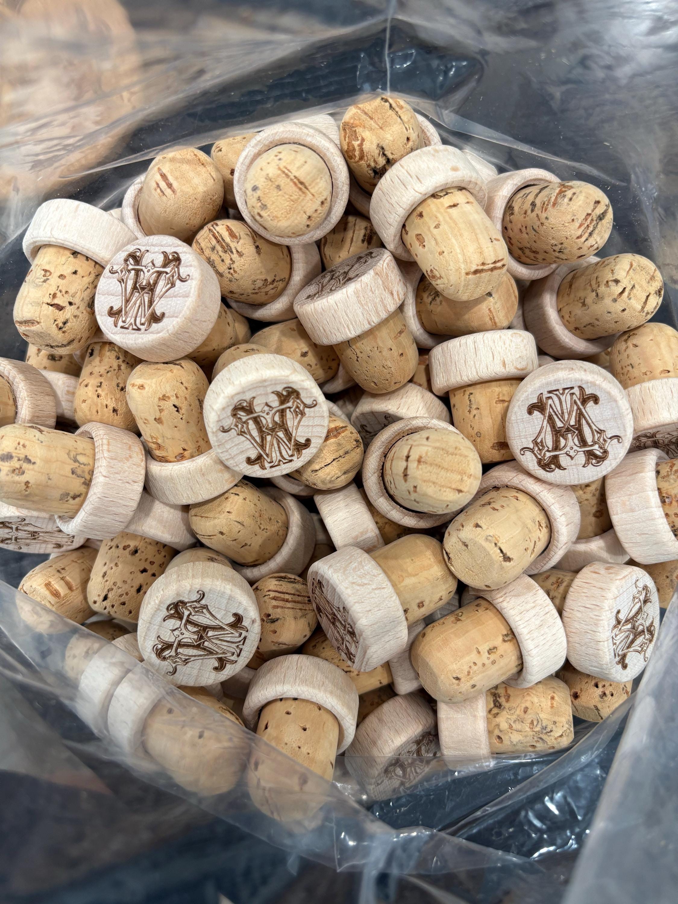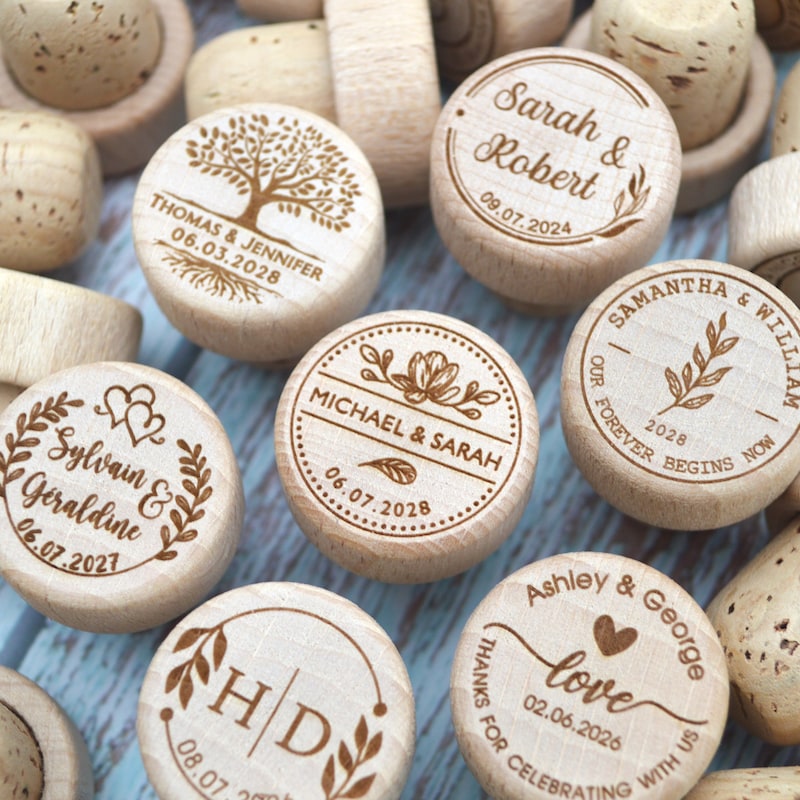 They are made from natural wood from sustainable plantations and natural premium cork from Portugal (not polymerized cork, not pressed cork), only natural premium cork. The wood capsules are sanded and then the two pieces are glued together. They are then engraved with a laser so that the image will be perfect and won't fade over time.