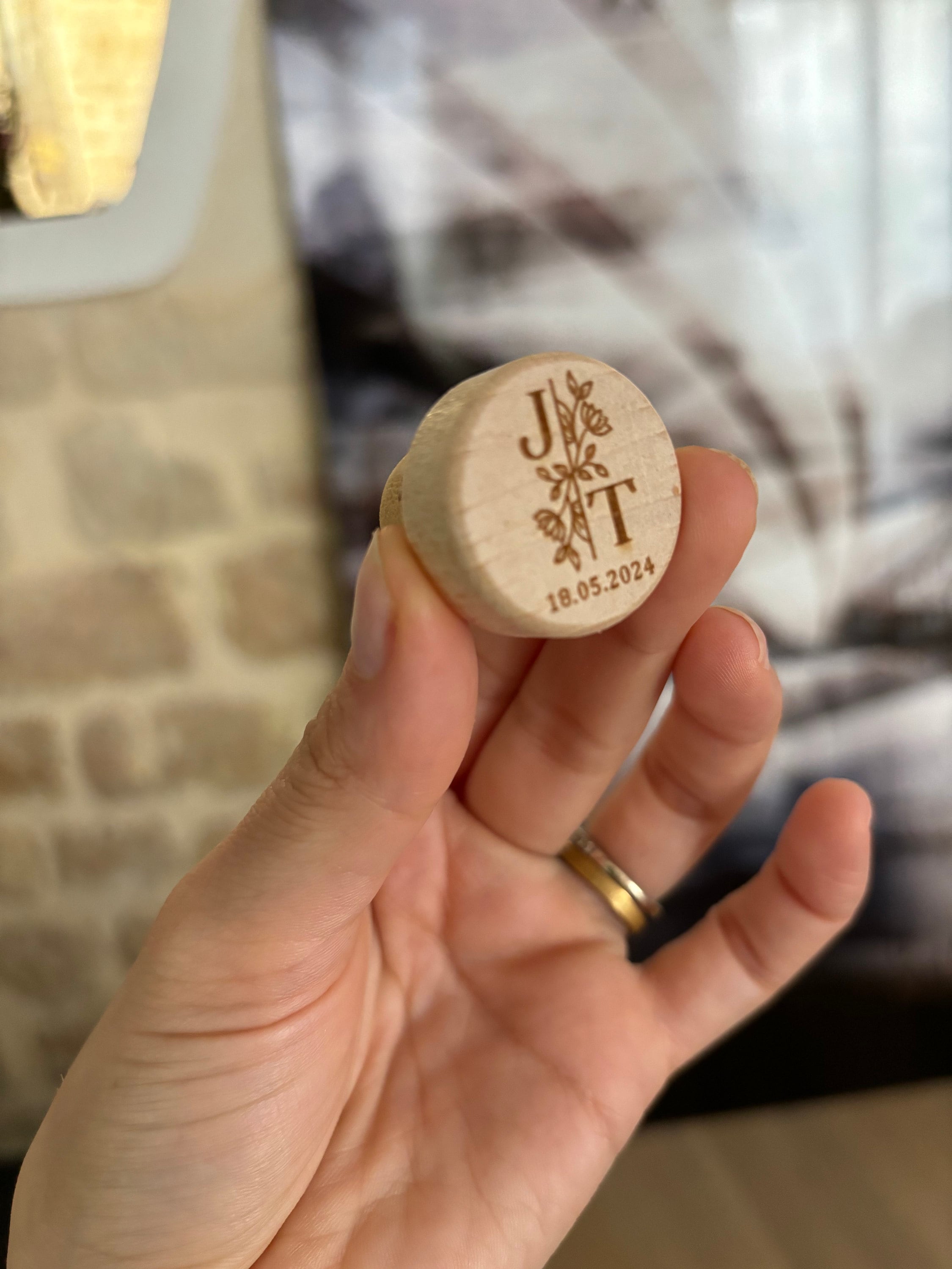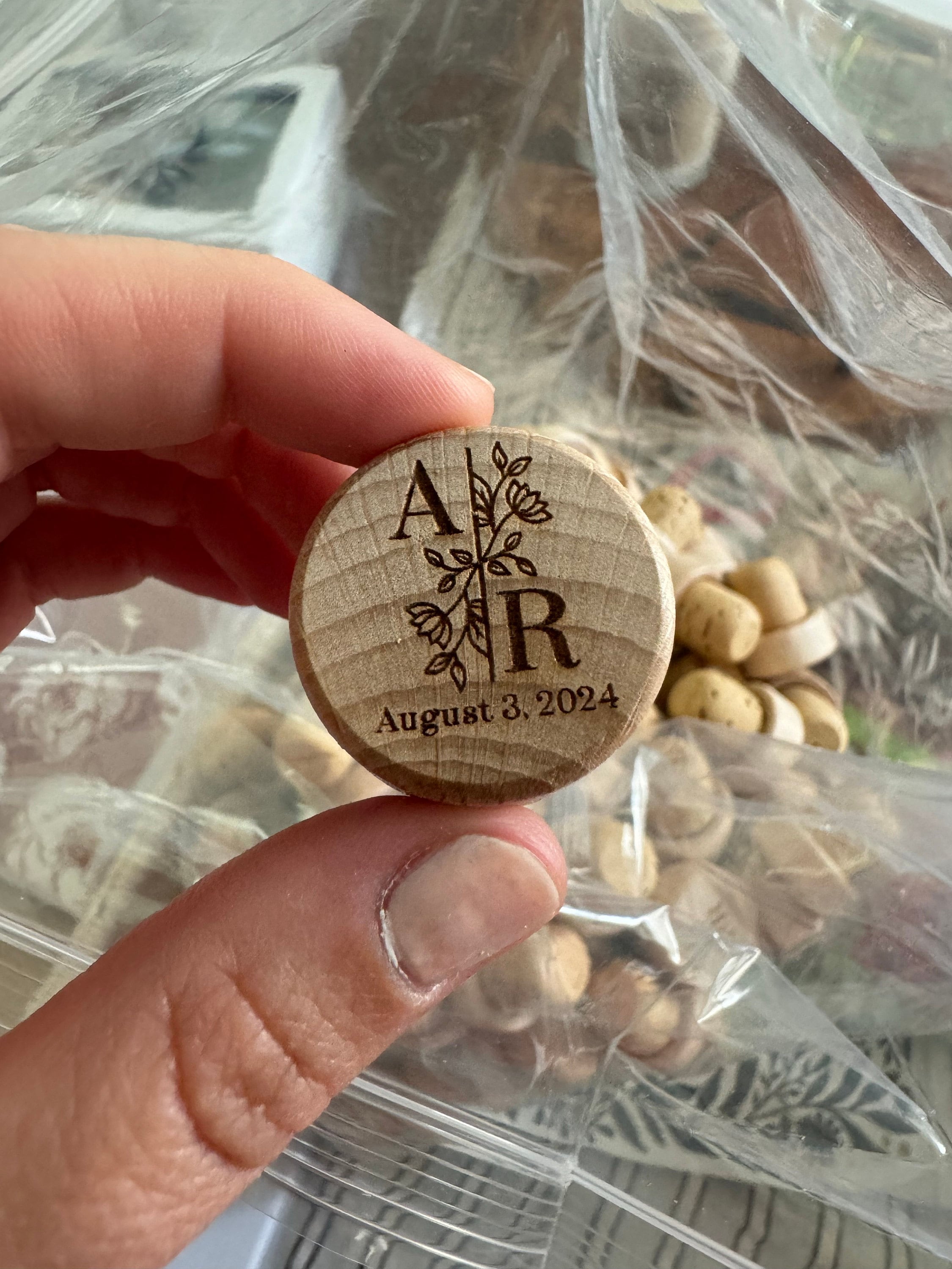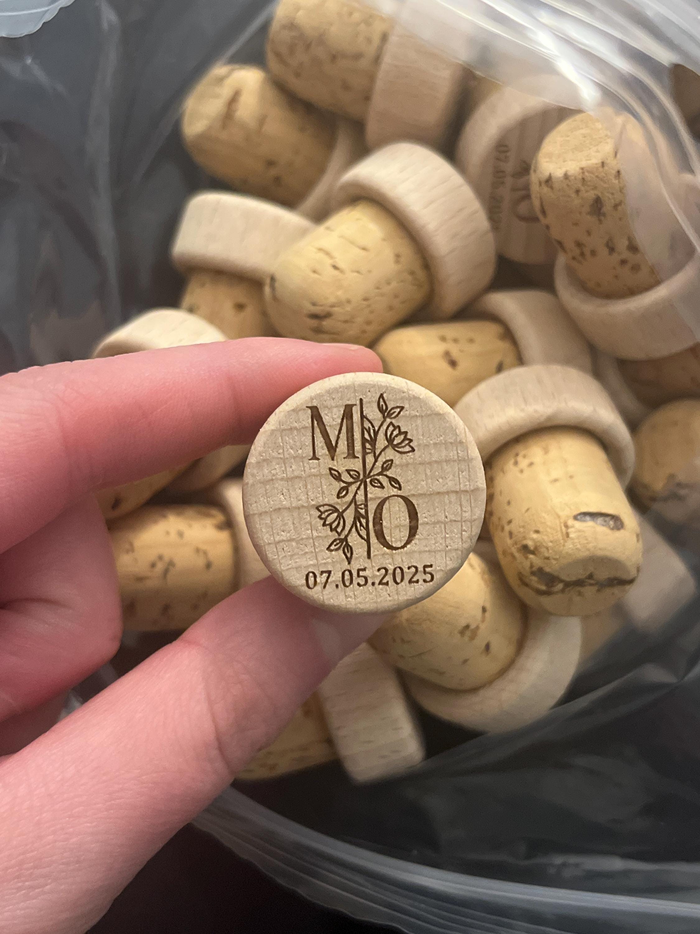 They are made from natural wood from sustainable plantations and natural premium cork from Portugal (not polymerized cork, not pressed cork), only natural premium cork. The wood capsules are sanded and then the two pieces are glued together. They are then engraved with a laser so that the image will be perfect and won't fade over time.