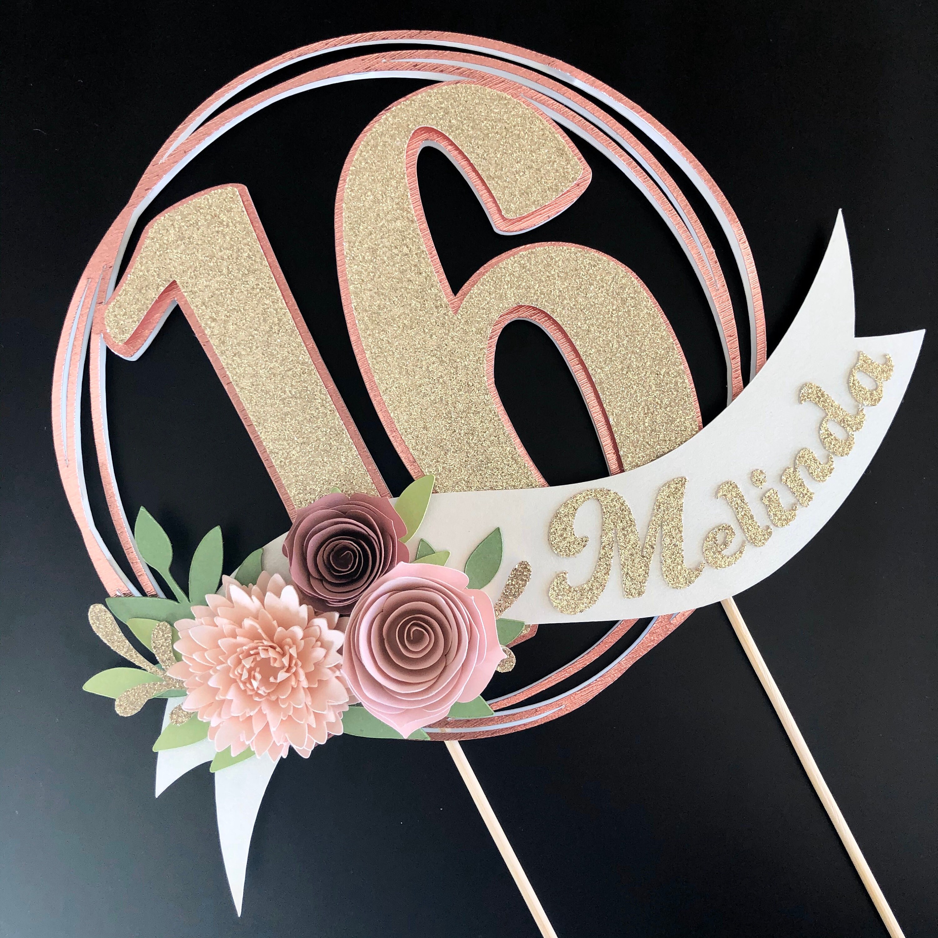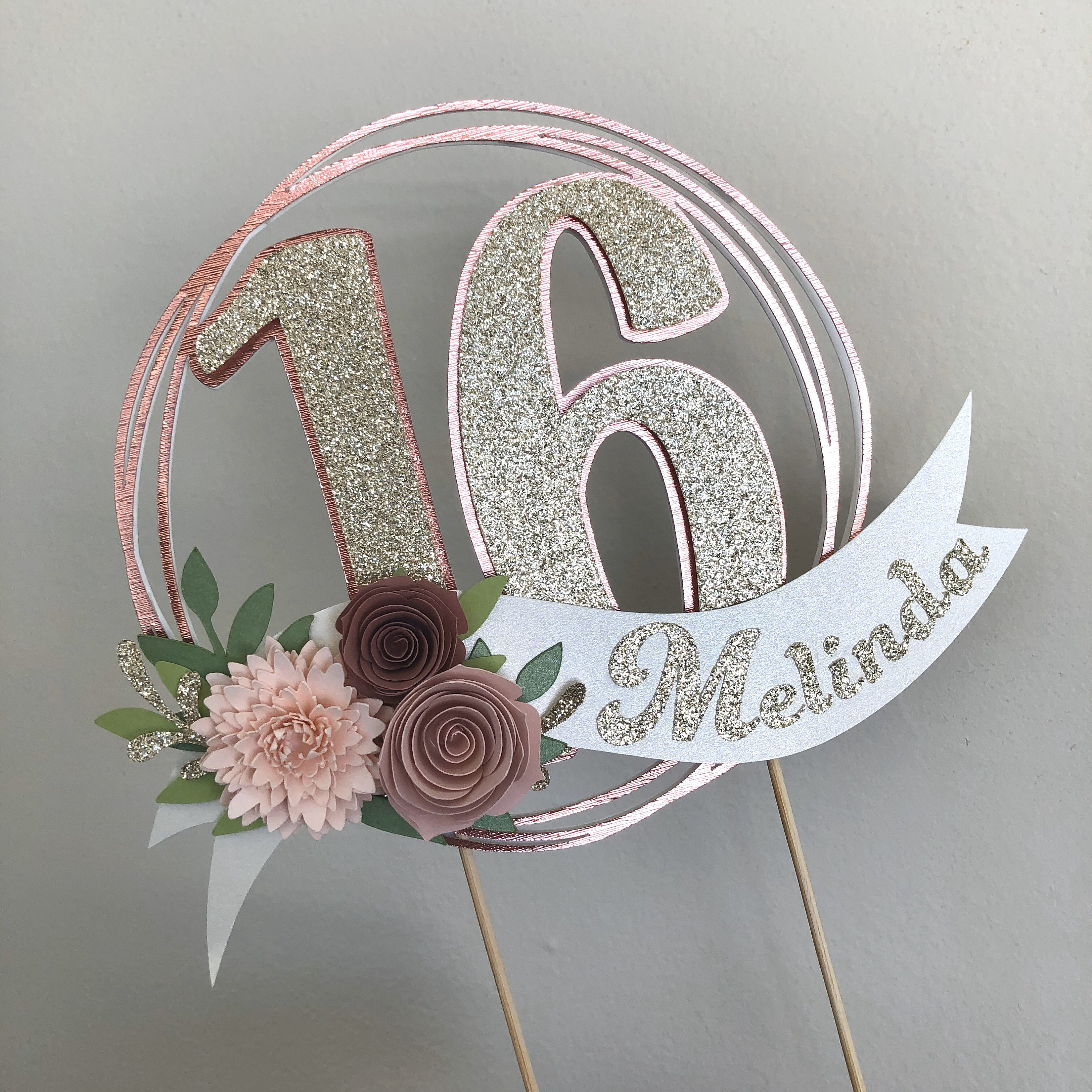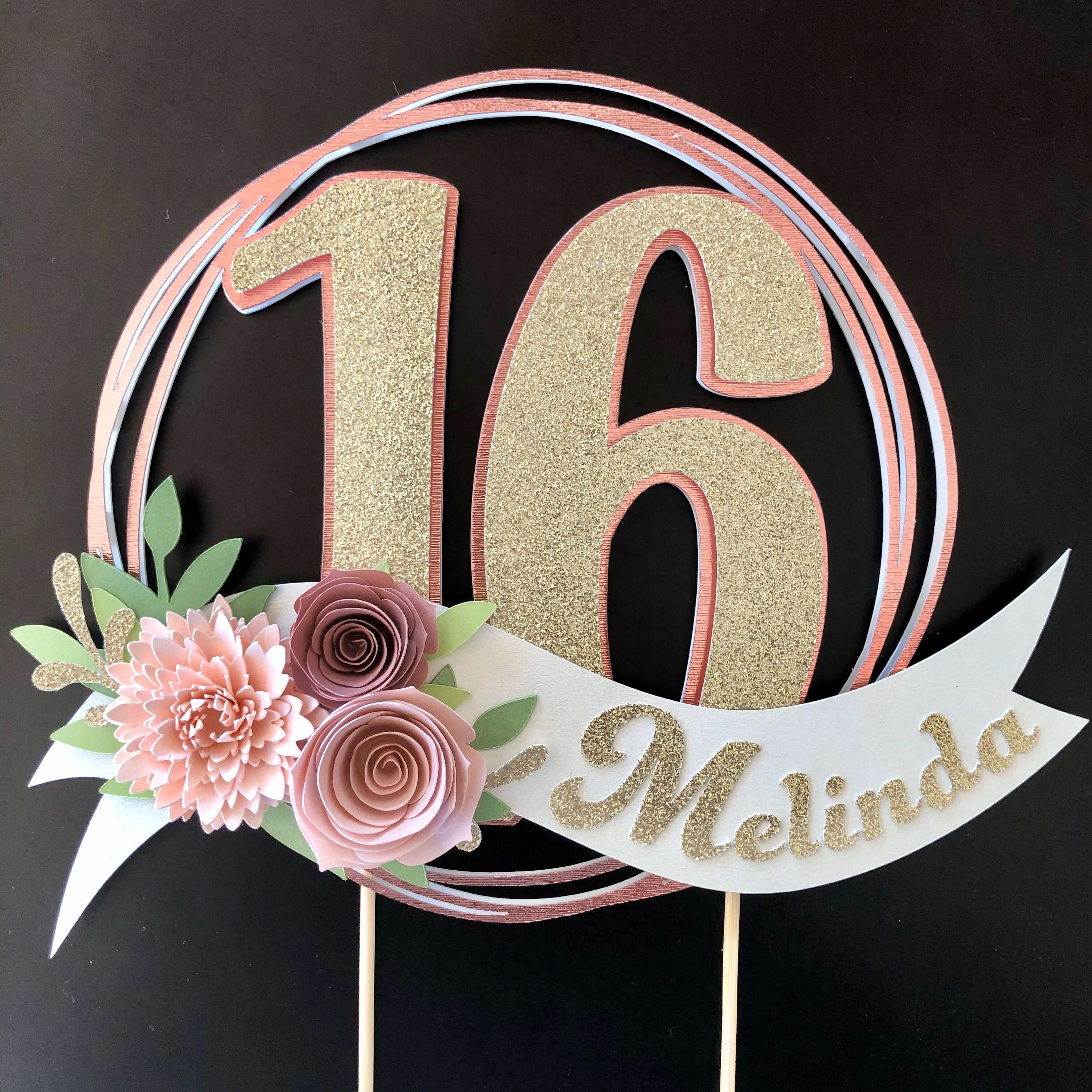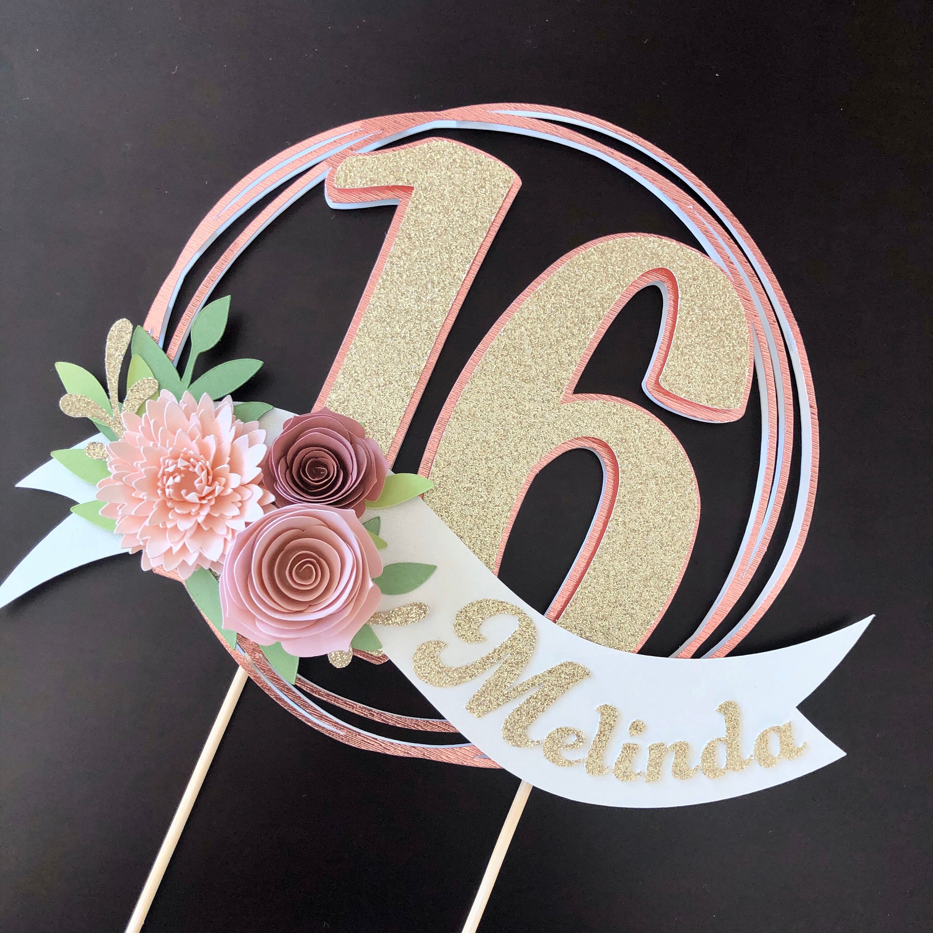 *Cake topper features a rose gold wreath with a gold glitter number 16 in the center, outlined in rose gold. Topper is embellished with a cream colored ribbon banner at the base, which features a floral arrangement in light pink and dusty pink tones, and the name in gold glitter letters. Back of the topper is plain white cardstock.
