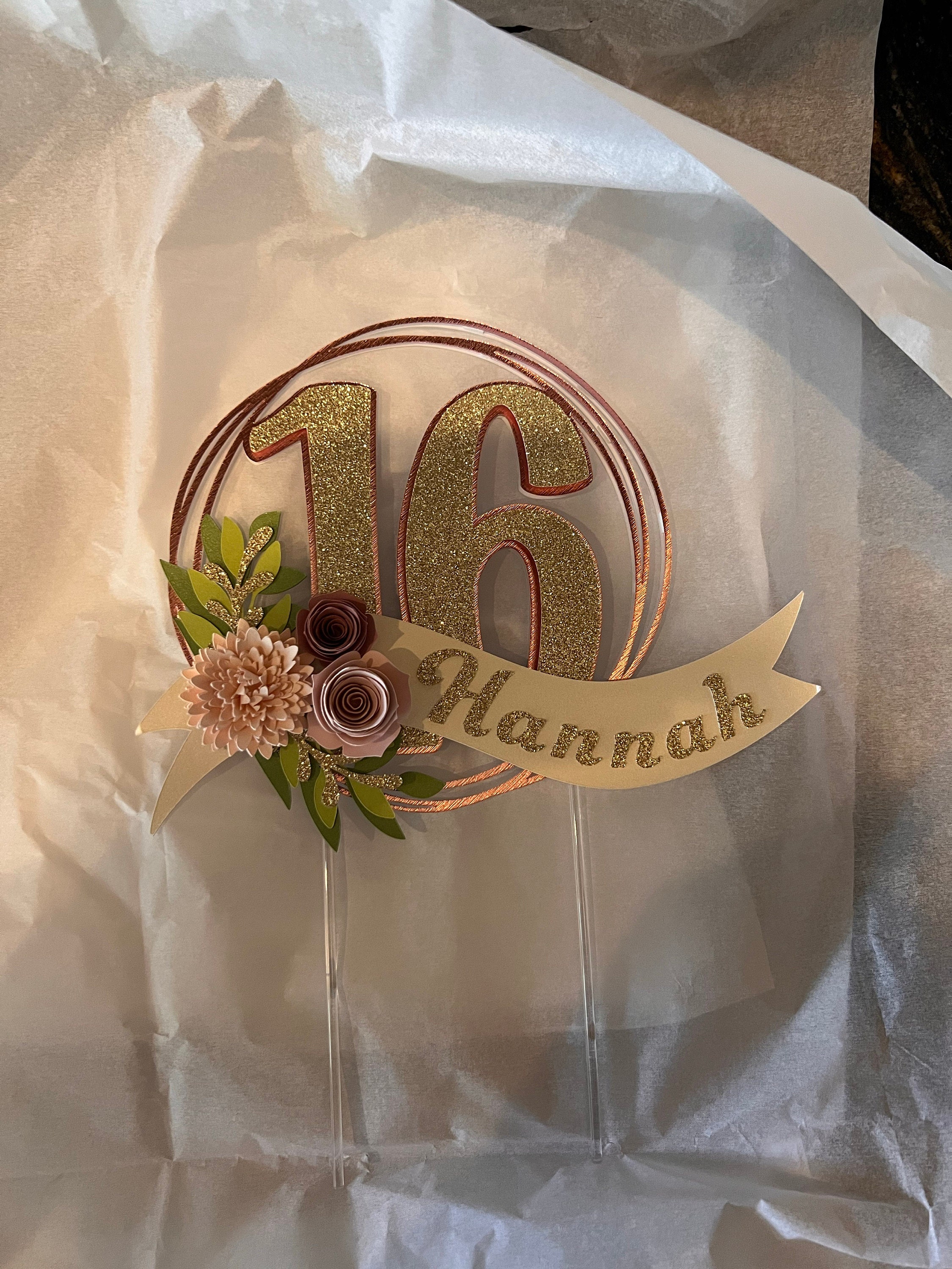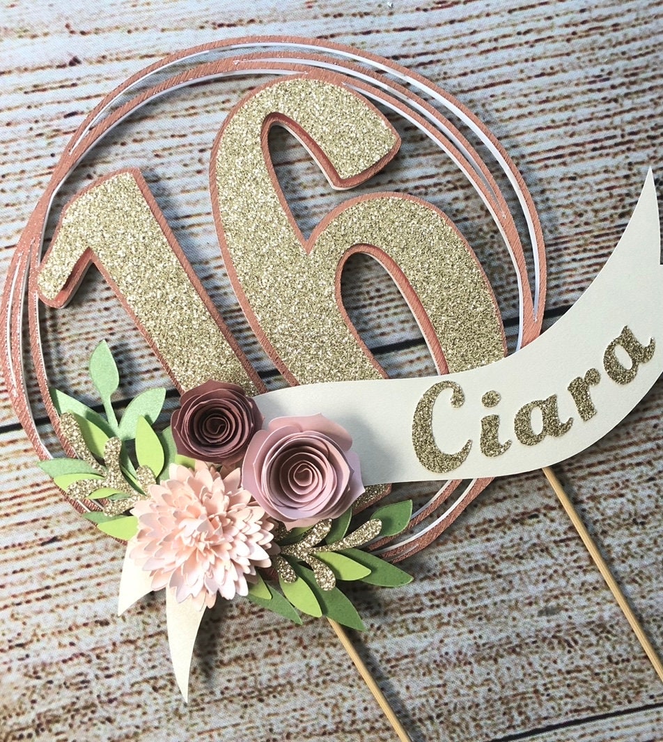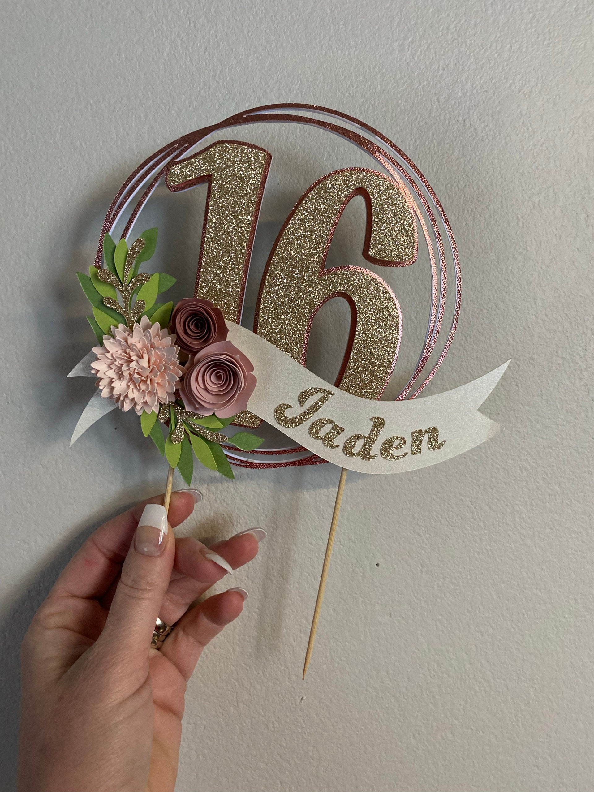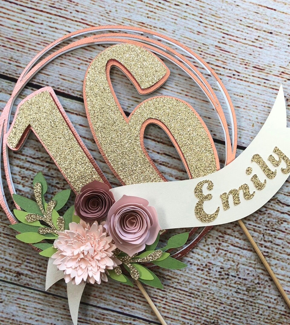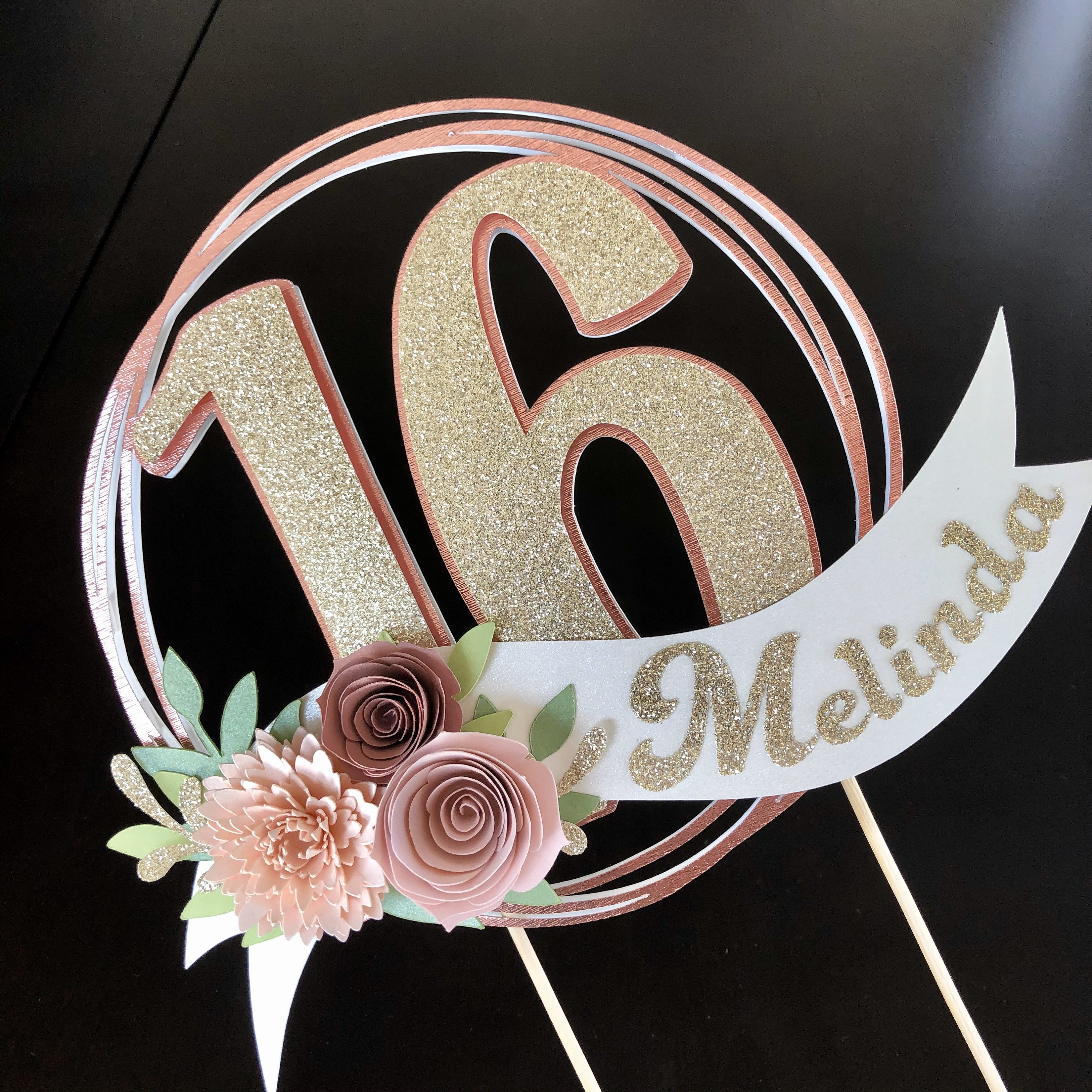 *Cake topper features a rose gold wreath with a gold glitter number 16 in the center, outlined in rose gold. Topper is embellished with a cream colored ribbon banner at the base, which features a floral arrangement in light pink and dusty pink tones, and the name in gold glitter letters. Back of the topper is plain white cardstock.