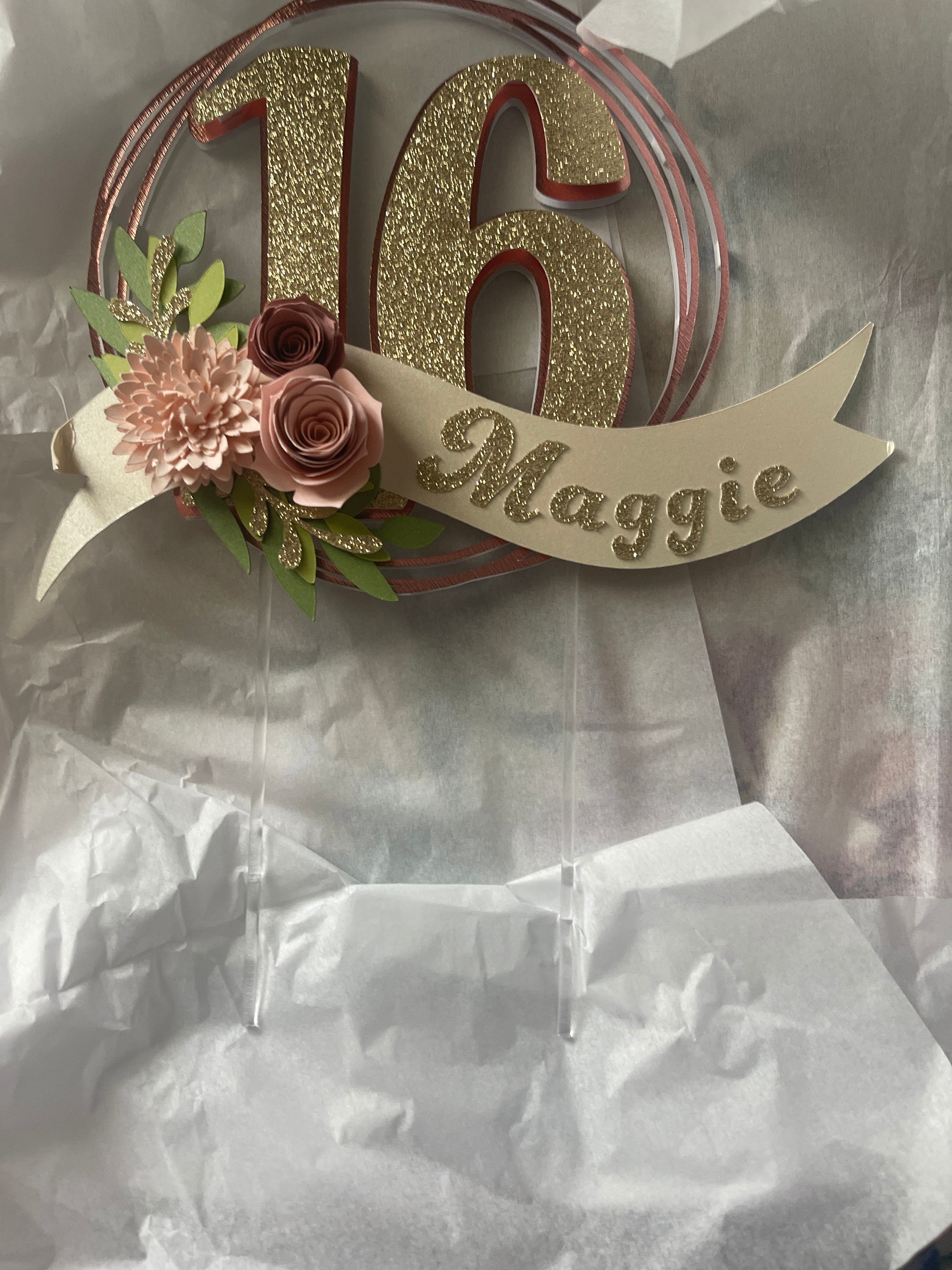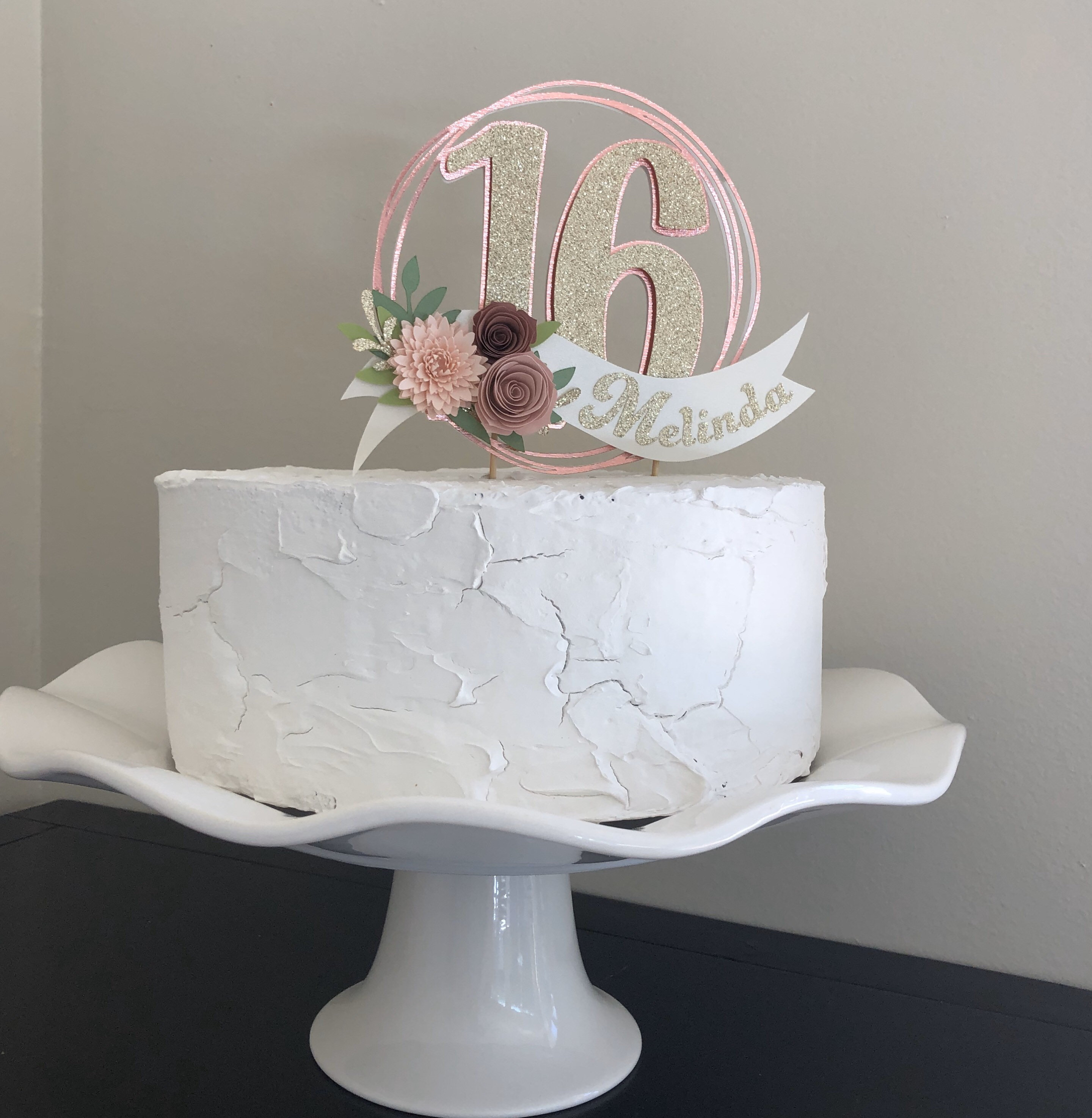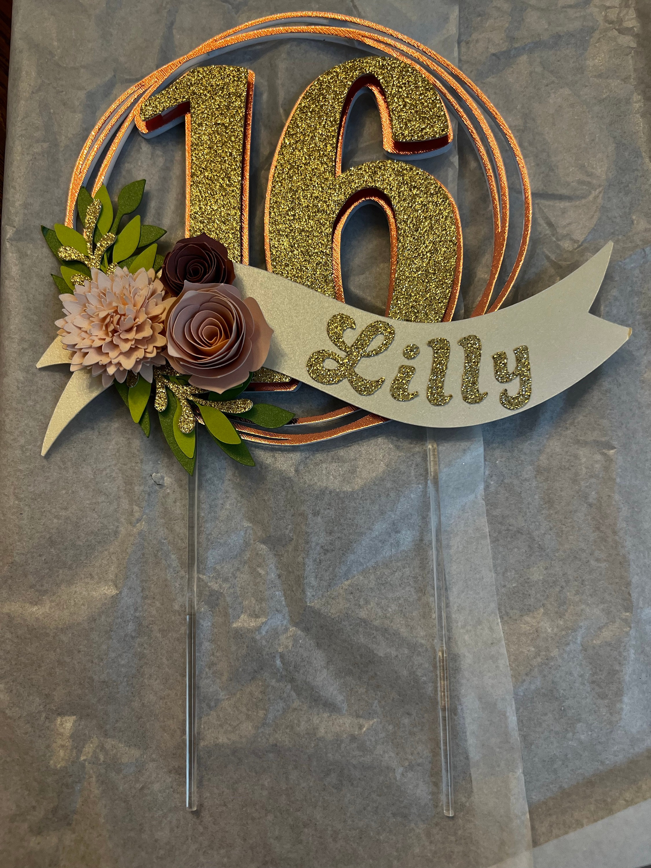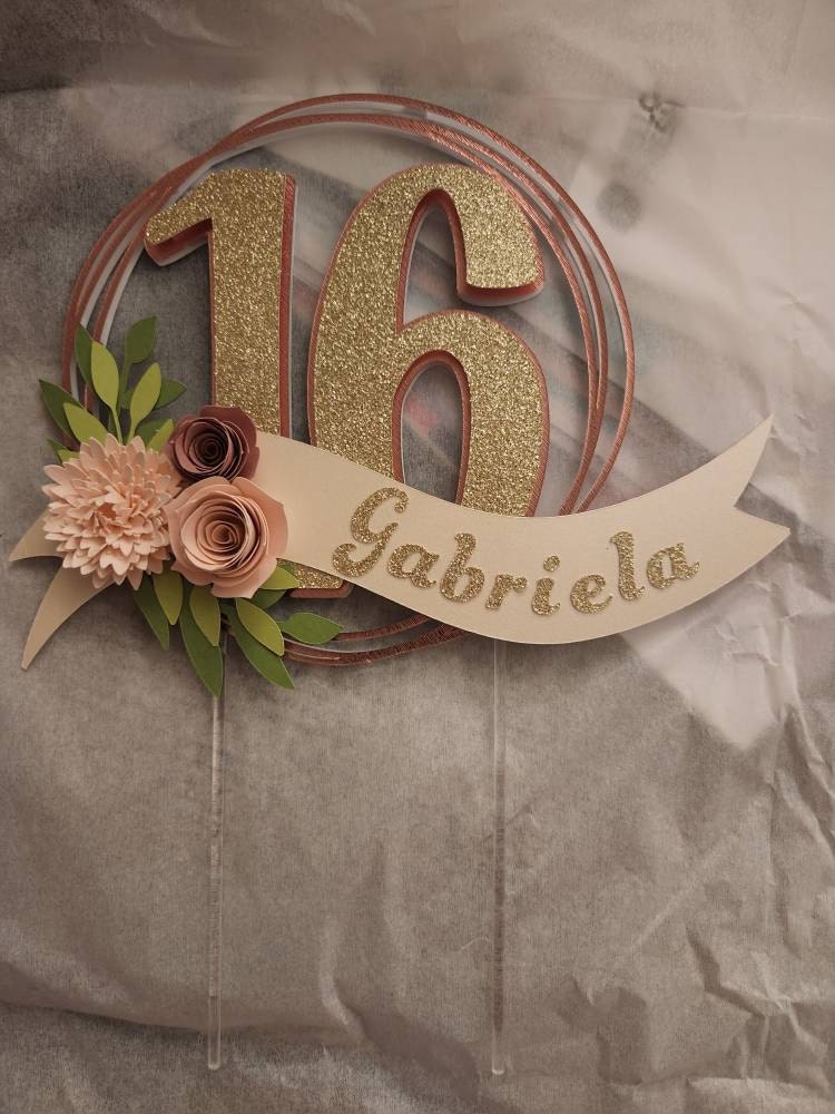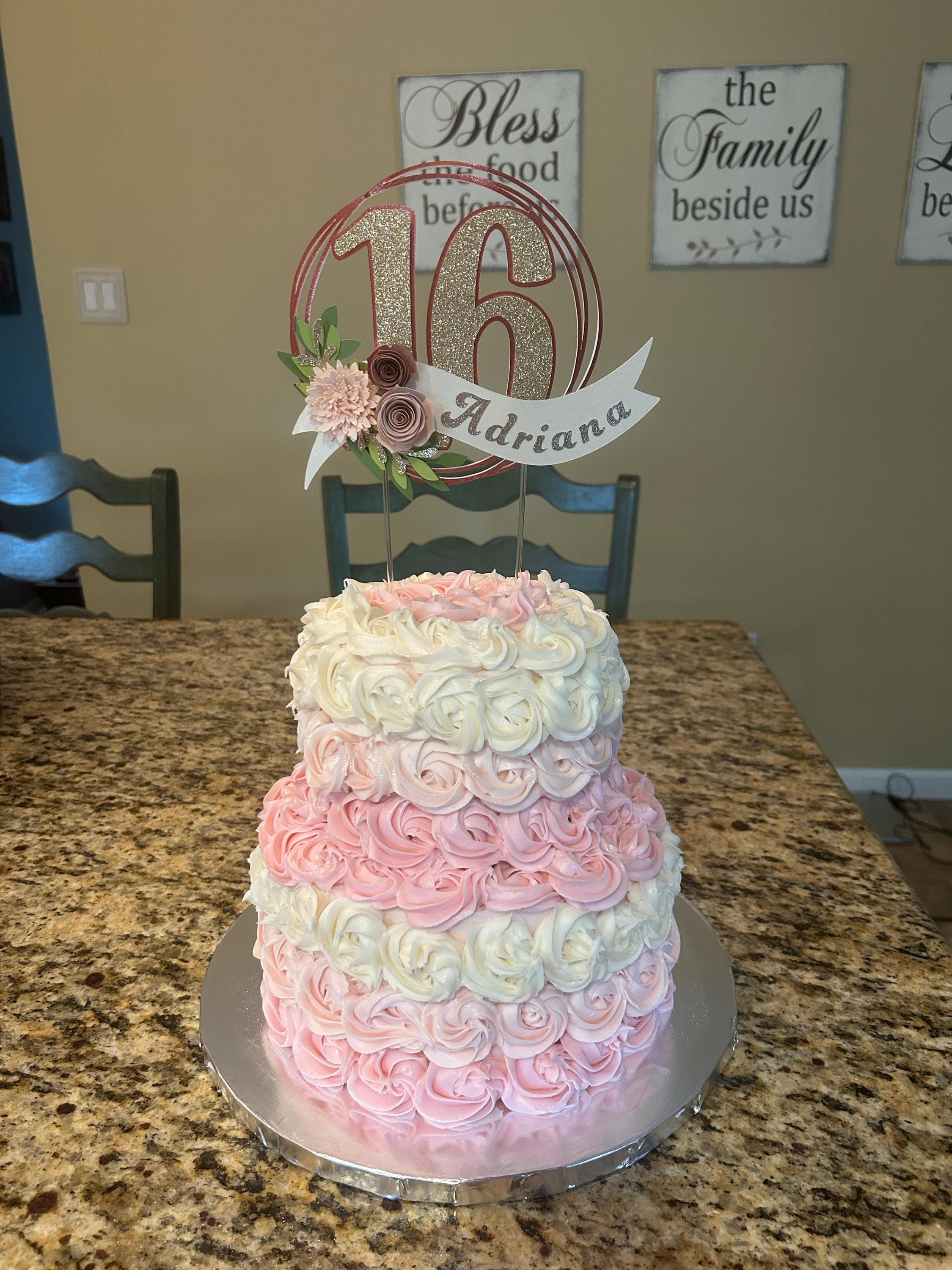 *Cake topper features a rose gold wreath with a gold glitter number 16 in the center, outlined in rose gold. Topper is embellished with a cream colored ribbon banner at the base, which features a floral arrangement in light pink and dusty pink tones, and the name in gold glitter letters. Back of the topper is plain white cardstock.