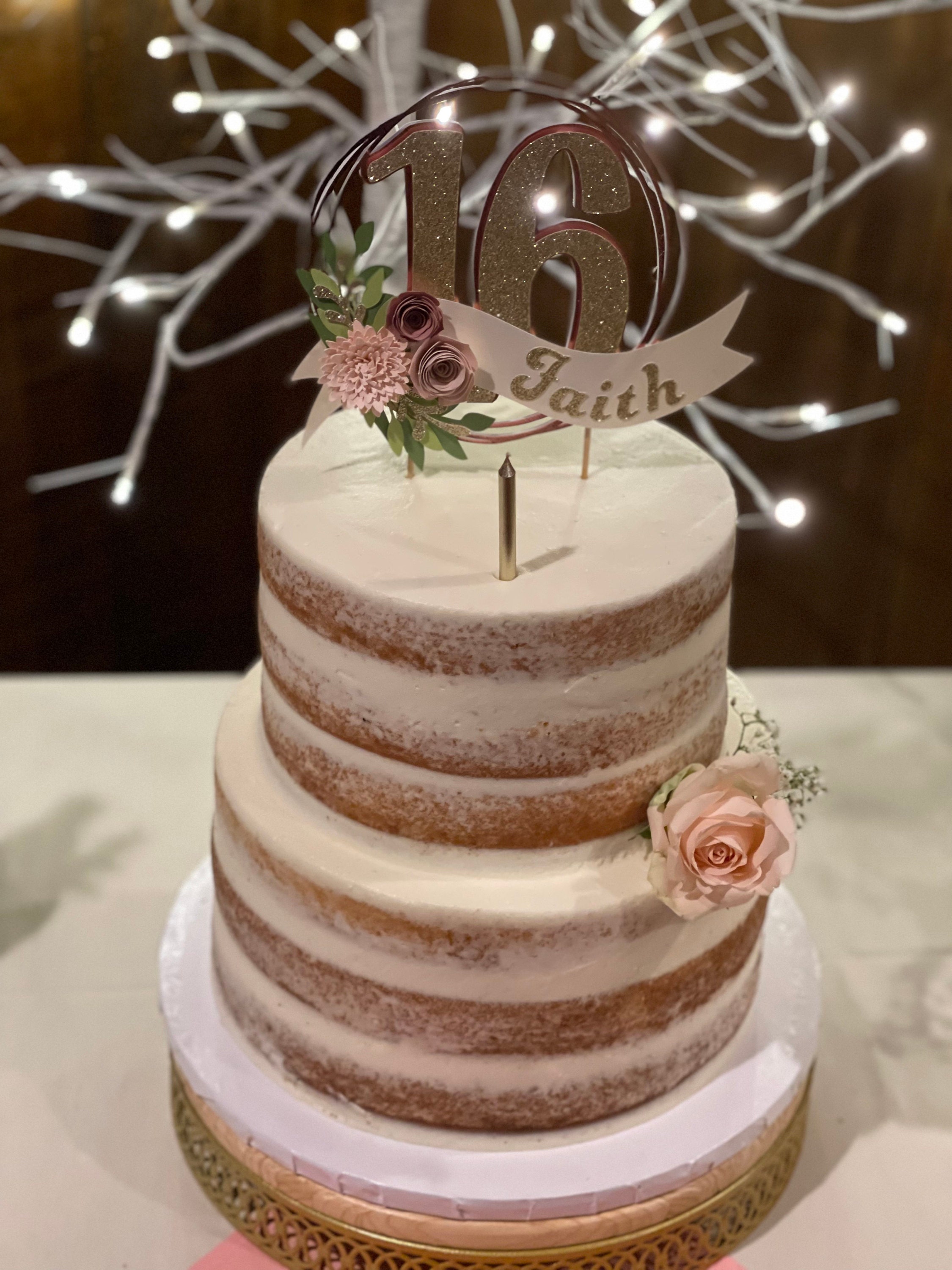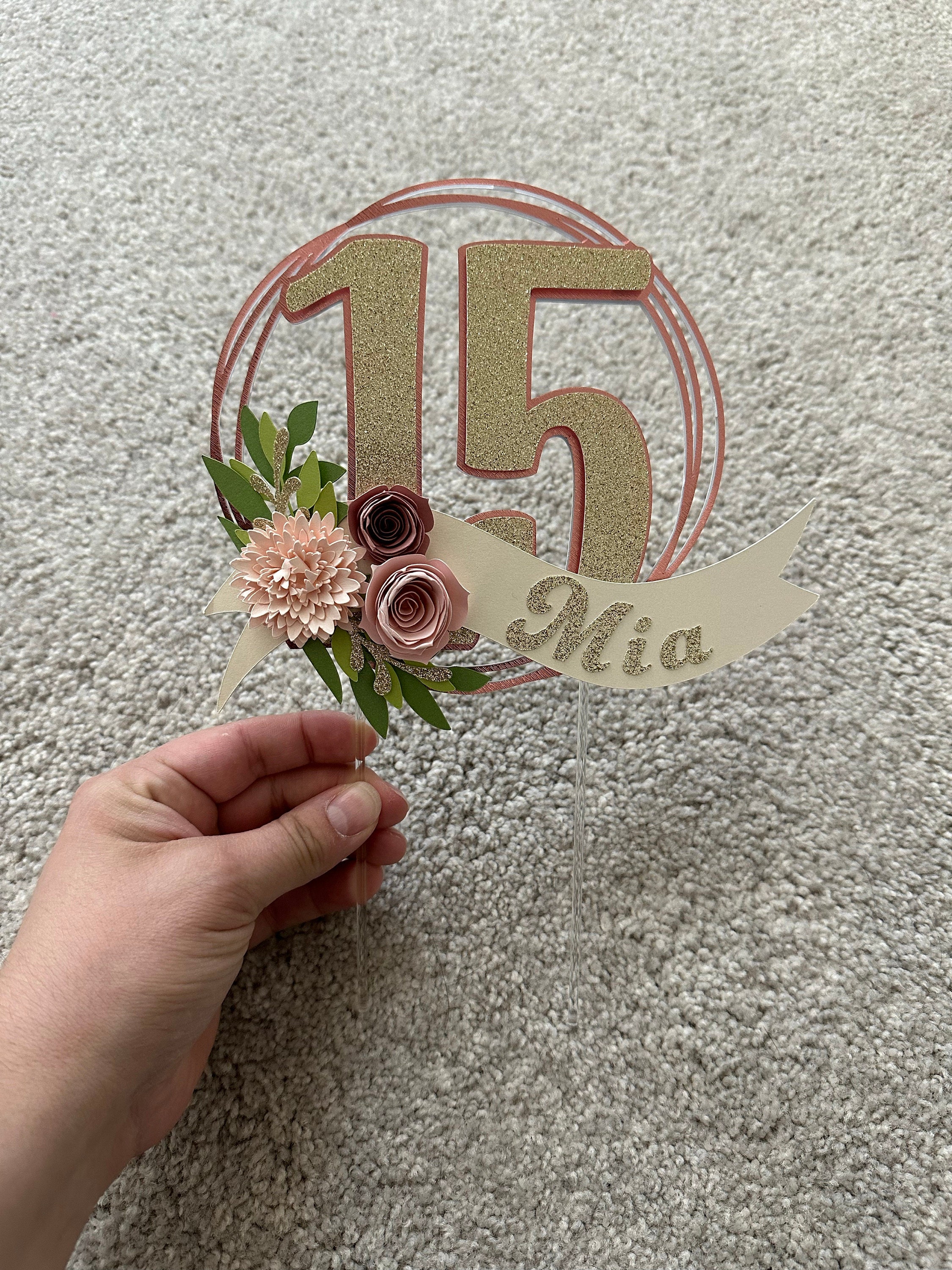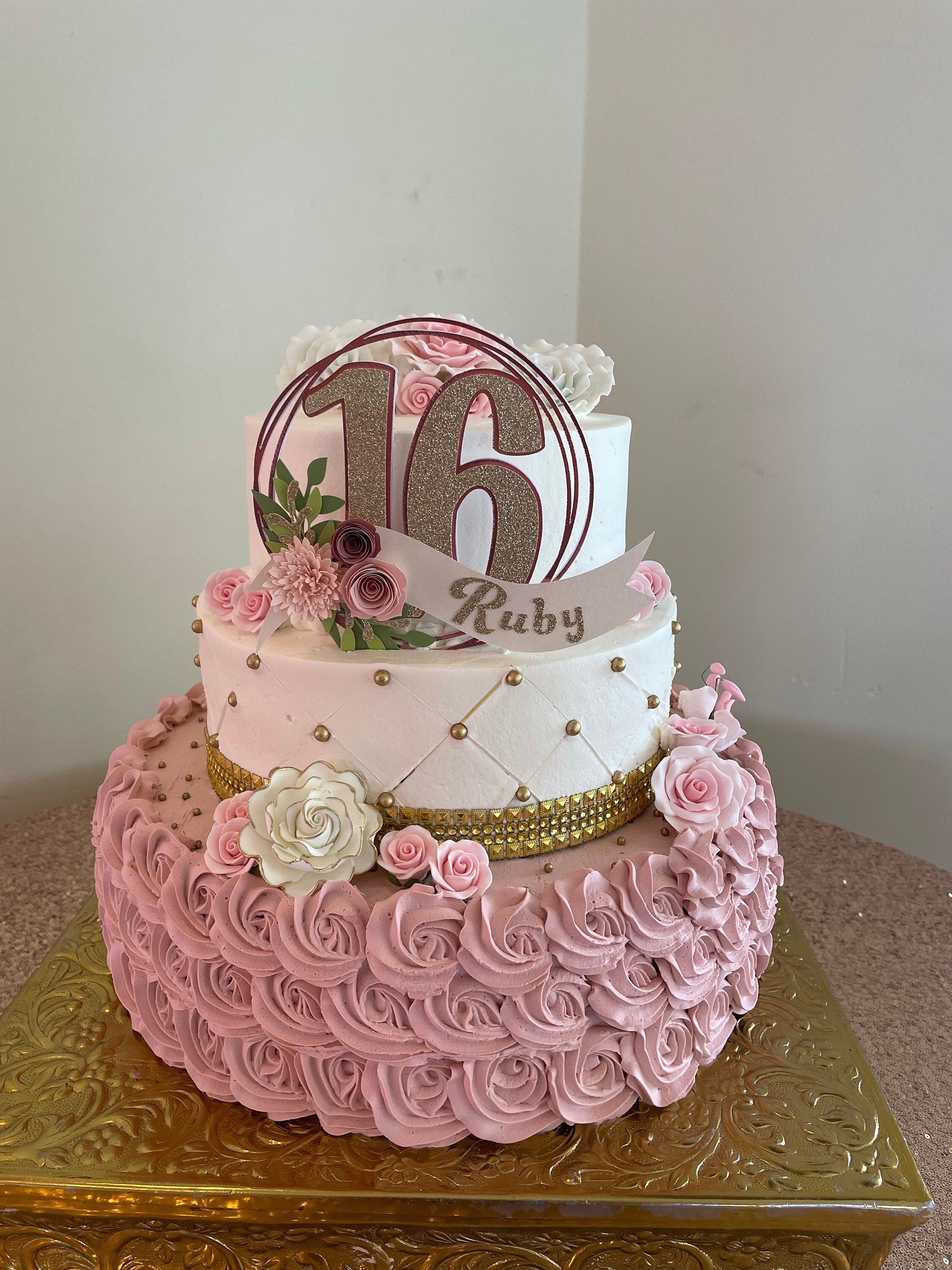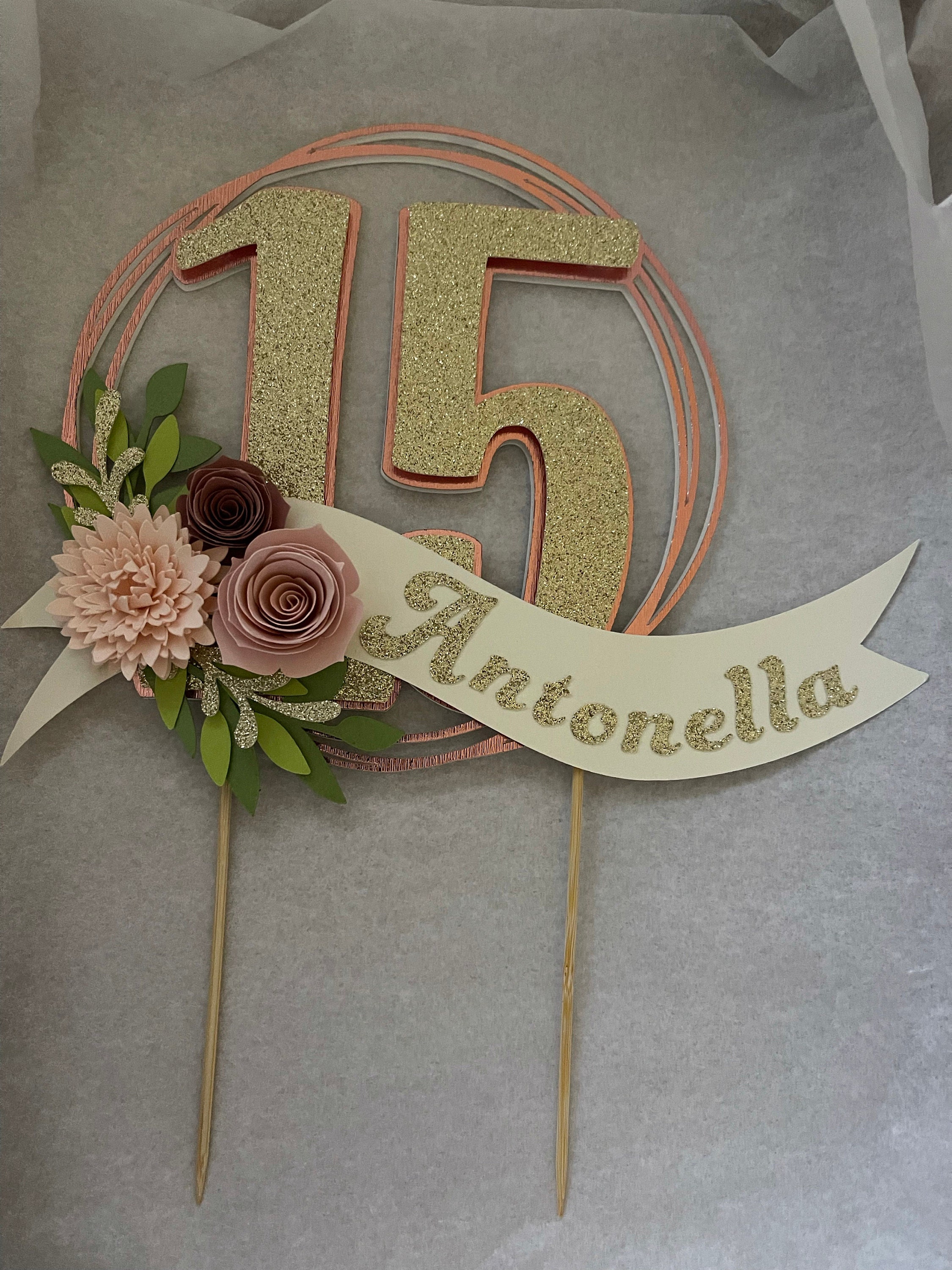 *Cake topper features a rose gold wreath with a gold glitter number 16 in the center, outlined in rose gold. Topper is embellished with a cream colored ribbon banner at the base, which features a floral arrangement in light pink and dusty pink tones, and the name in gold glitter letters. Back of the topper is plain white cardstock.