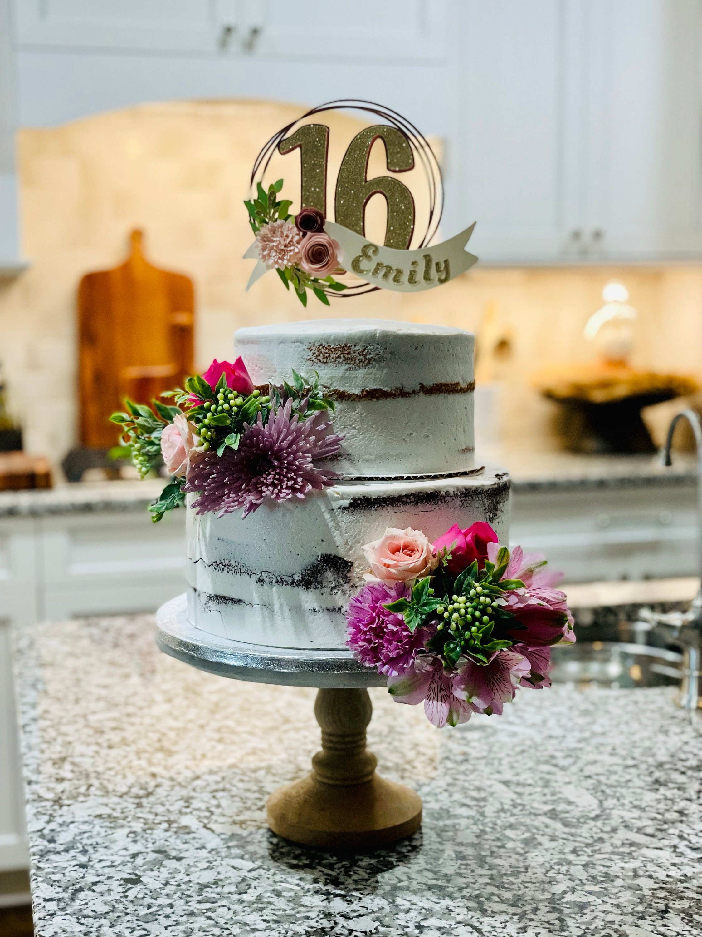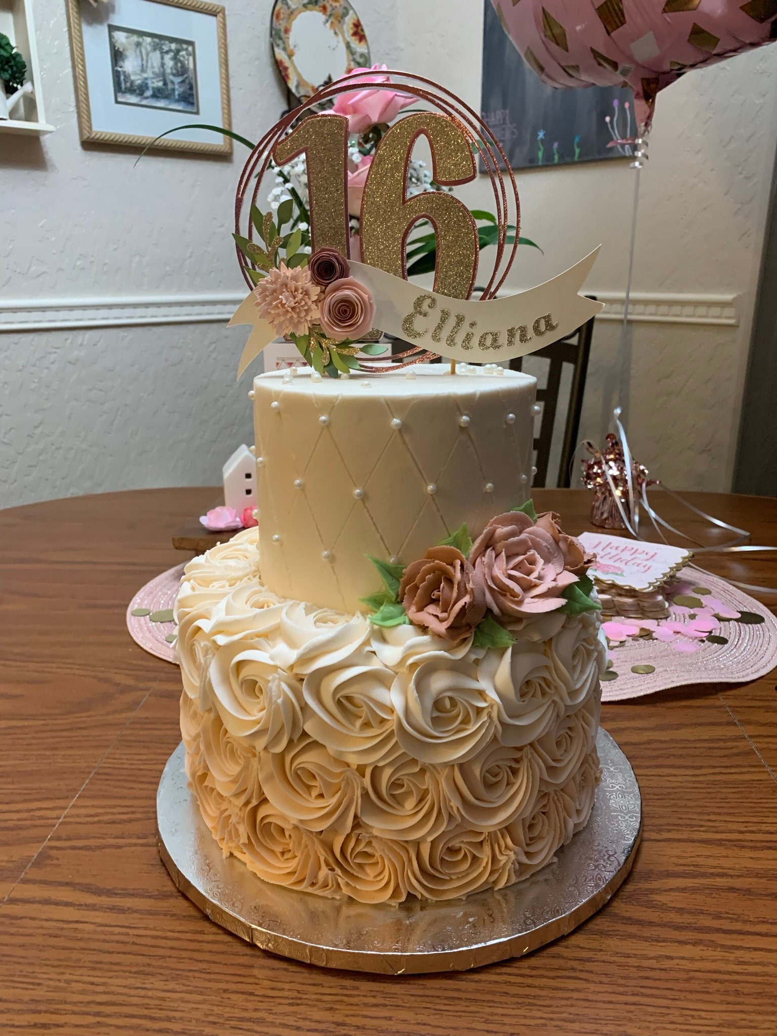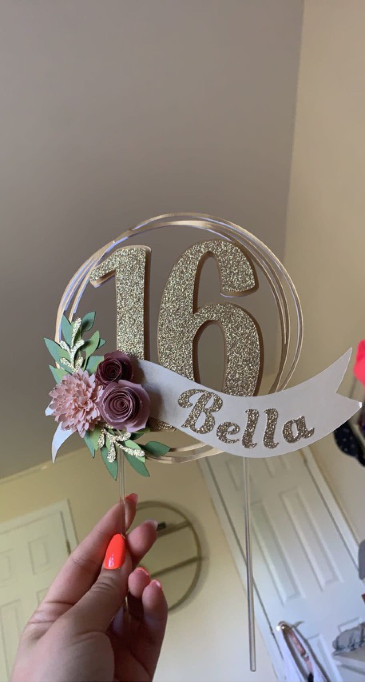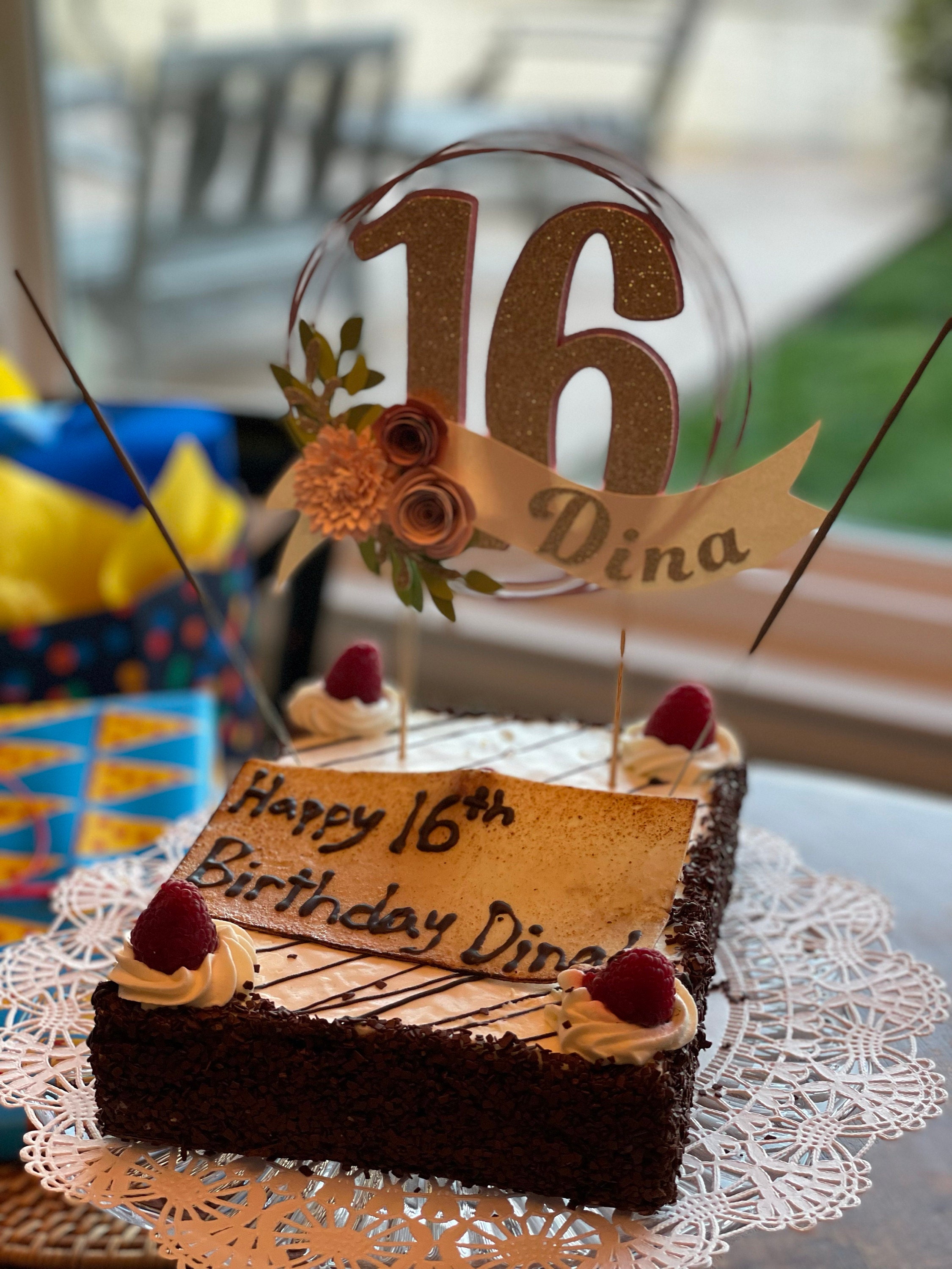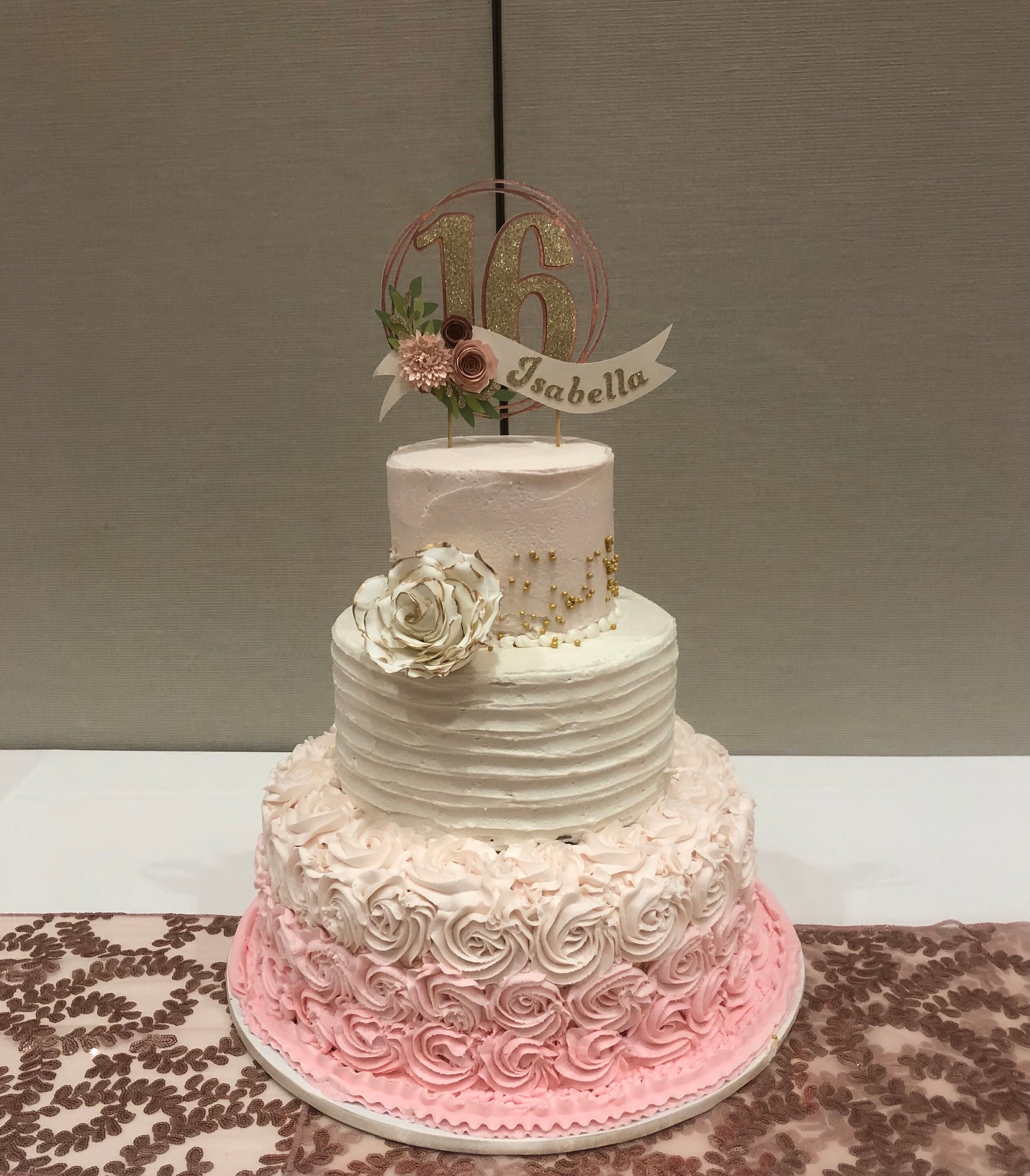 *Cake topper features a rose gold wreath with a gold glitter number 16 in the center, outlined in rose gold. Topper is embellished with a cream colored ribbon banner at the base, which features a floral arrangement in light pink and dusty pink tones, and the name in gold glitter letters. Back of the topper is plain white cardstock.
