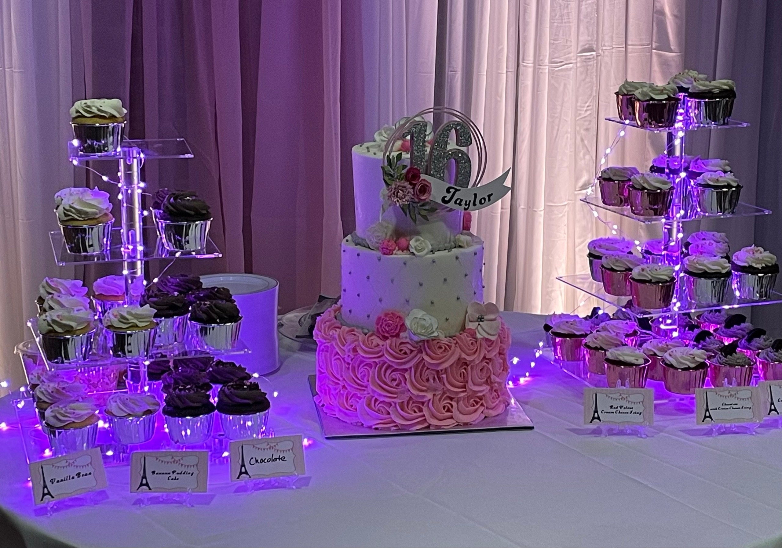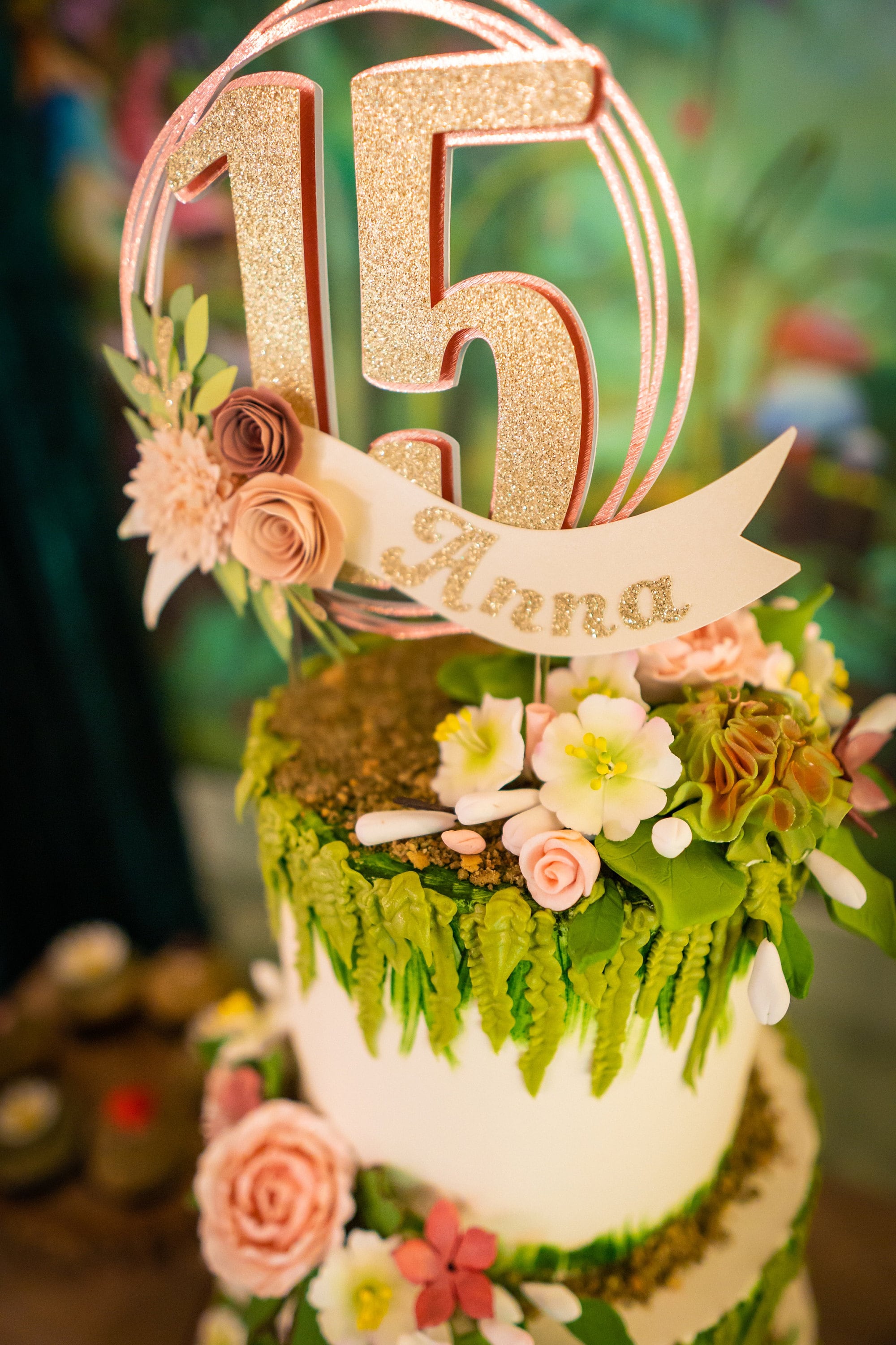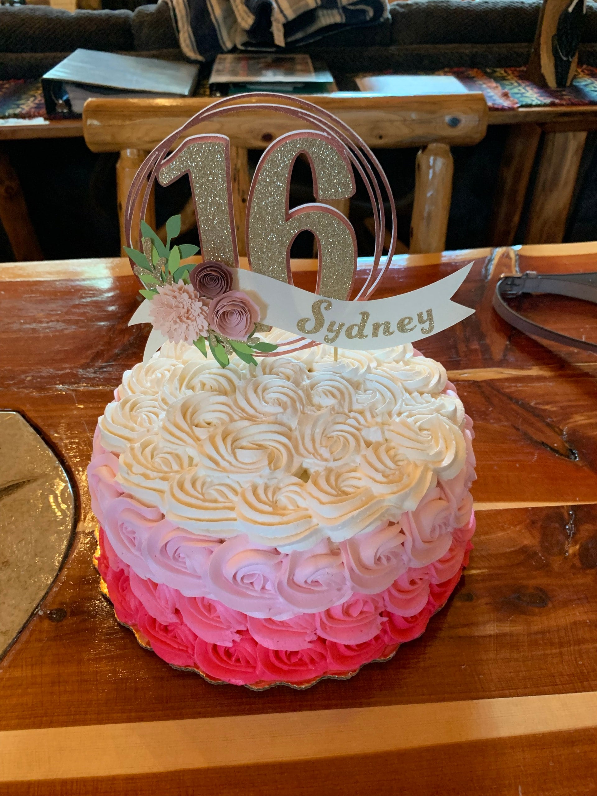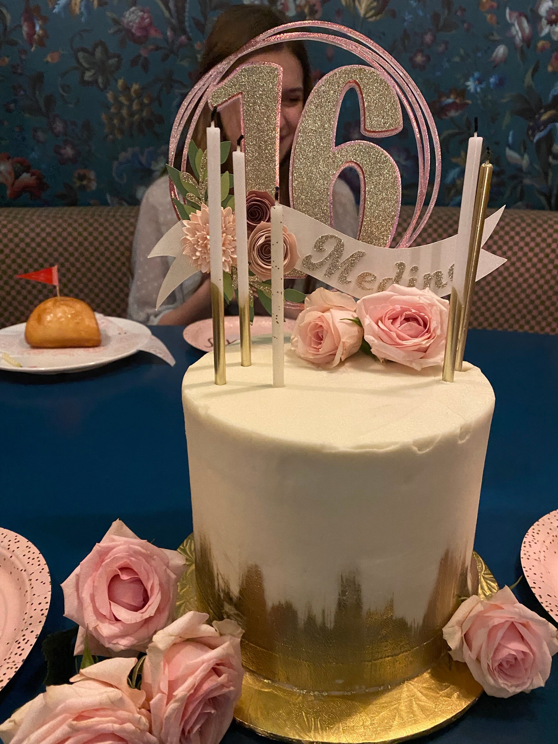 *Cake topper features a rose gold wreath with a gold glitter number 16 in the center, outlined in rose gold. Topper is embellished with a cream colored ribbon banner at the base, which features a floral arrangement in light pink and dusty pink tones, and the name in gold glitter letters. Back of the topper is plain white cardstock.