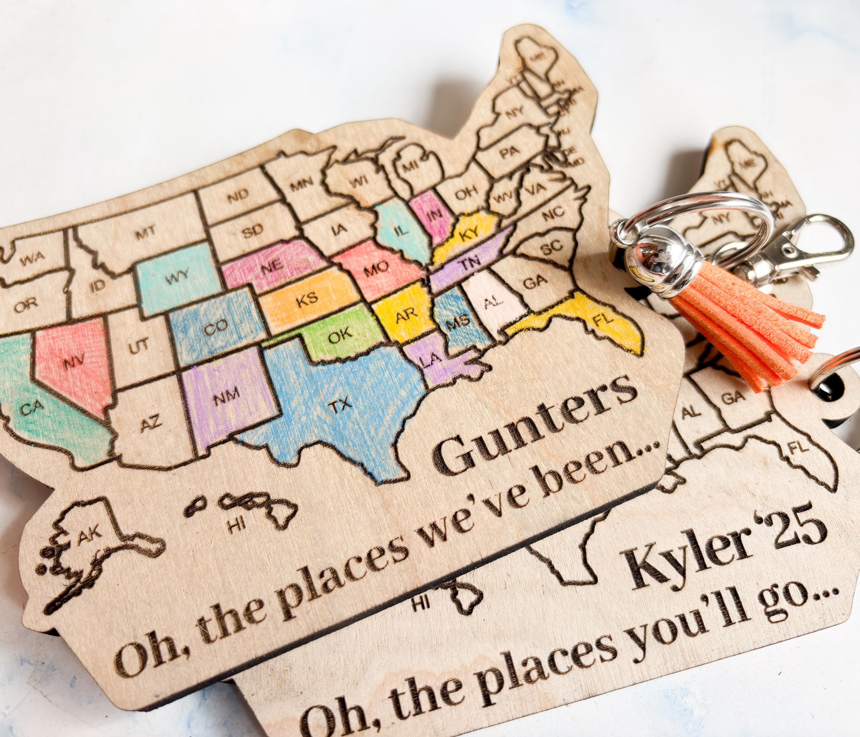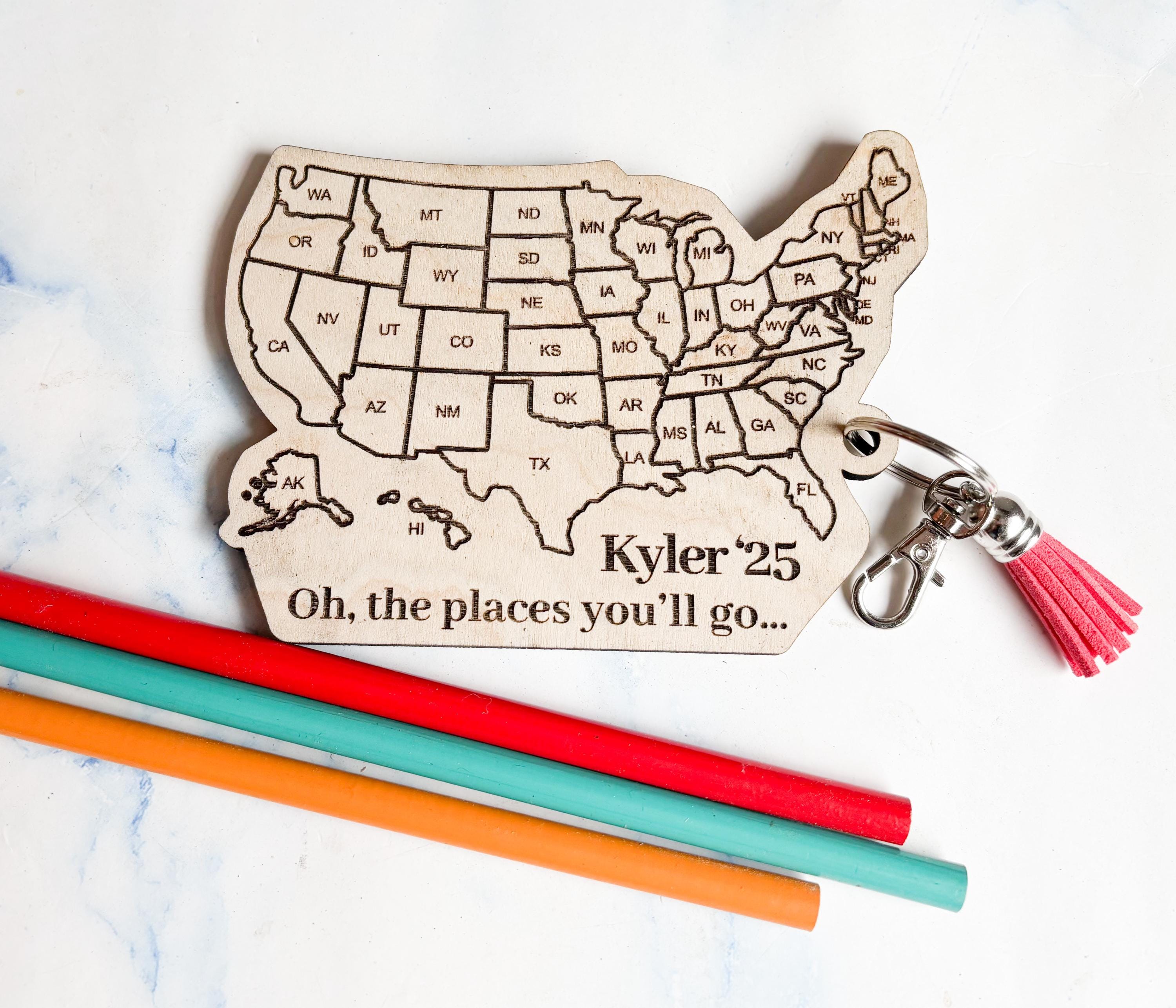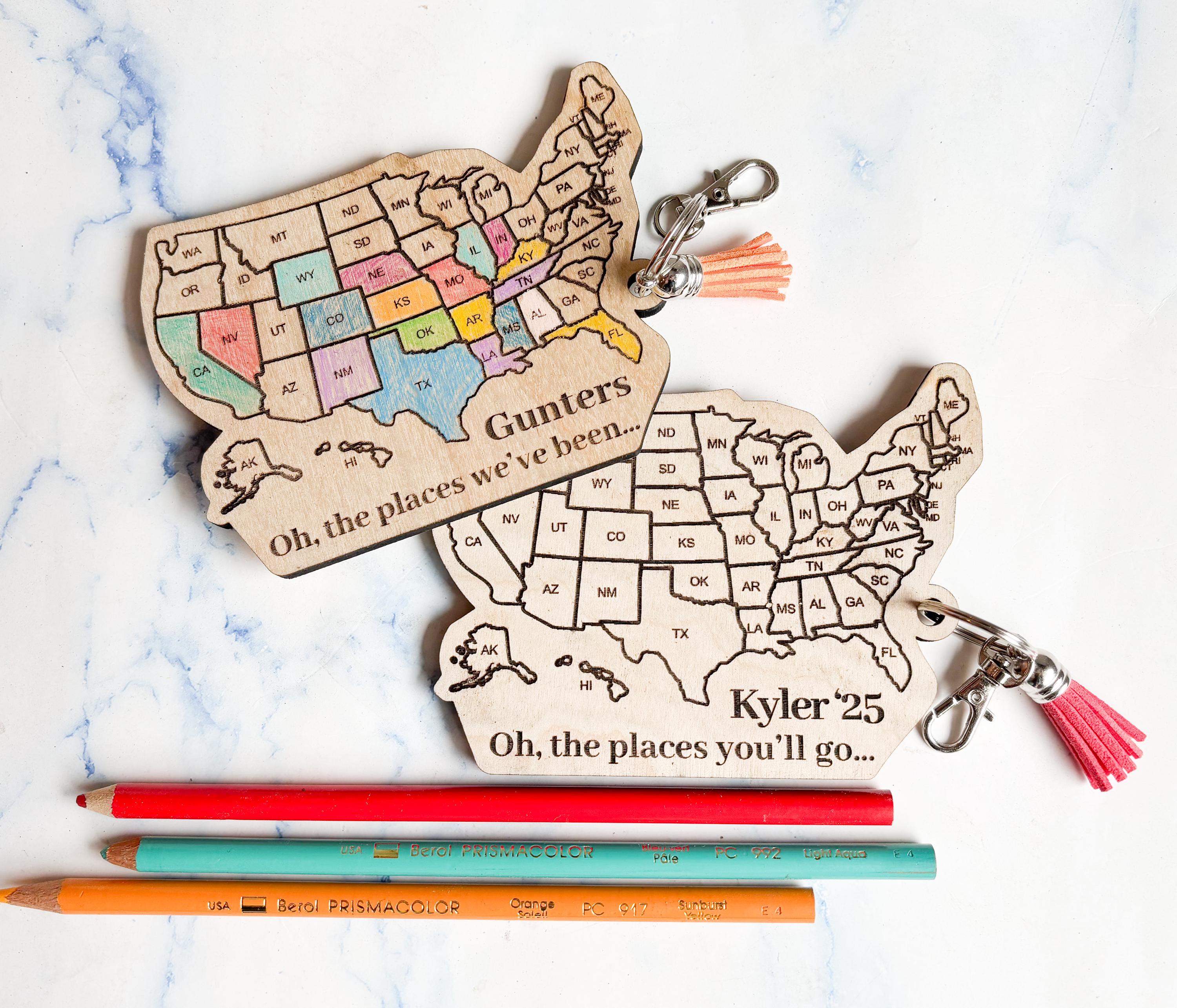 Customize this small laser engraved map to keep track of all the places you will go. Use colored pencils, markers or crayons. This is a great, simple gift for any high school or college graduate. It's also fun for a family to track their family road trips.