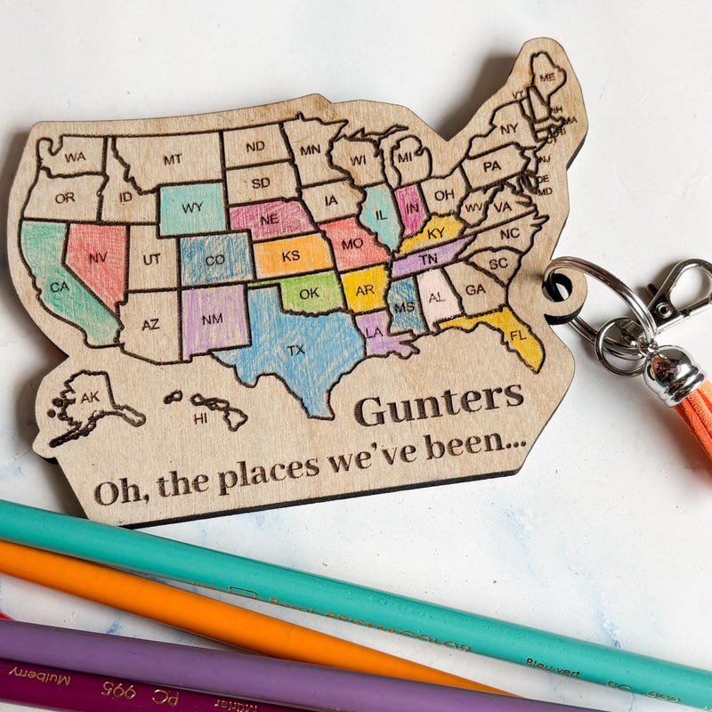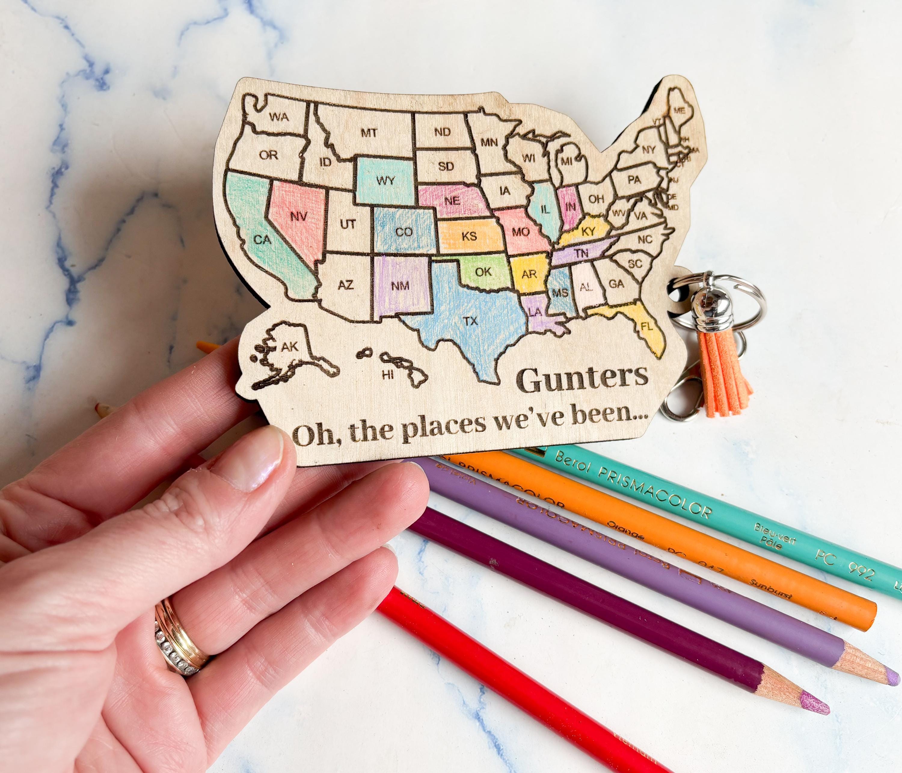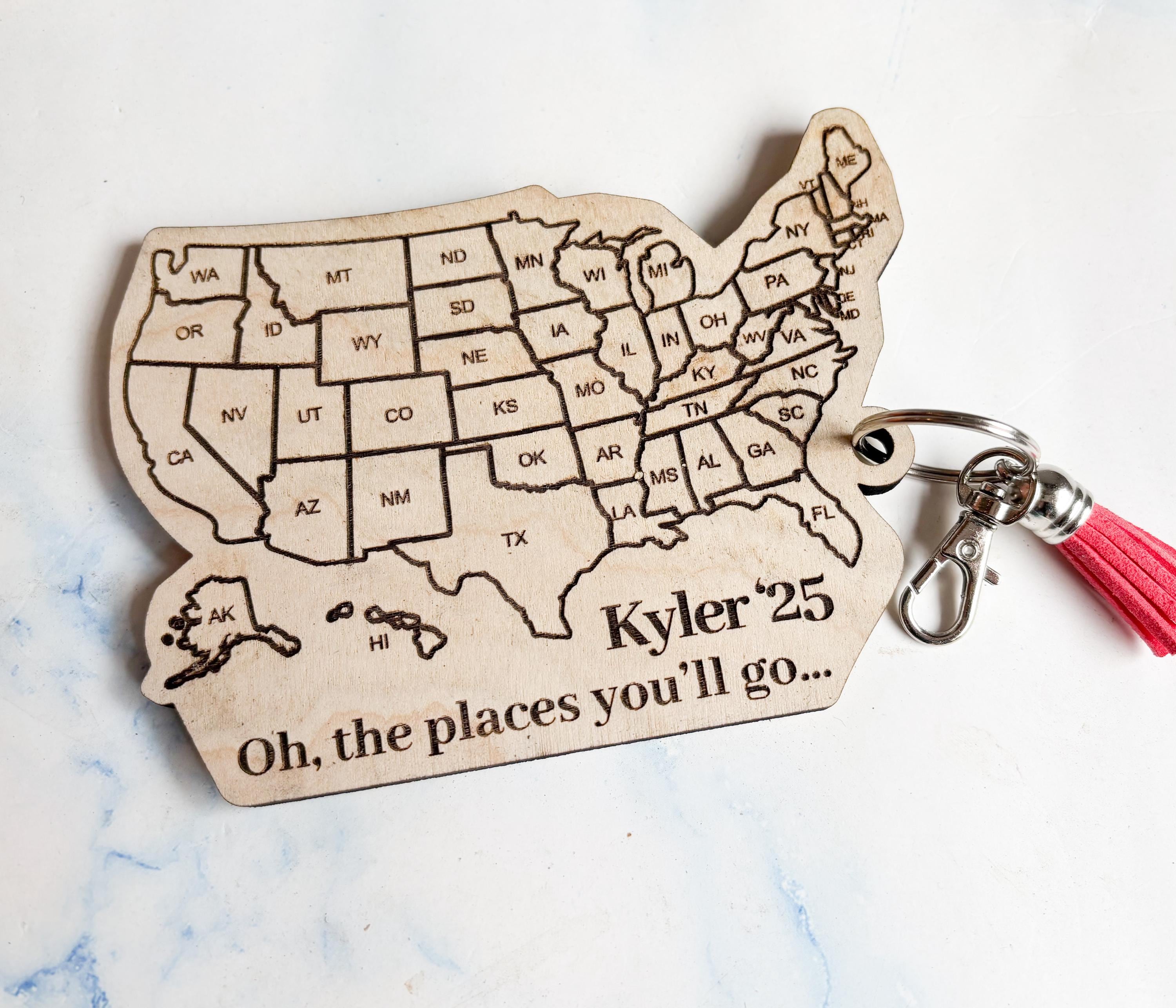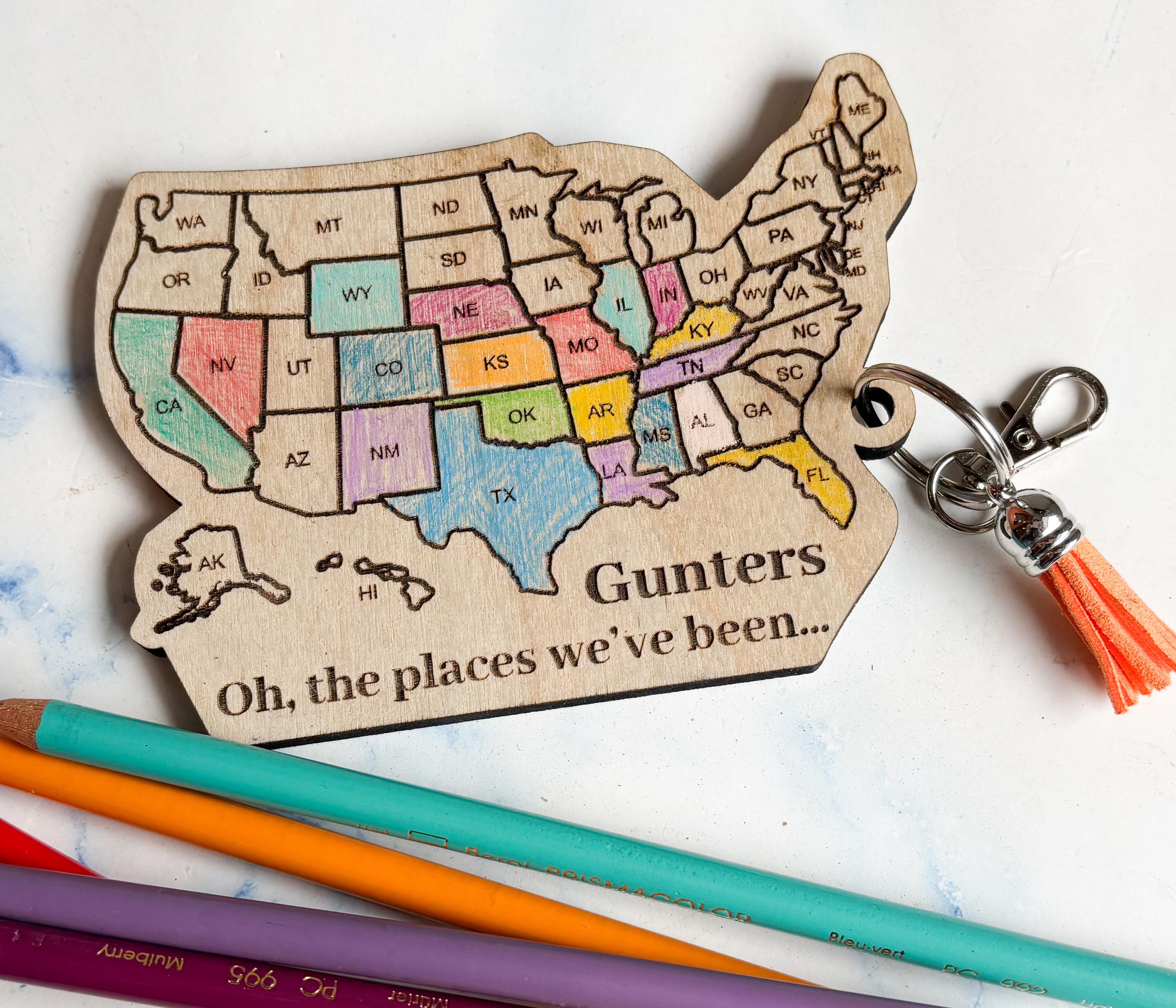 Customize this small laser engraved map to keep track of all the places you will go. Use colored pencils, markers or crayons. This is a great, simple gift for any high school or college graduate. It's also fun for a family to track their family road trips.