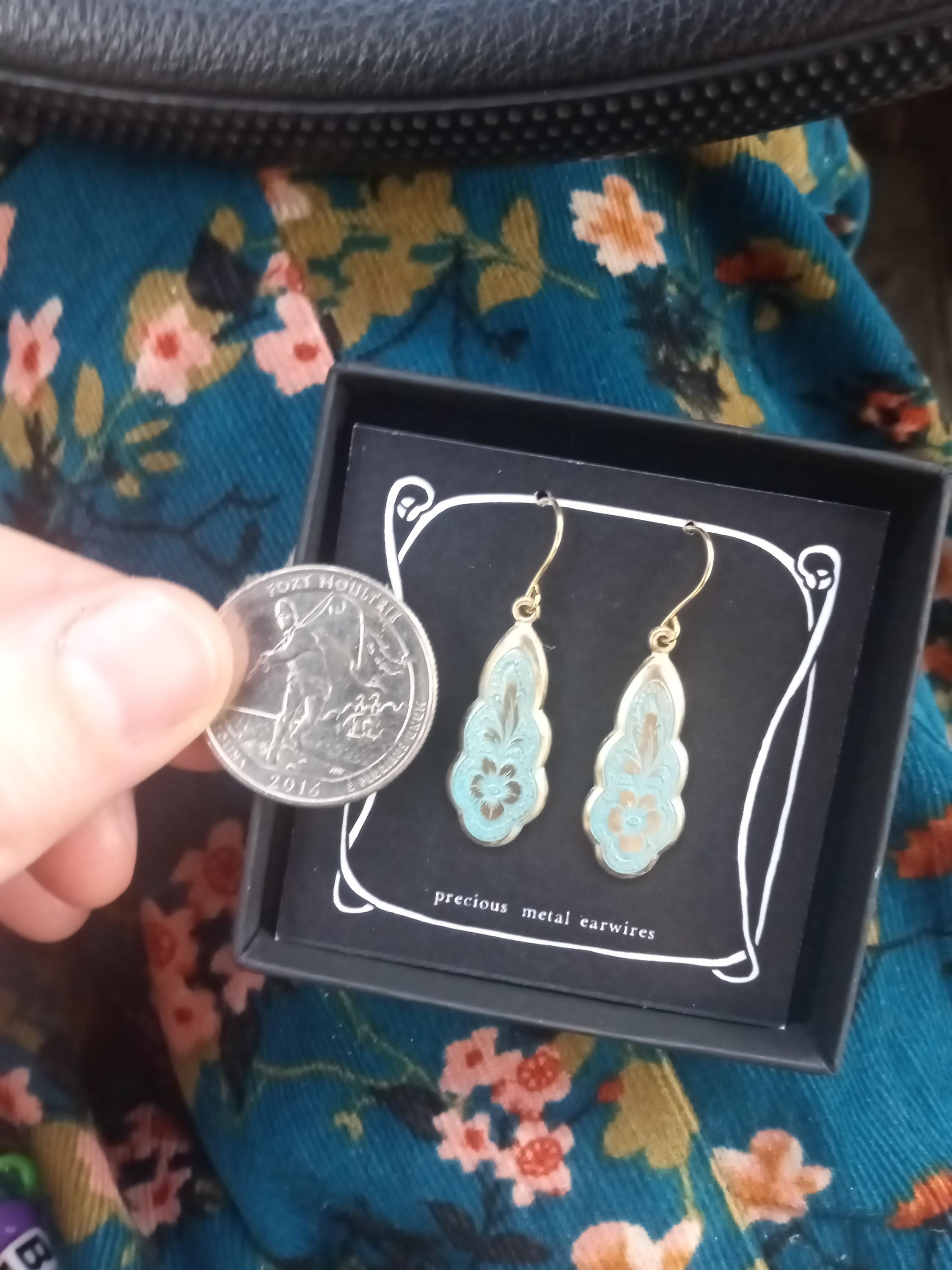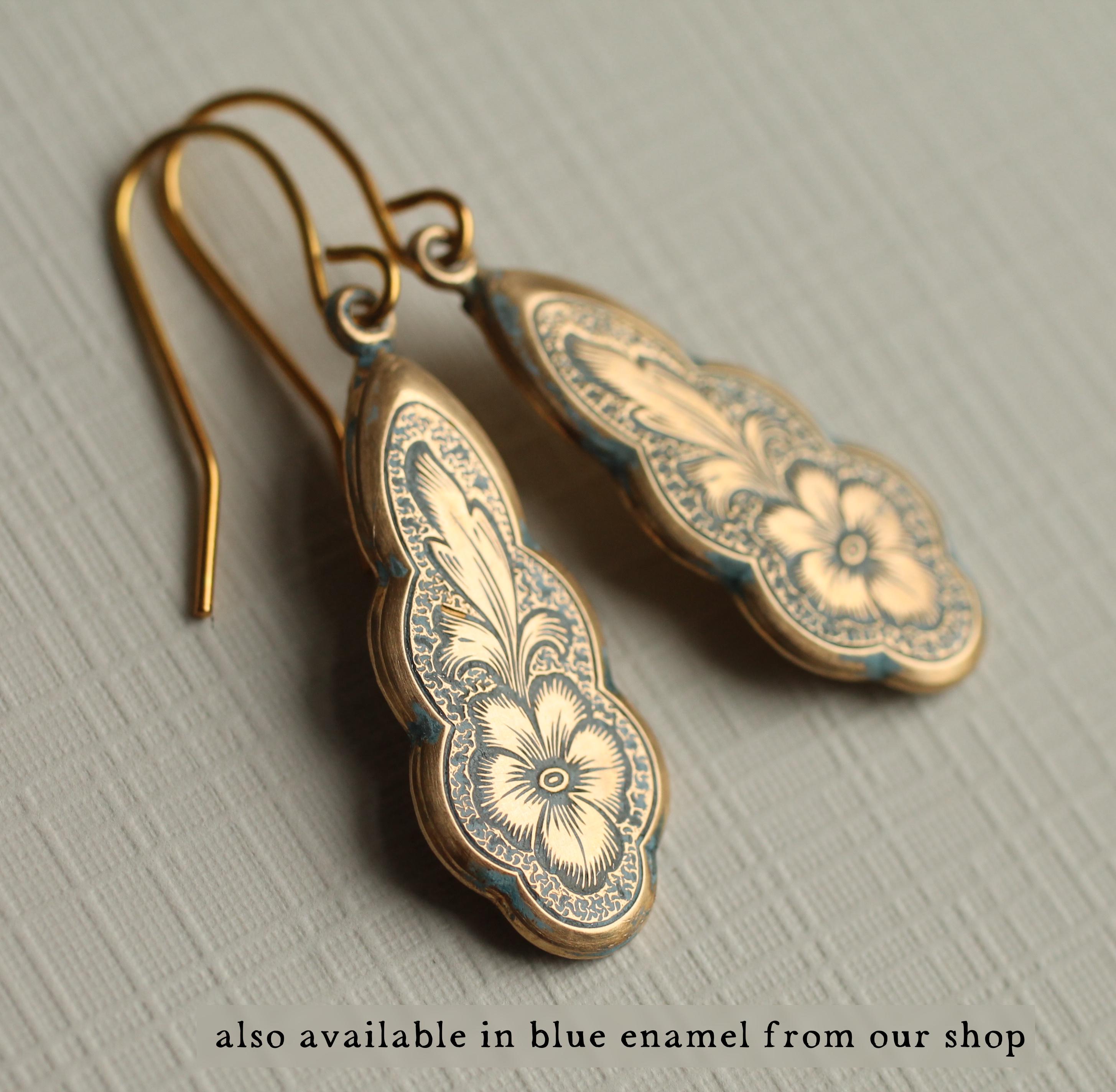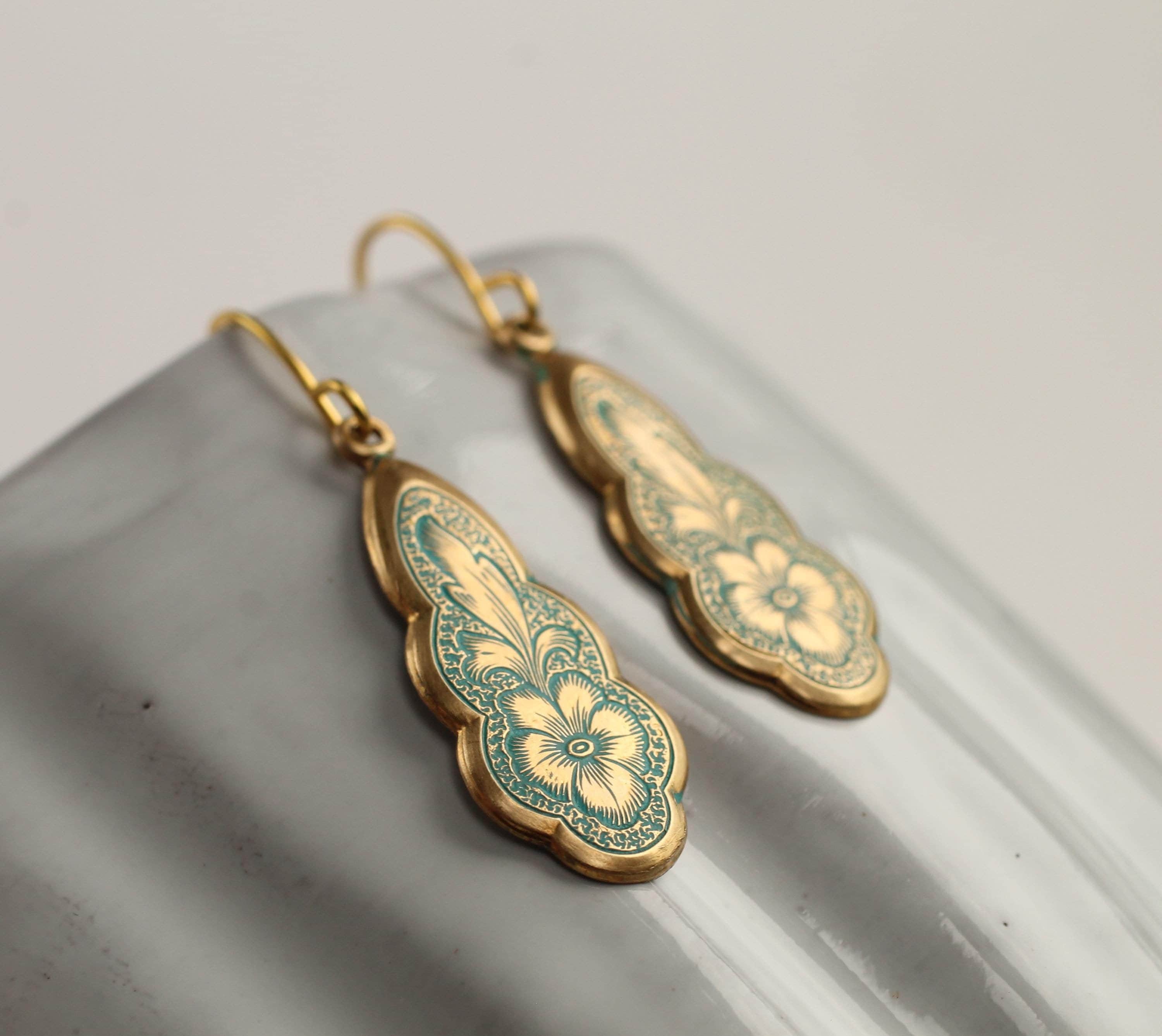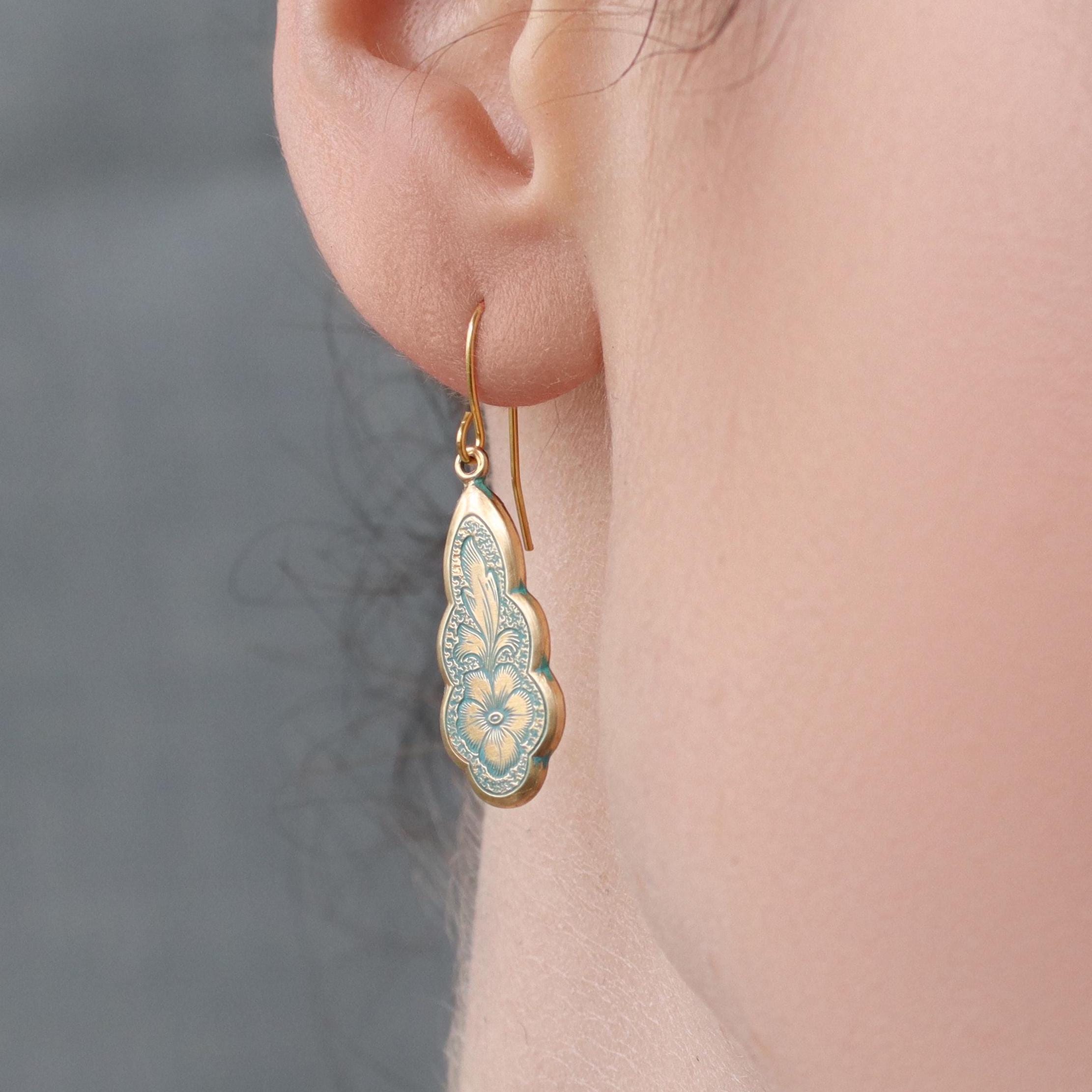 The earring wire is made of gold-plated brass, these earrings measure 35mm (a little over an inch) in length, and the floral pendant is designed to hang just below the earlobe. There are also precious metal earrings available made of gold-plated sterling silver.