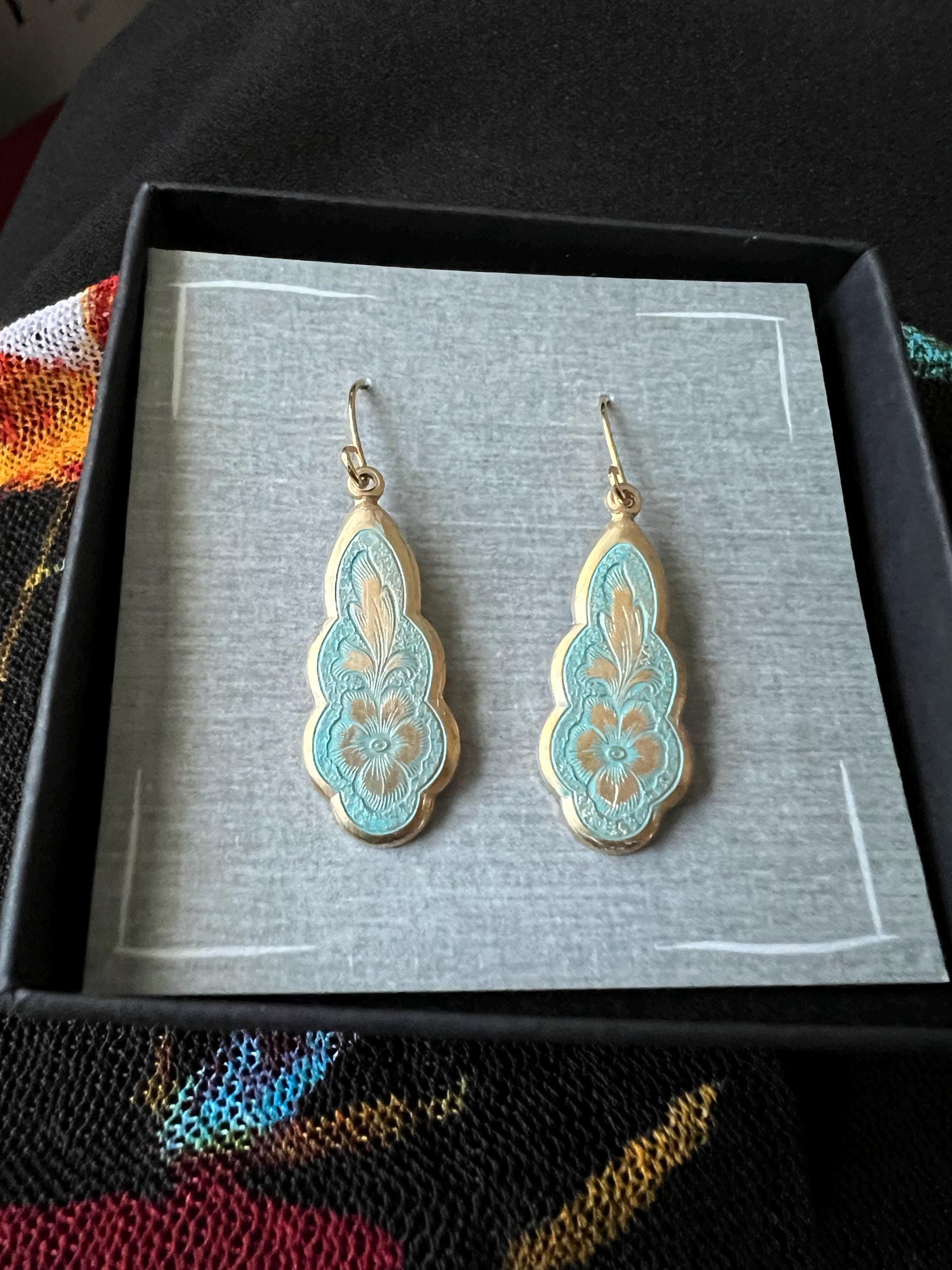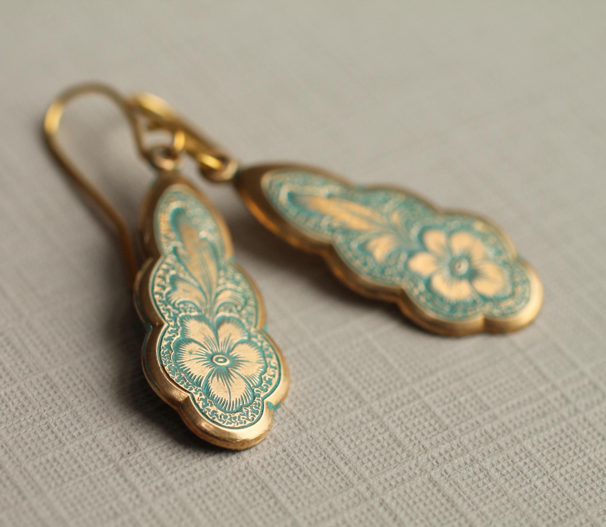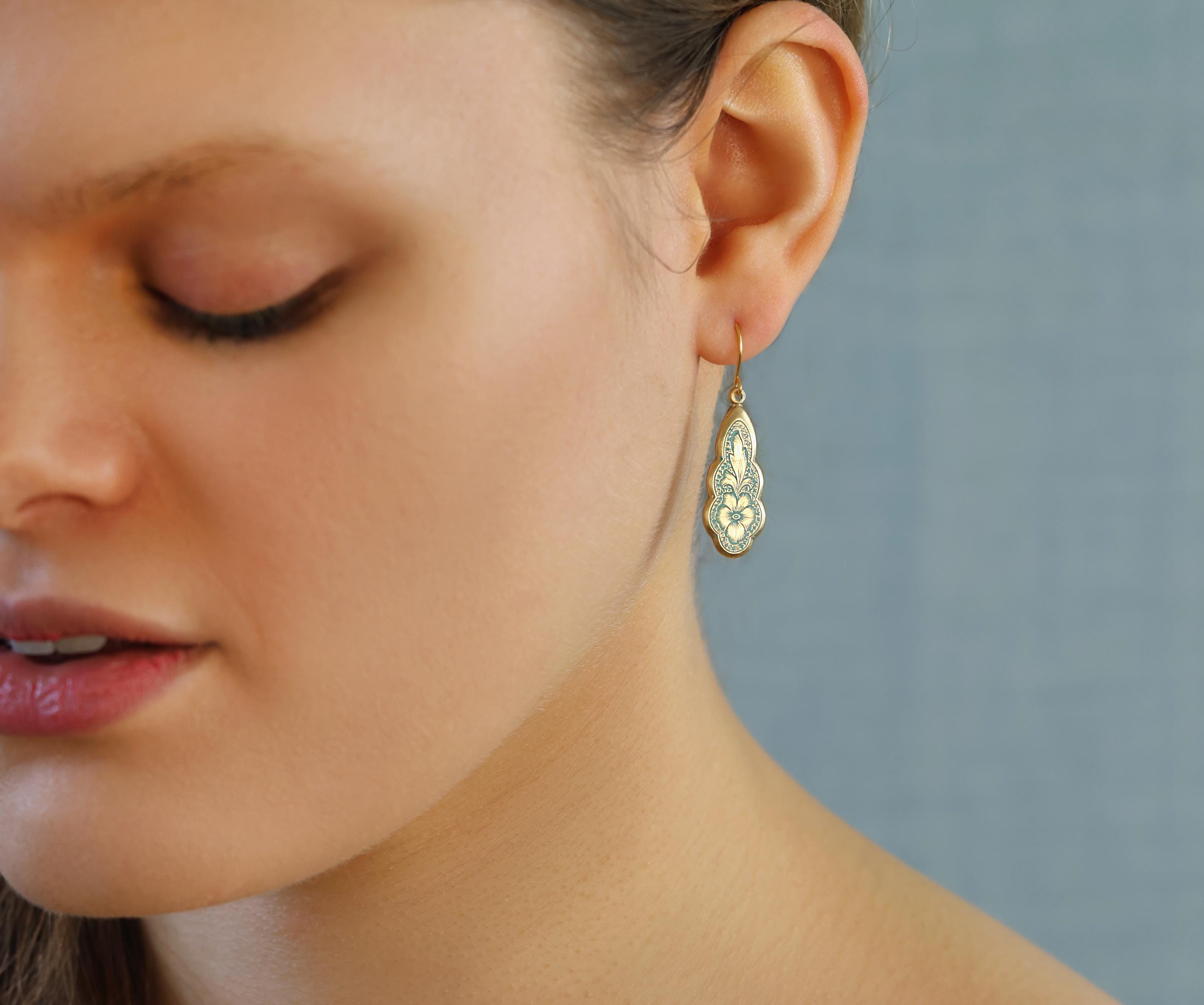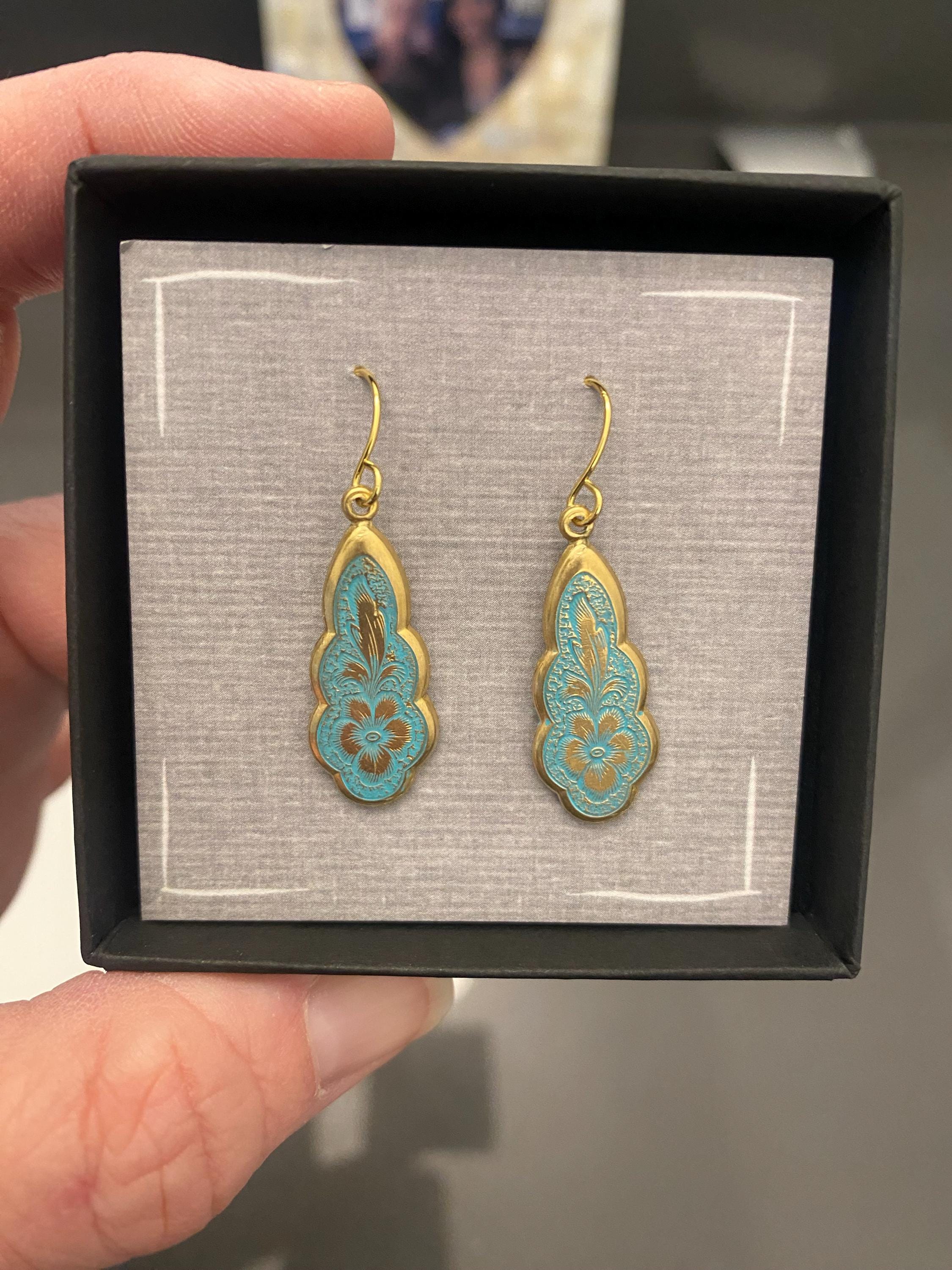 The earring wire is made of gold-plated brass, these earrings measure 35mm (a little over an inch) in length, and the floral pendant is designed to hang just below the earlobe. There are also precious metal earrings available made of gold-plated sterling silver.