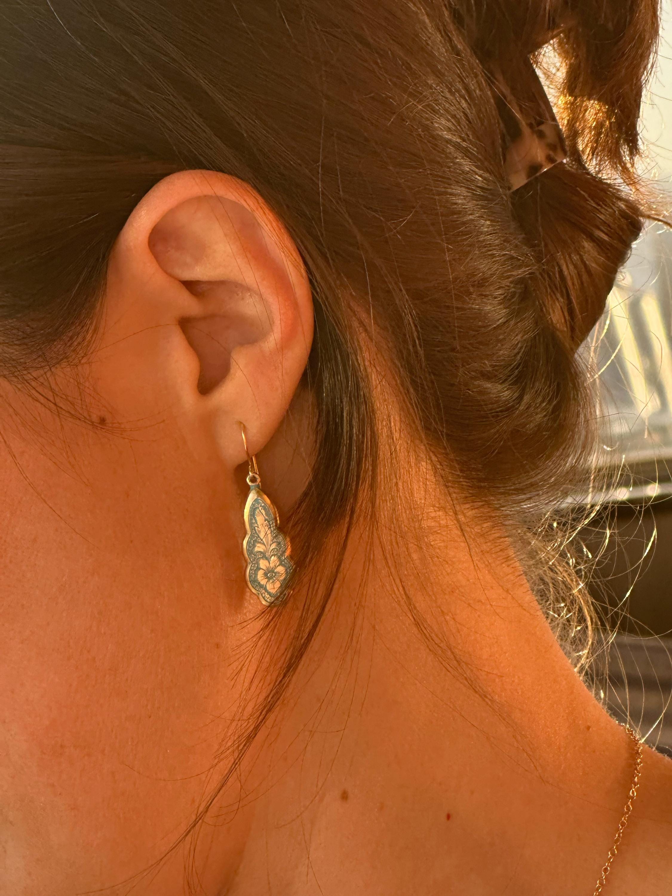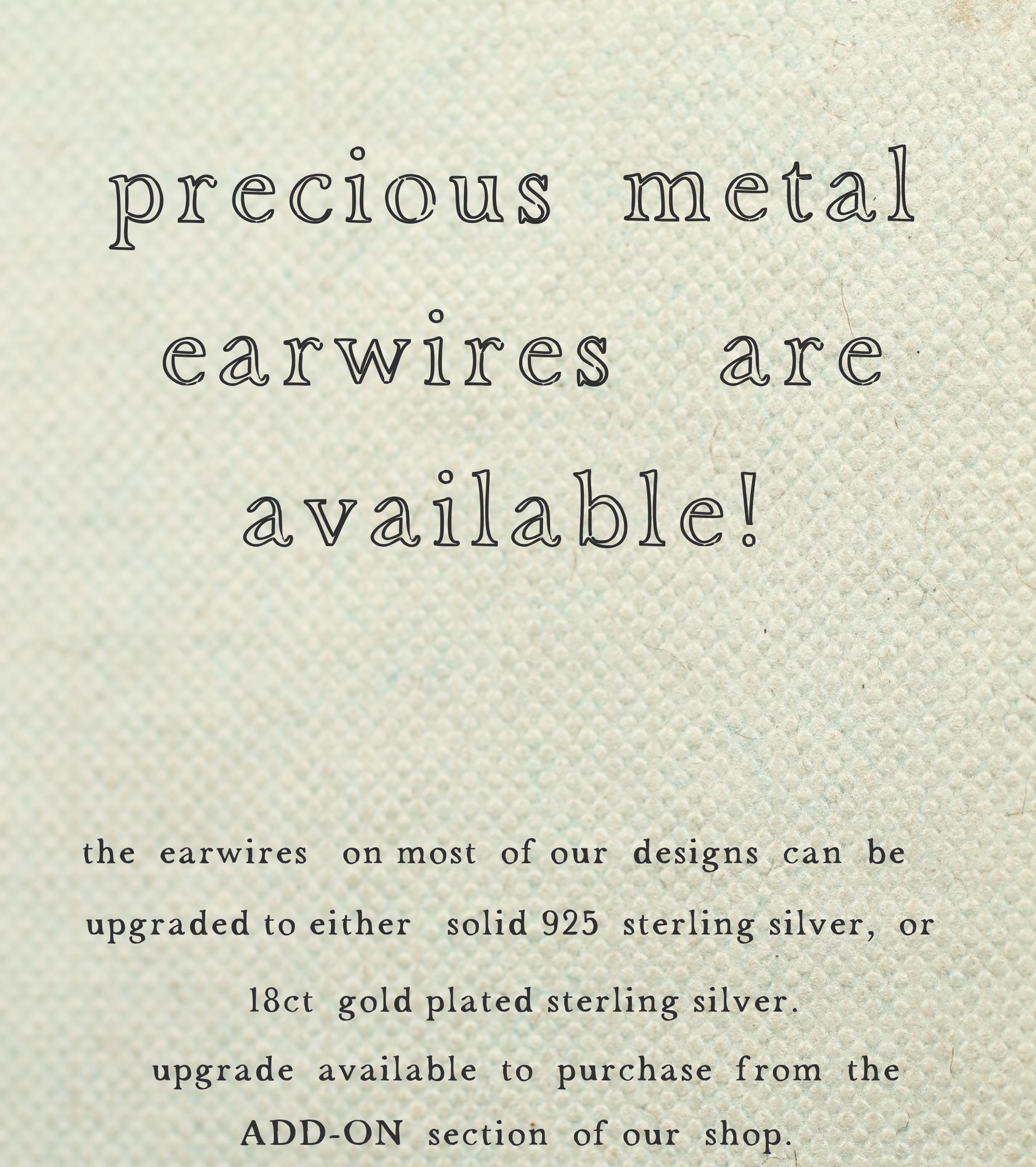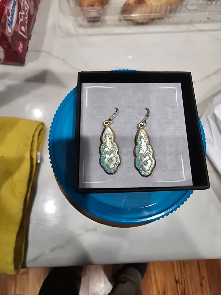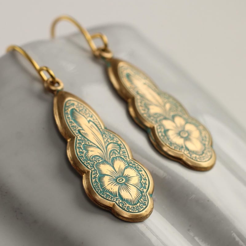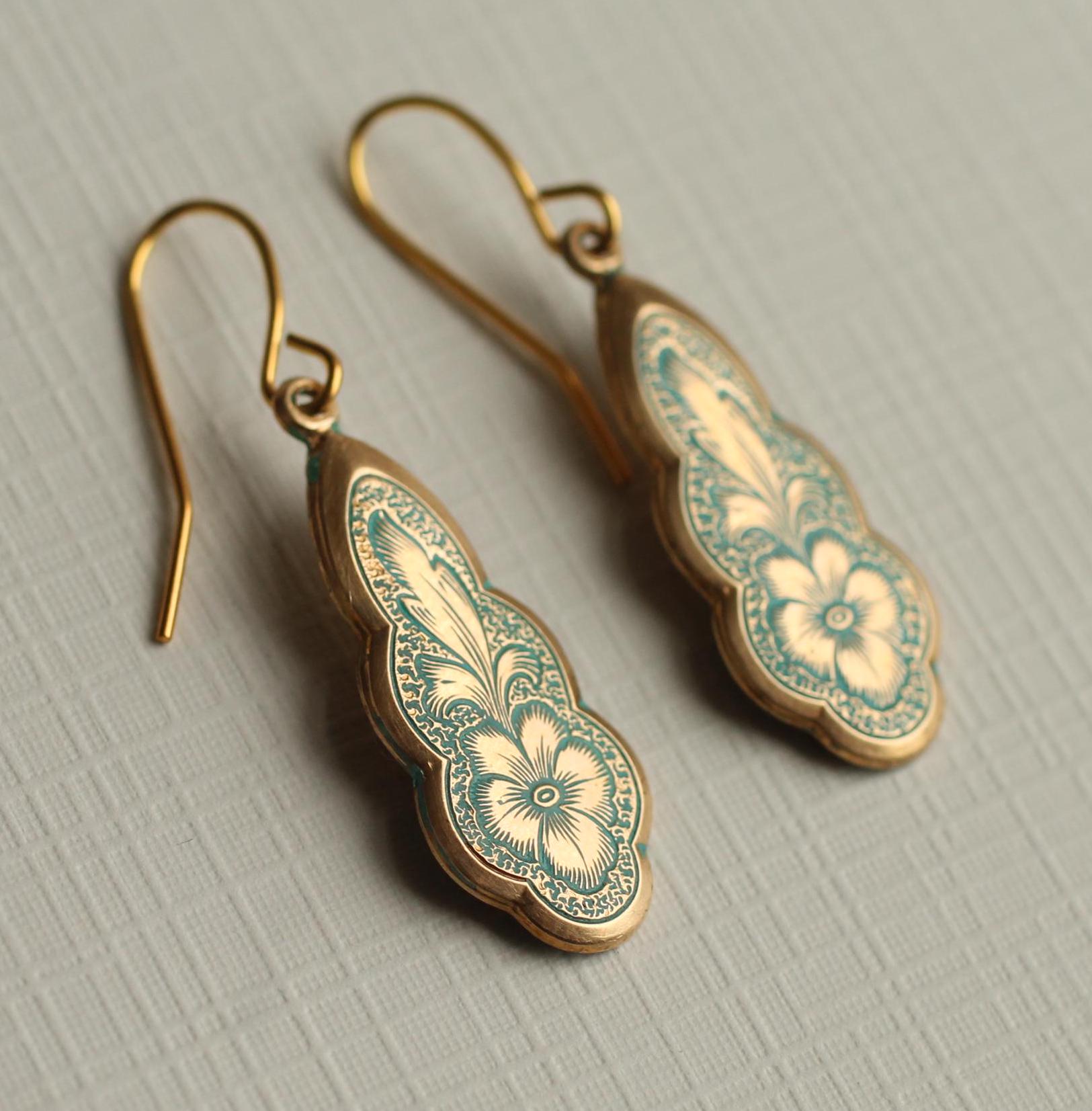 The earring wire is made of gold-plated brass, these earrings measure 35mm (a little over an inch) in length, and the floral pendant is designed to hang just below the earlobe. There are also precious metal earrings available made of gold-plated sterling silver.