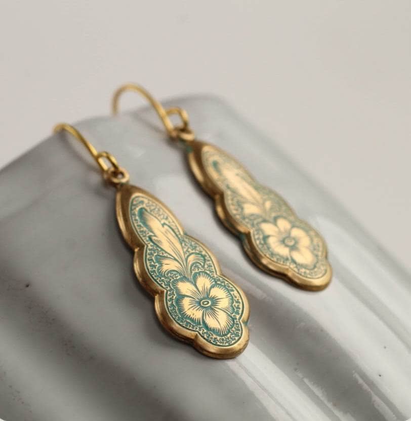 These beautiful earrings are made of solid brass and feature a filigree floral motif. The sinuous and intricate botanical carvings remind us of classic Art Nouveau designs.