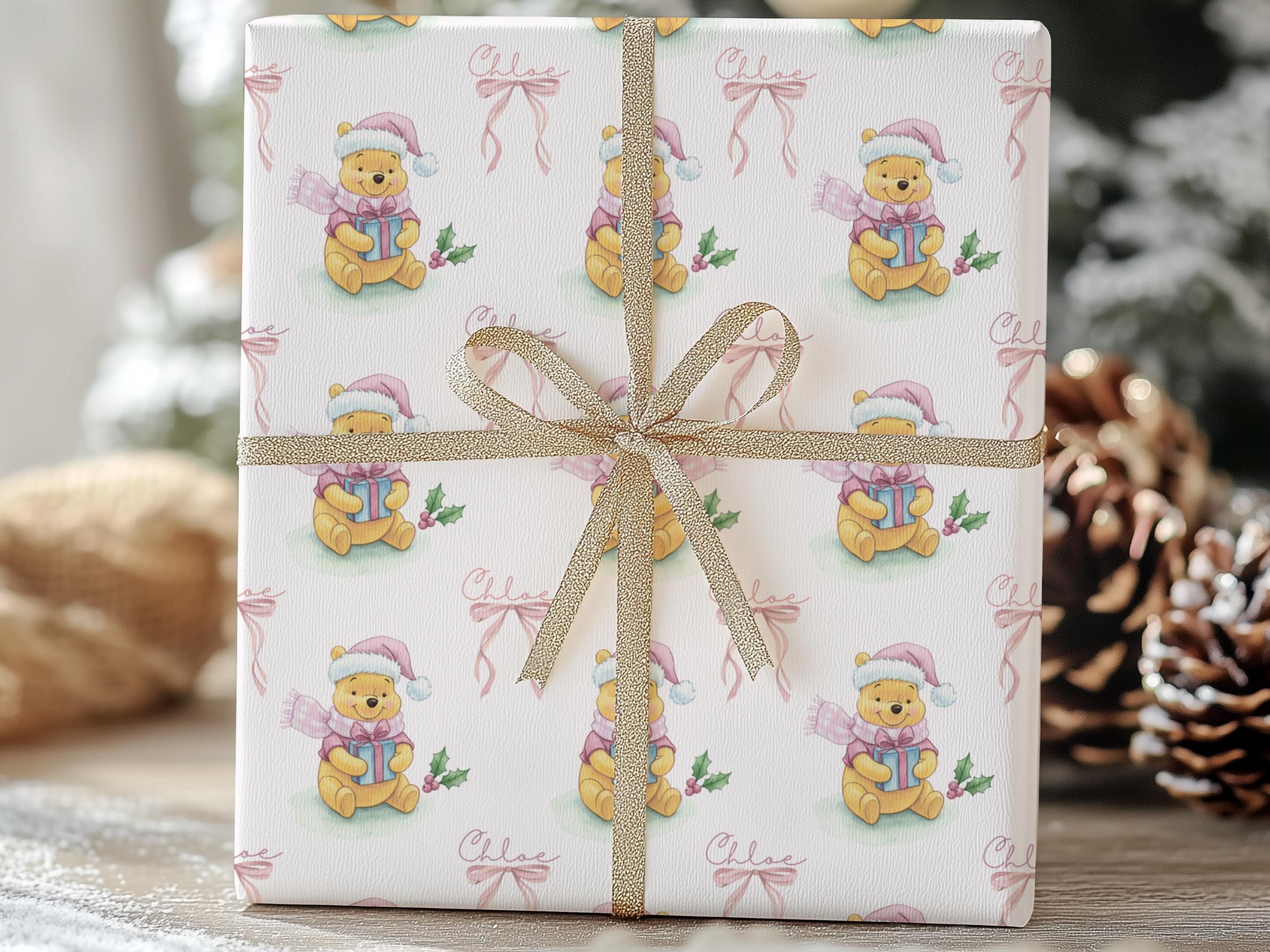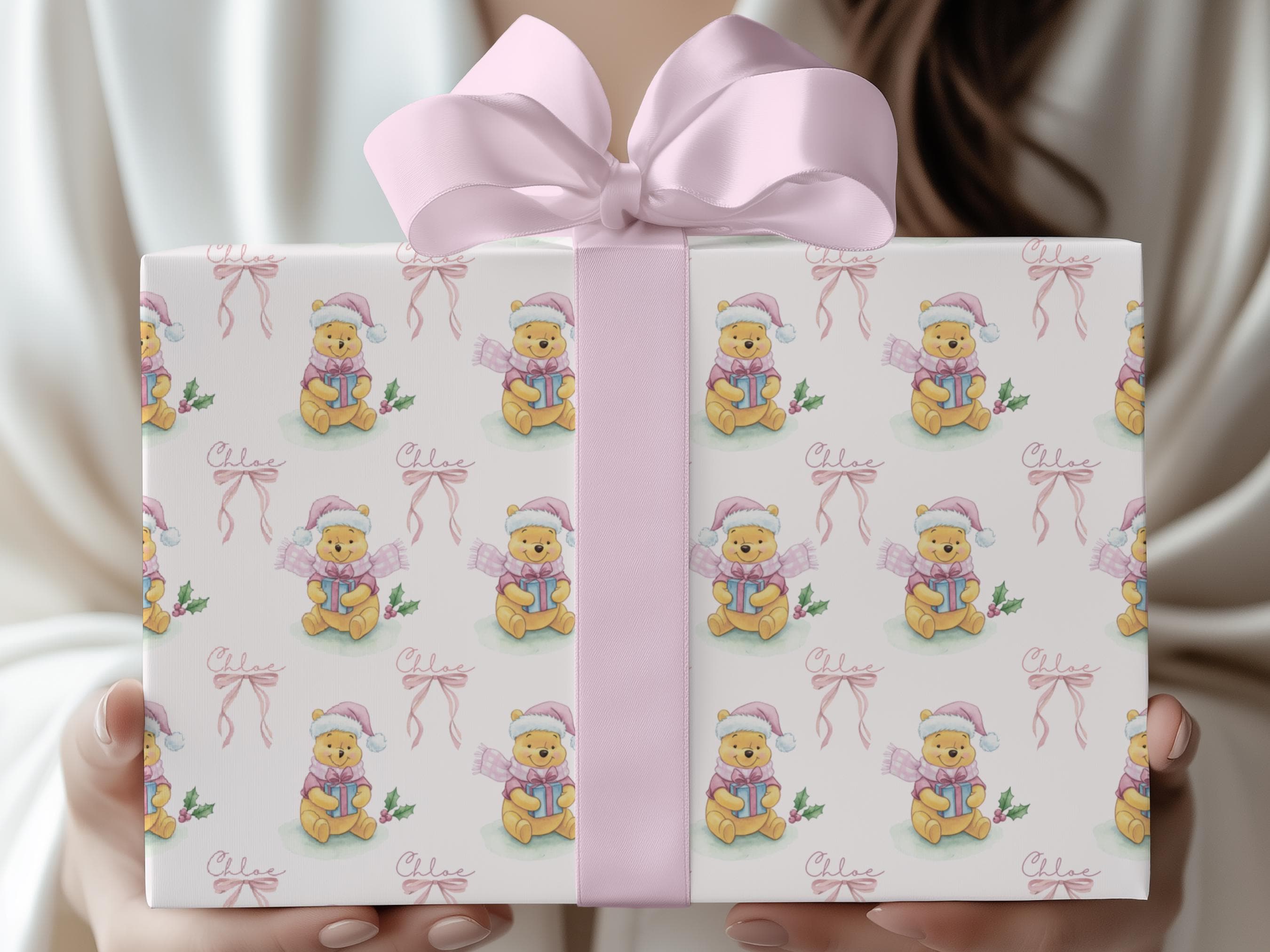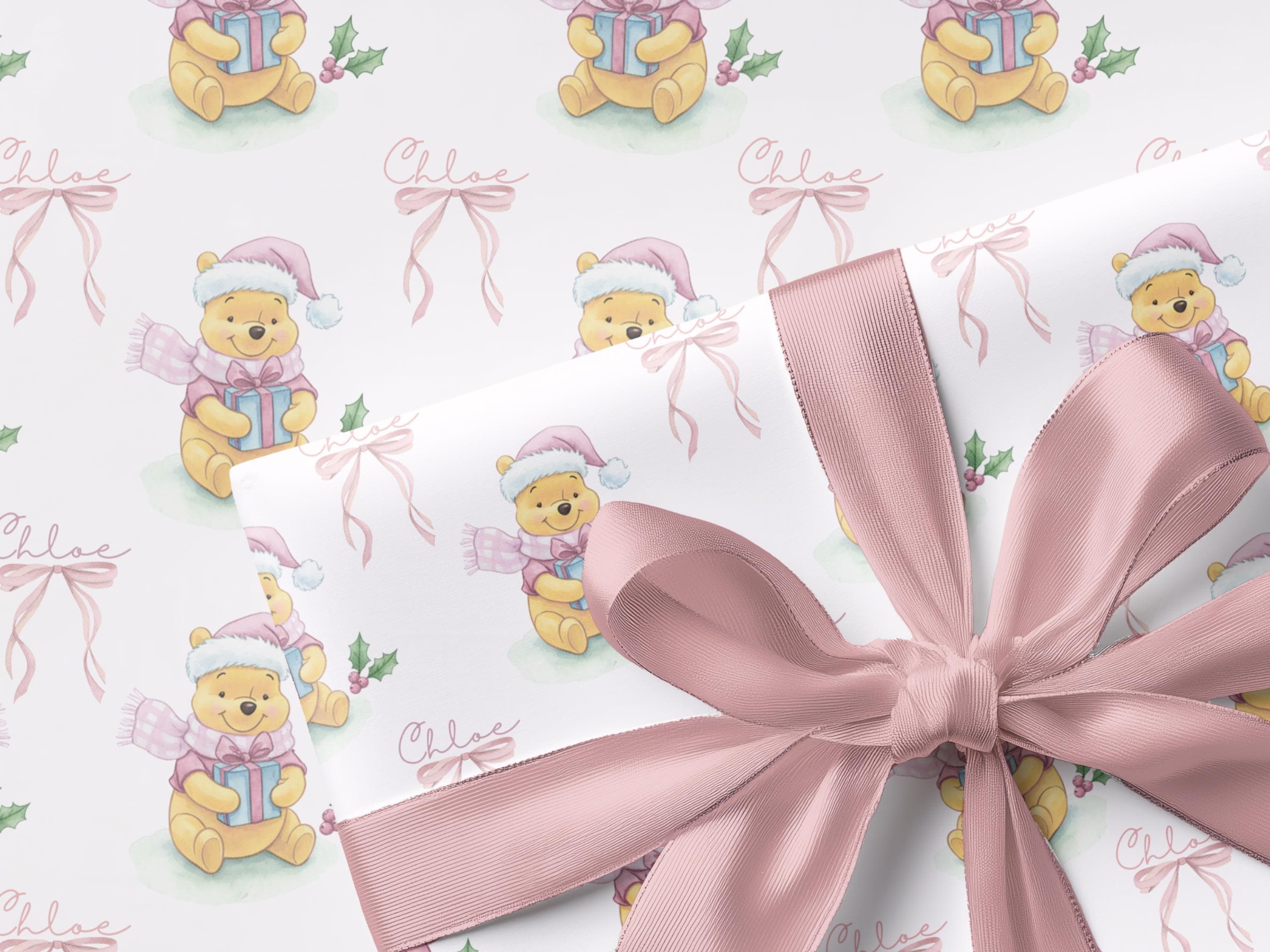 Winnie the Pooh Pink Christmas Gift Wrap - Elegant Personalized Gift for Girls - This fun and whimsical Winnie the Pooh wrapping paper makes every gift feel extra special, perfect for Christmas.