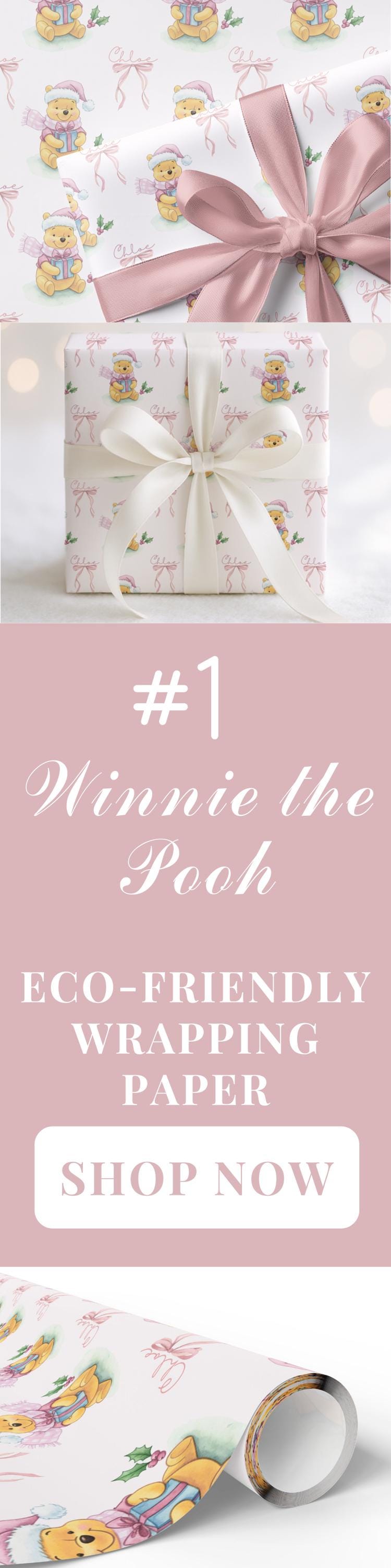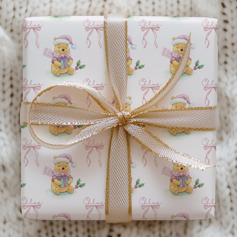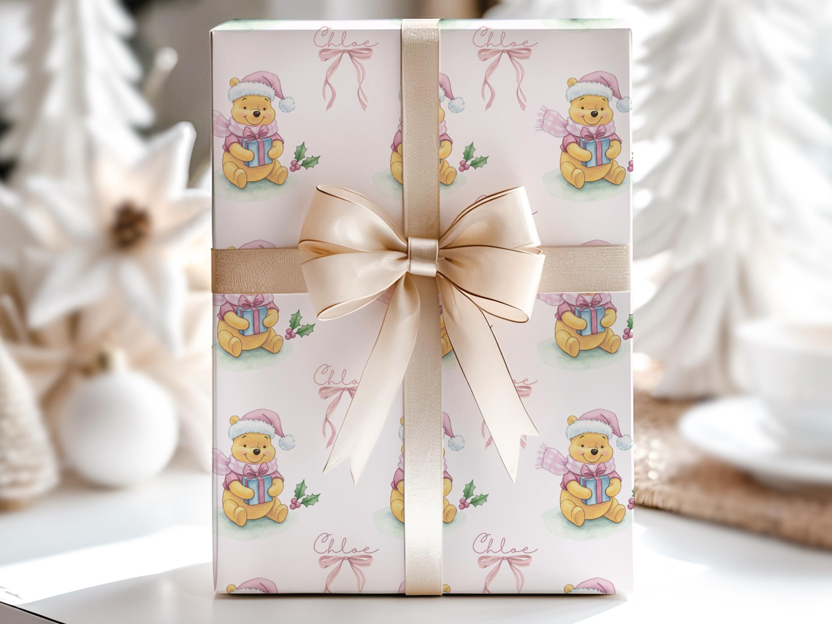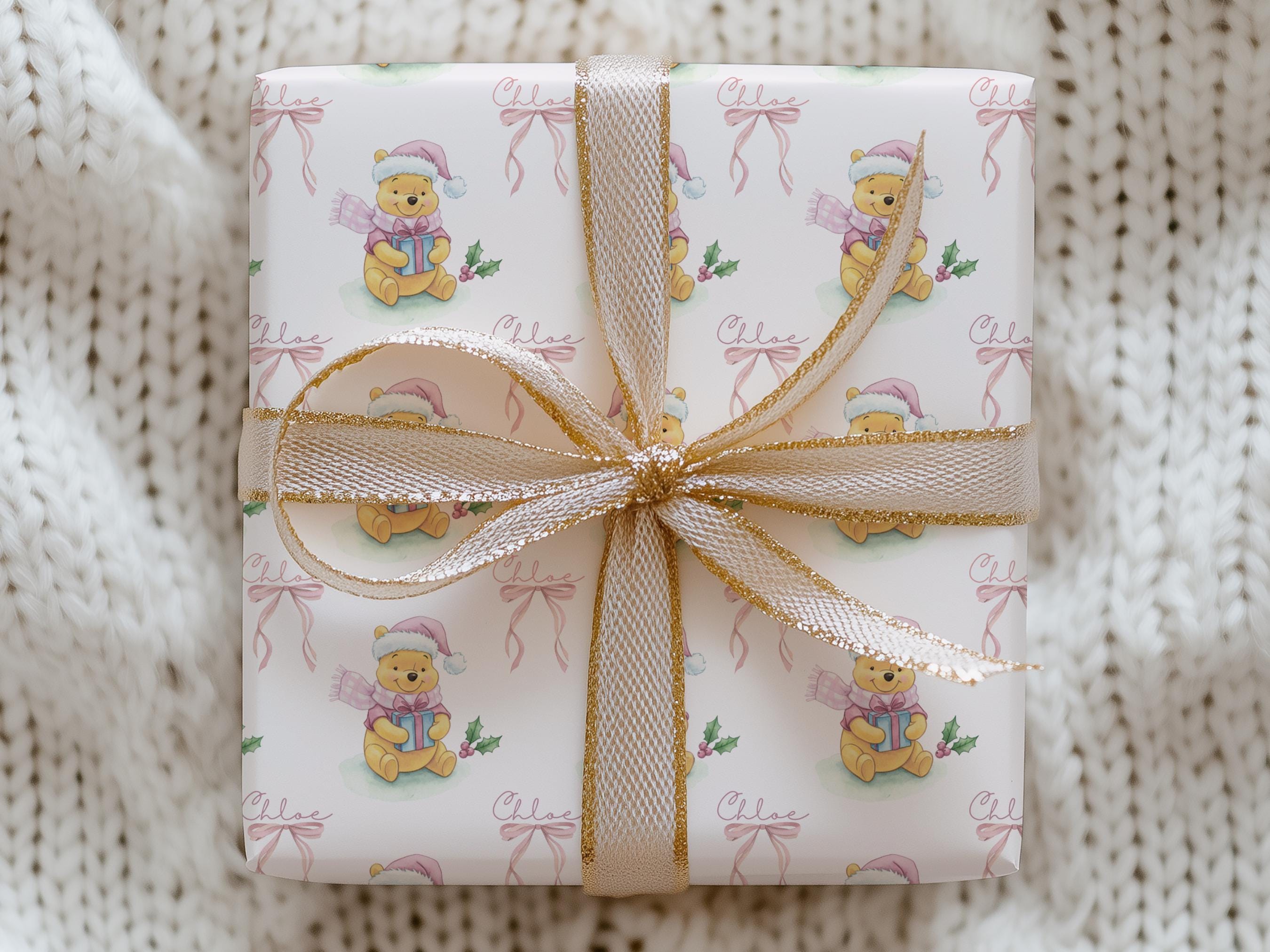Winnie the Pooh Pink Christmas Gift Wrap - Elegant Personalized Gift for Girls - This fun and whimsical Winnie the Pooh wrapping paper makes every gift feel extra special, perfect for Christmas.